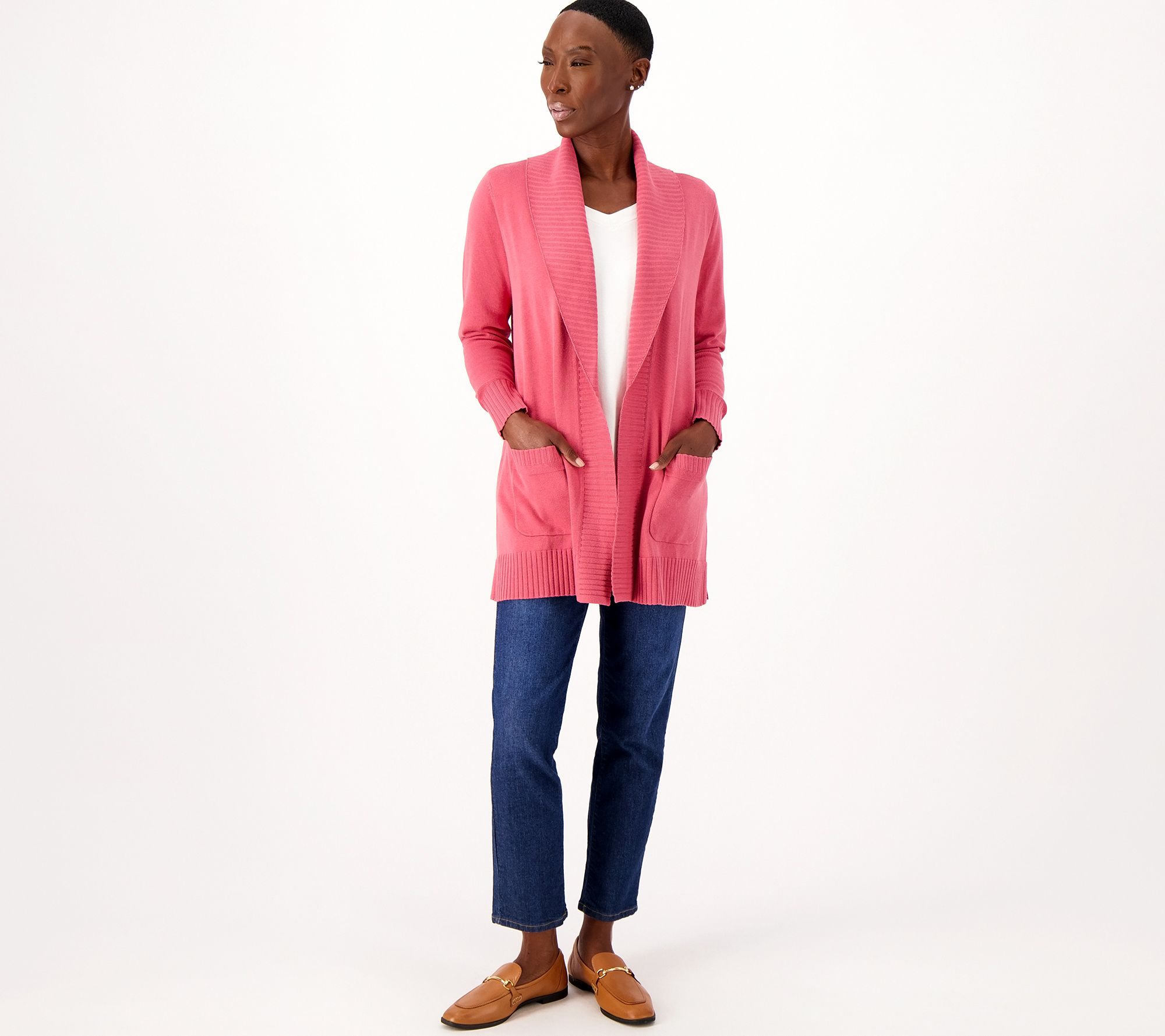 Comfort at its finest, this chic cardigan features pockets (yay!) and a shawl collar that bring fashionable flair and functionality to this stylish sweater. From Isaac Mizrahi Live!TM.