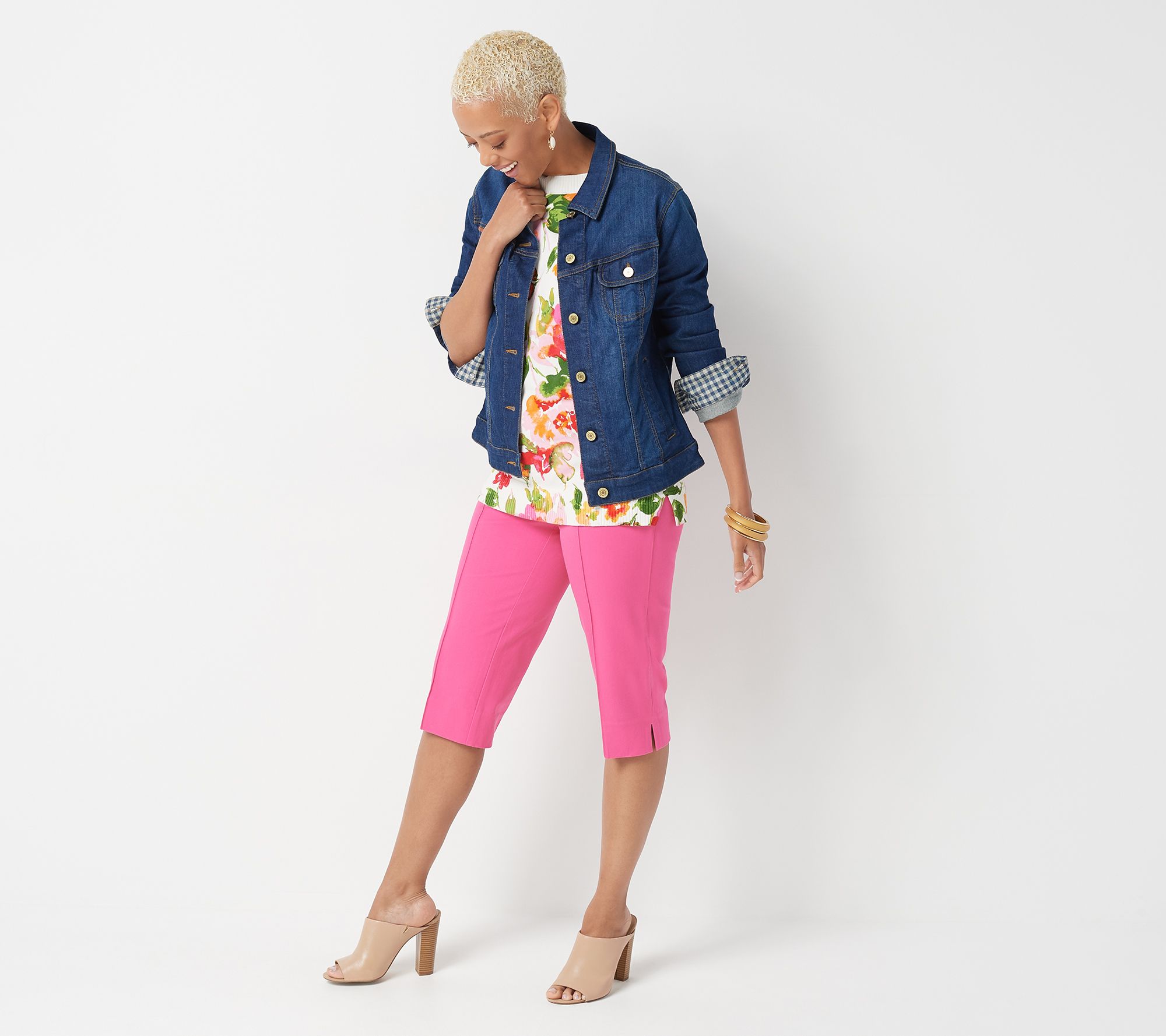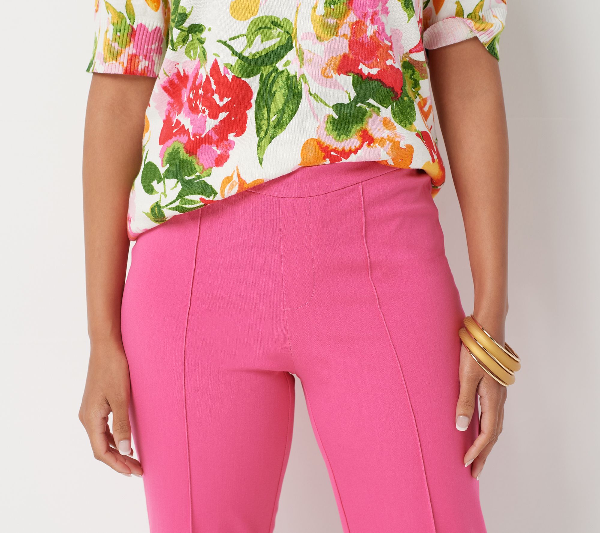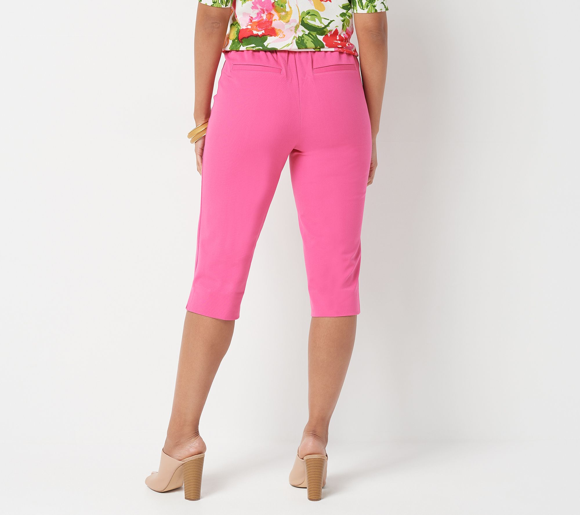 Hello, spring. Get ready to refresh your look -- because these 24/7 Stretch pedal pushers are made for pairing with breezy blouses and warm-weather tanks. Their slim silhouette is just the right length for the transitional season, with a pintuck on the center of the front leg and side slits for a flattering fit. From Isaac Mizrahi Live!TM.