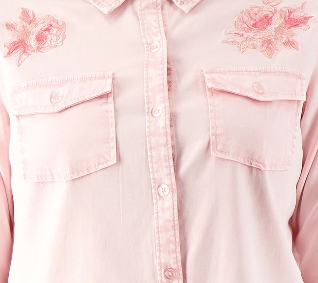 • Features: shirt collar, button-front placket, long sleeves, button closure with sleeve vent, chest patch pocket with button-closure flap, curved hem