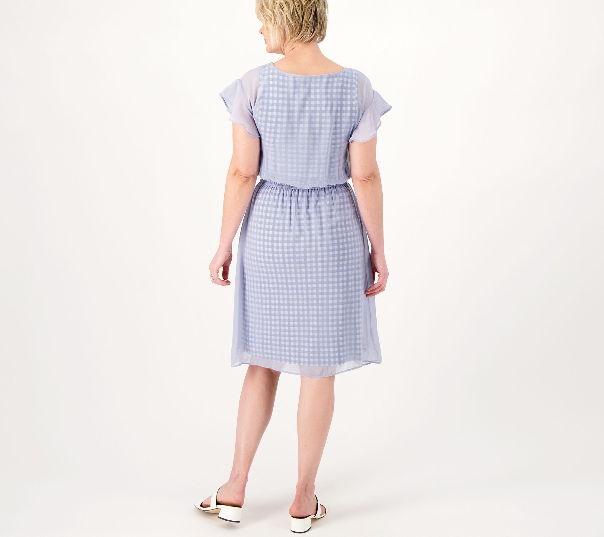 • Features: allover print, boat neckline, flutter sleeves, self-knit waistband with encased elastic, swing hemline