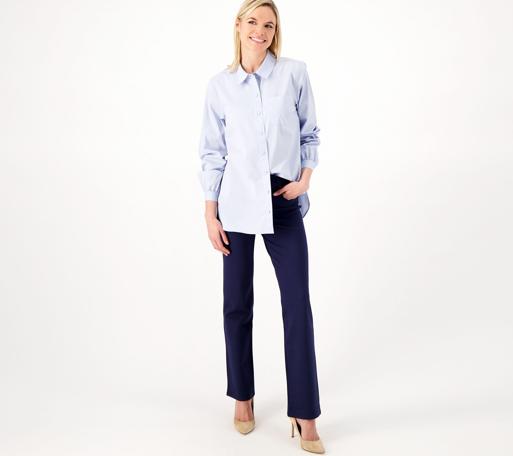 Not just for big-time meetings in the board room, this snap-front tunic can be paired with jeans and heels for a low-key yet stylish night out. From Isaac Mizrahi Live!TM.