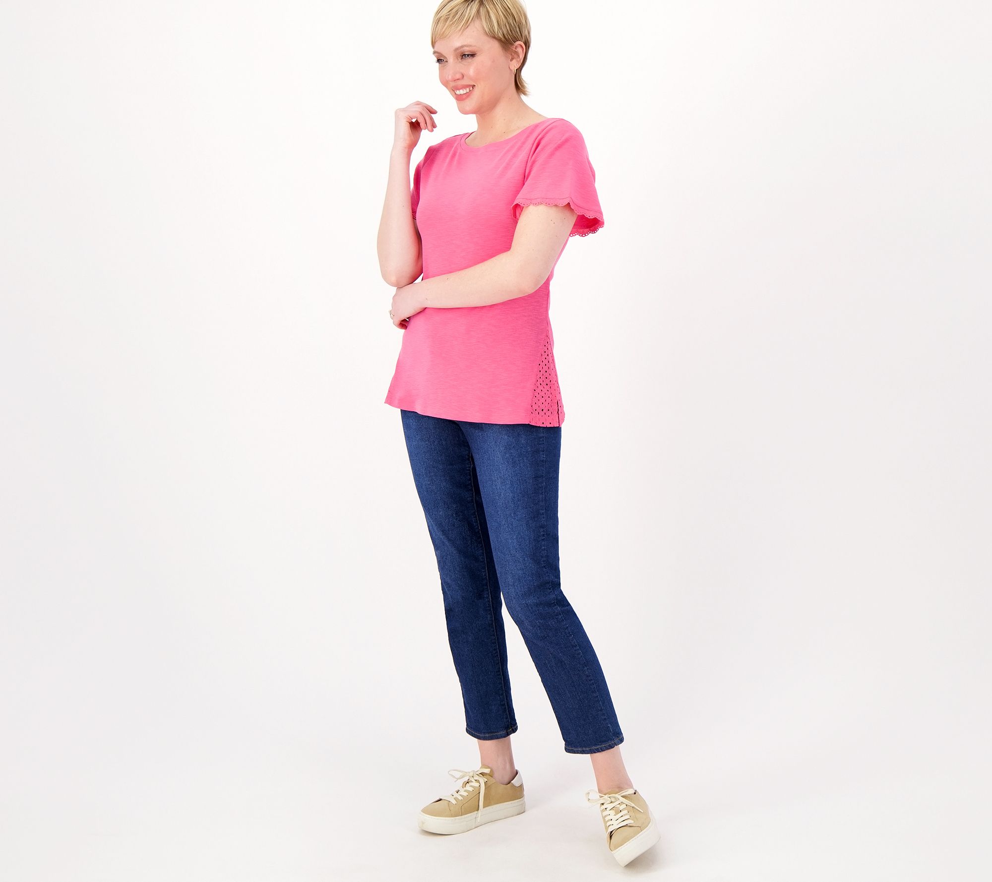 Sometimes you want a top that's simple, but special. With eyelet insets, lace trim, and flutter sleeves, this slub jersey top fits the bill. From Isaac Mizrahi Live!TM.