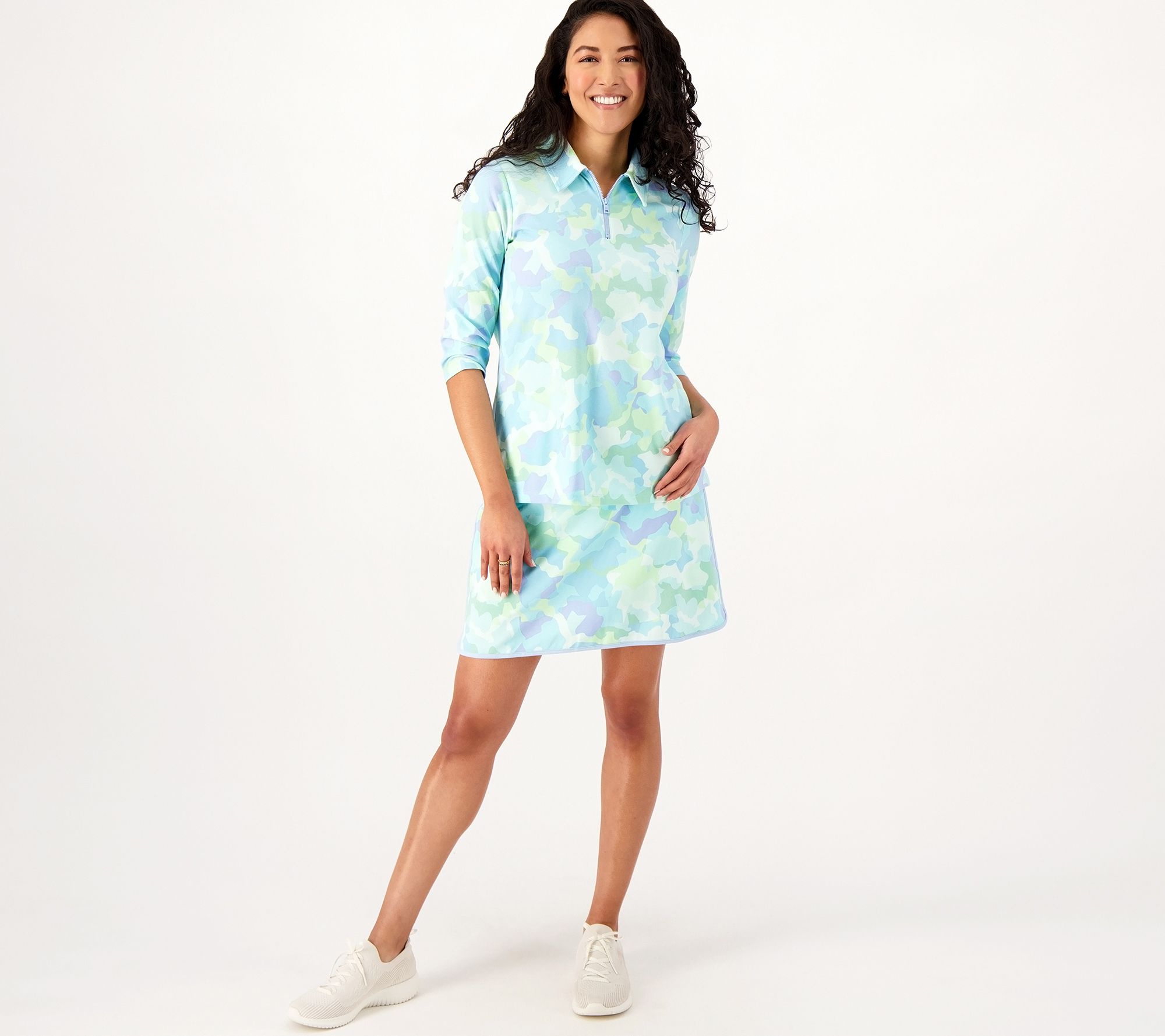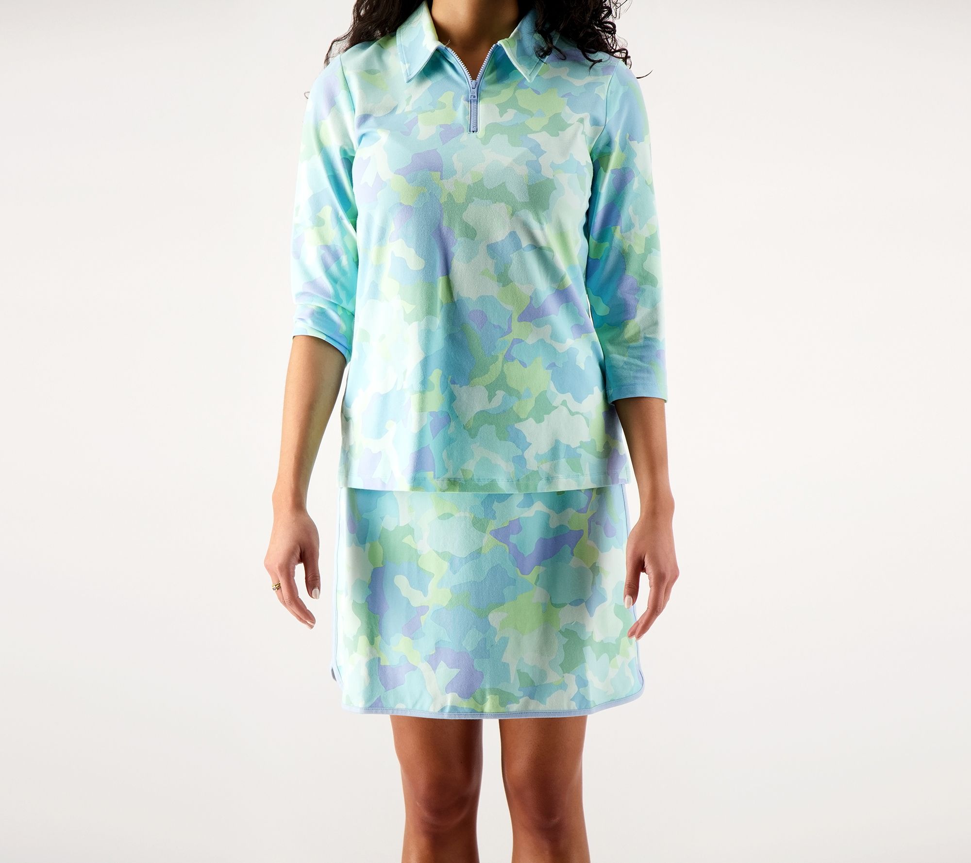 • Features: camo print, half-zip closure, polo collar, 3/4-length sleeves, side slits