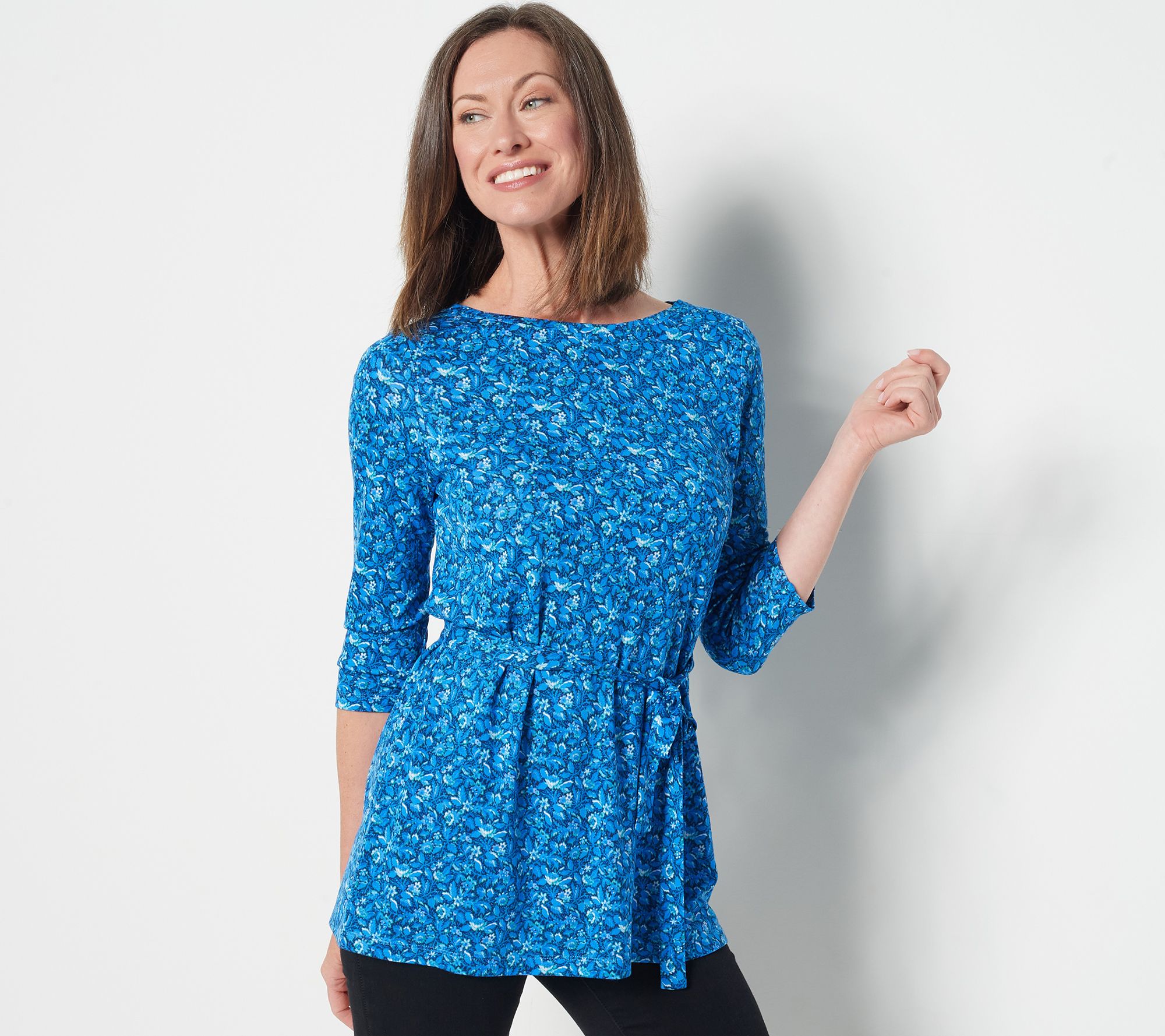 The self-tie at the waist of this pretty top screams "polished professional." Have no fear, though, the allover-print is anything but plain. From Isaac Mizrahi Live!TM