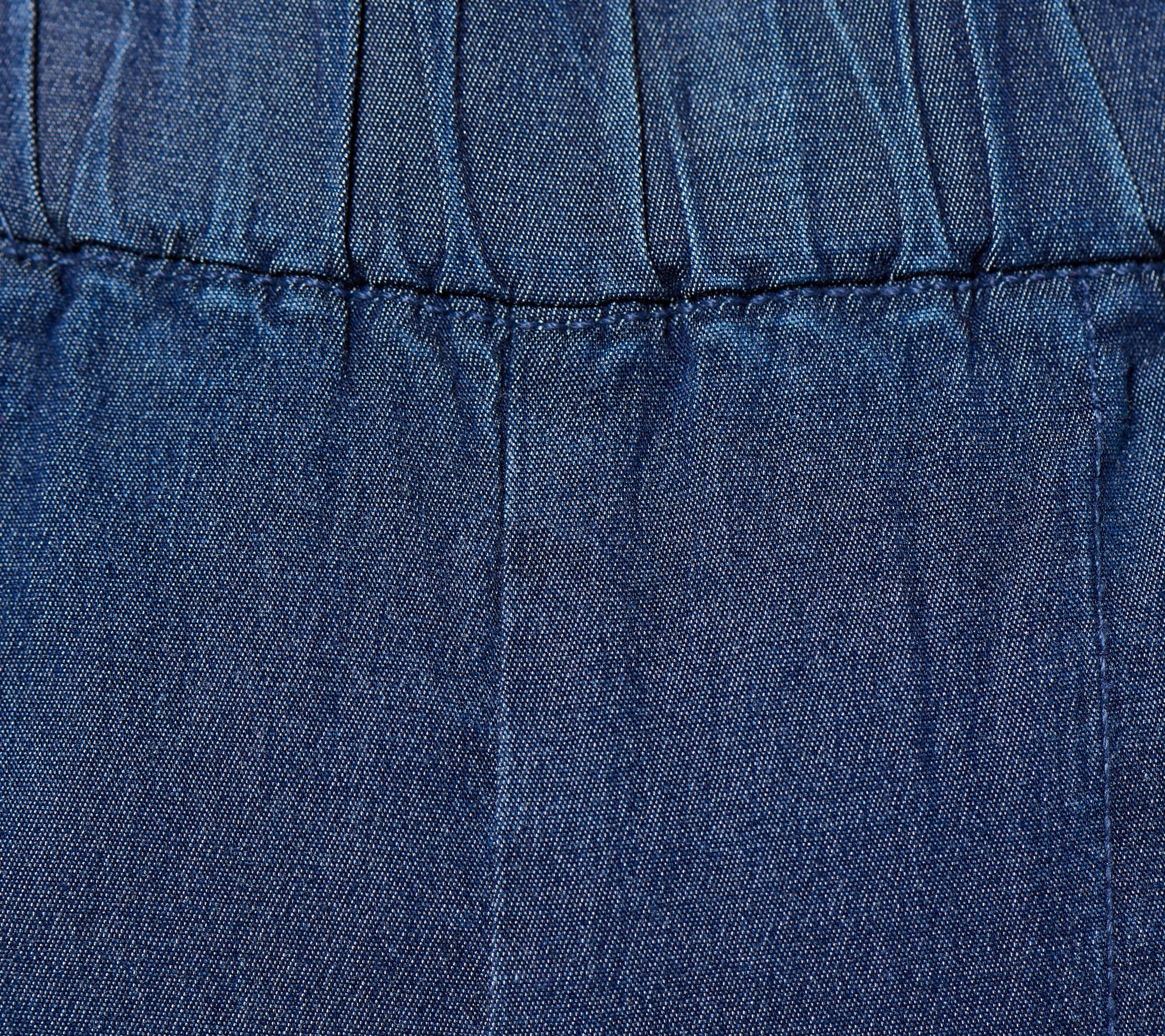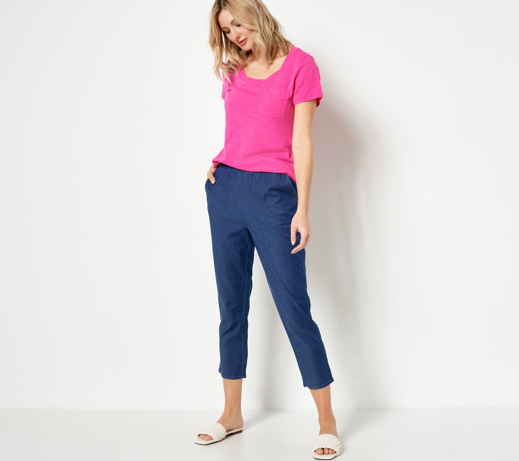 • Features: pull-on style; foldover waistband with encased elastic; slash pockets; crop length