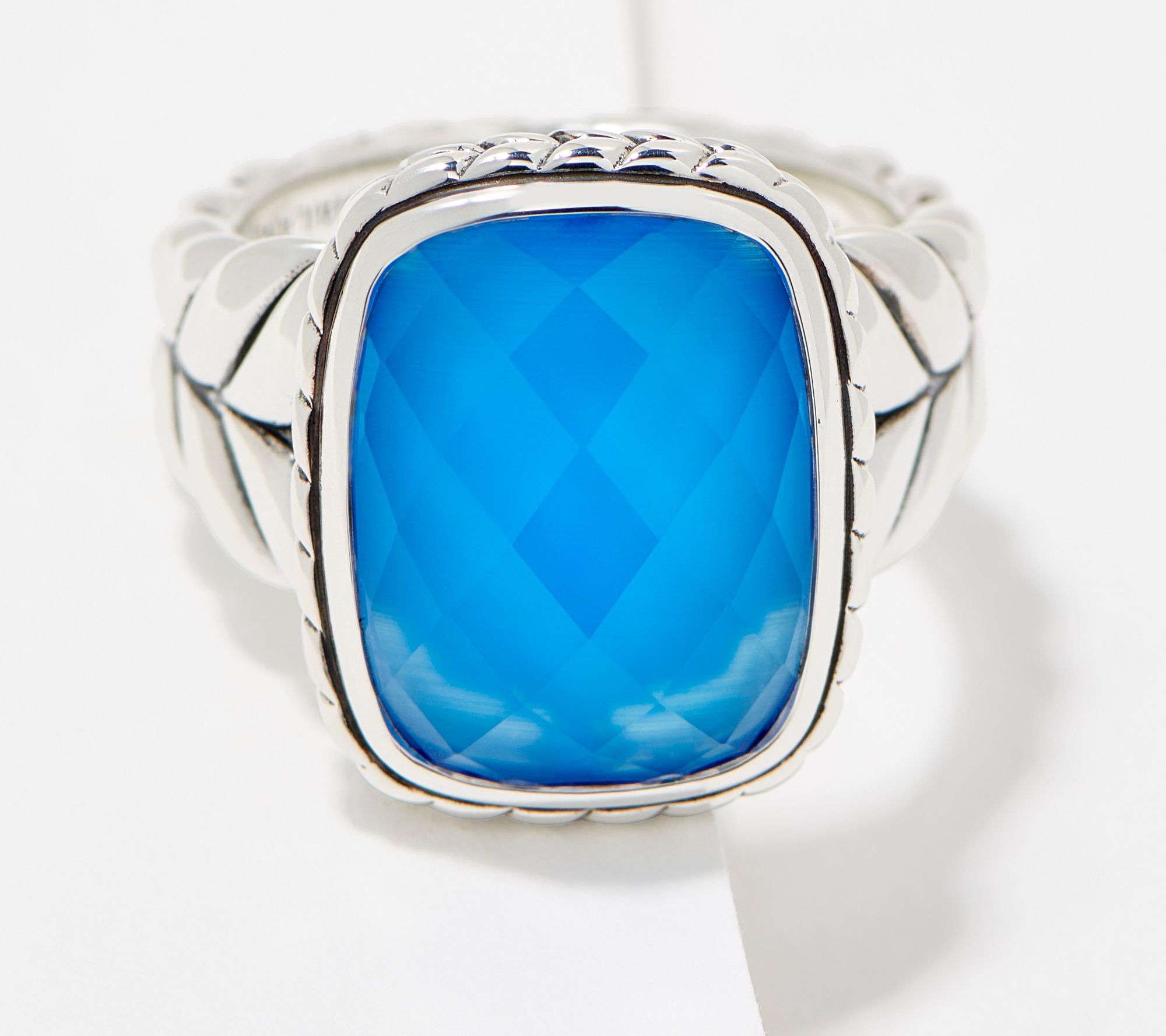 Glam meets modern-boho with this gorgeous ring, complete with a cushion-cut faceted doublet and gemstone bottom and a stylish basket-weave texture on the tapered shank and bezel. From JAI.