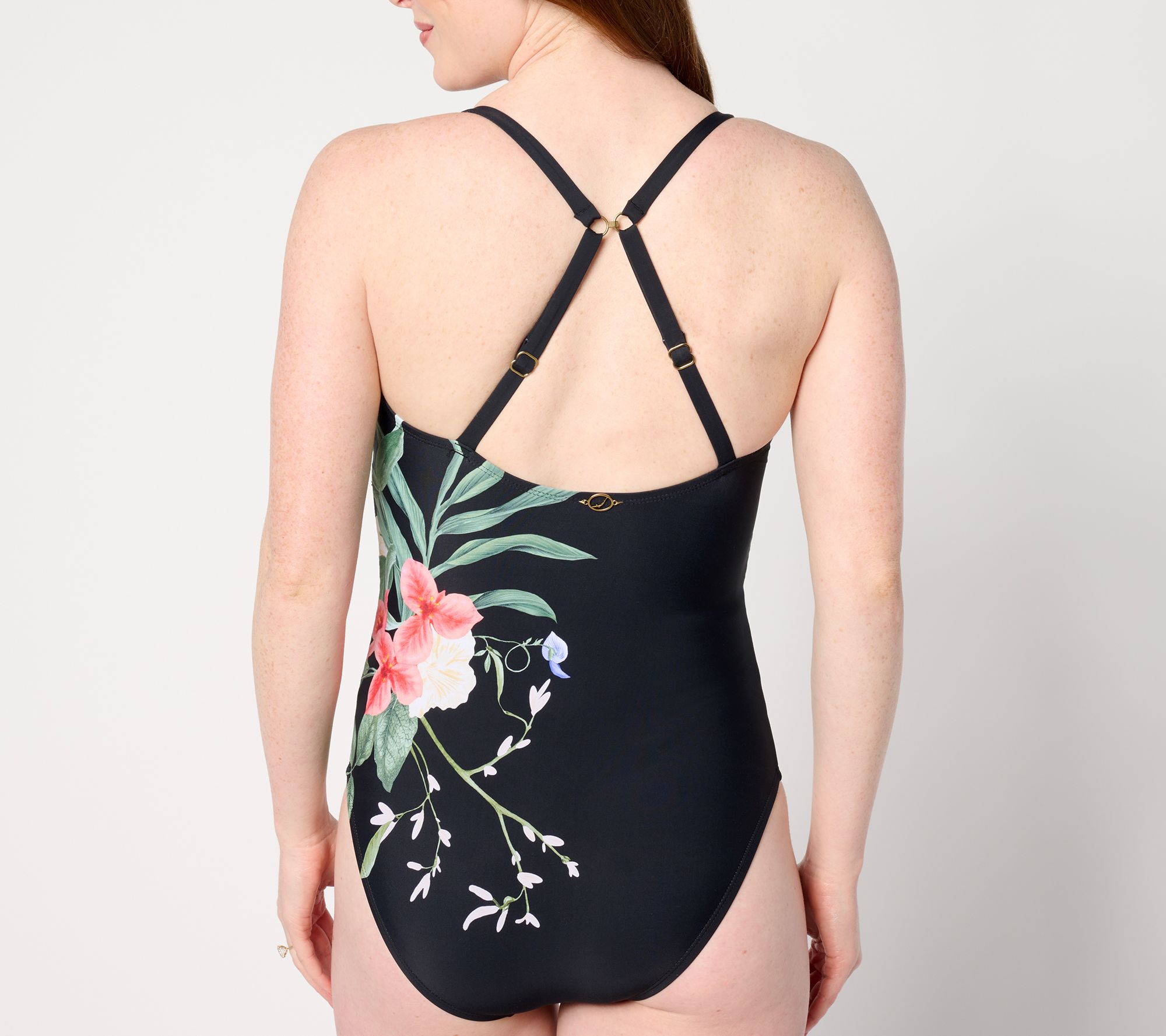 • Features: one-piece, adjustable shoulder straps, shelf bra with underwire, removable bra cups, twist back detail, silhouette-smoothing stomach panel, center-front shirring