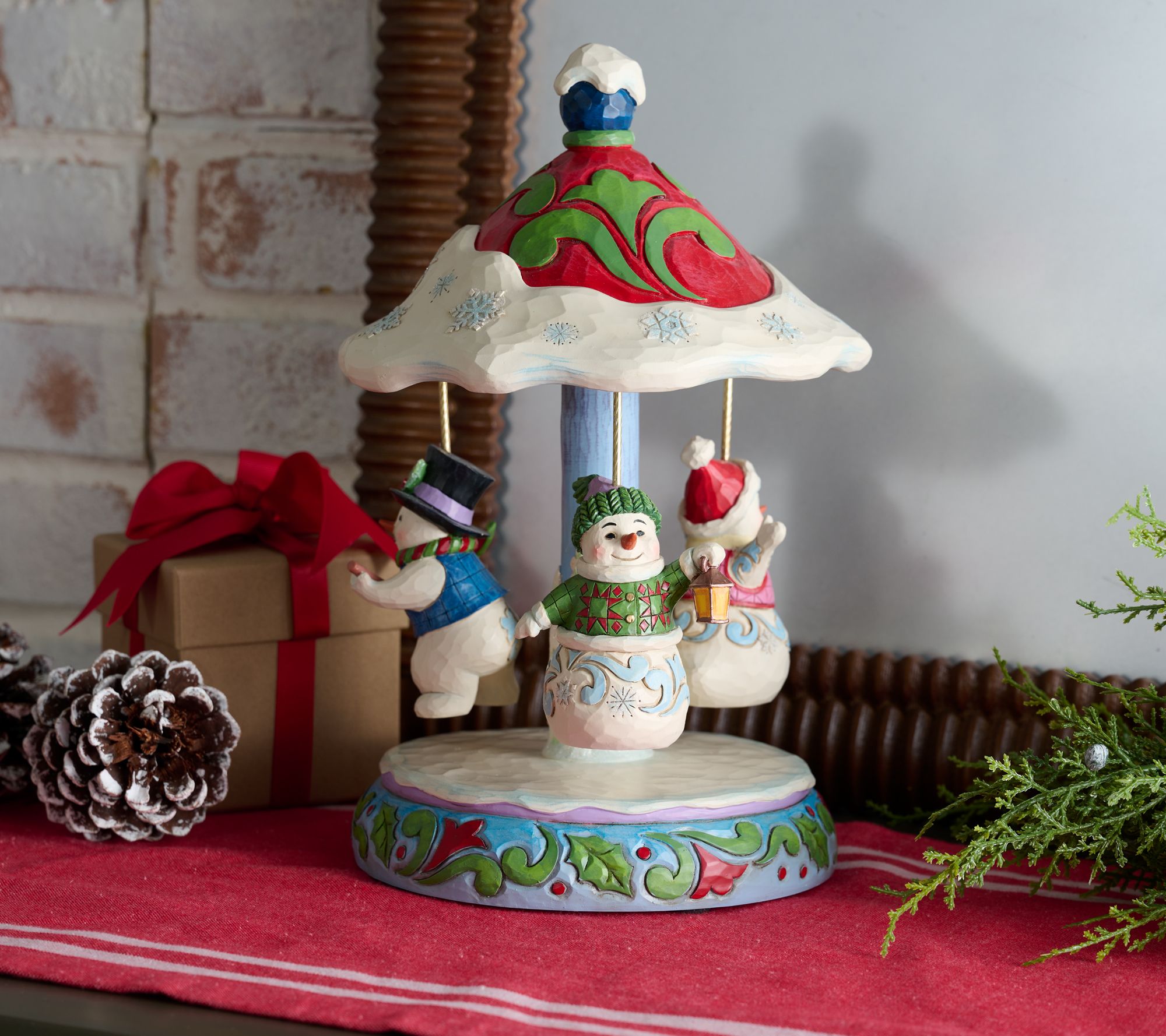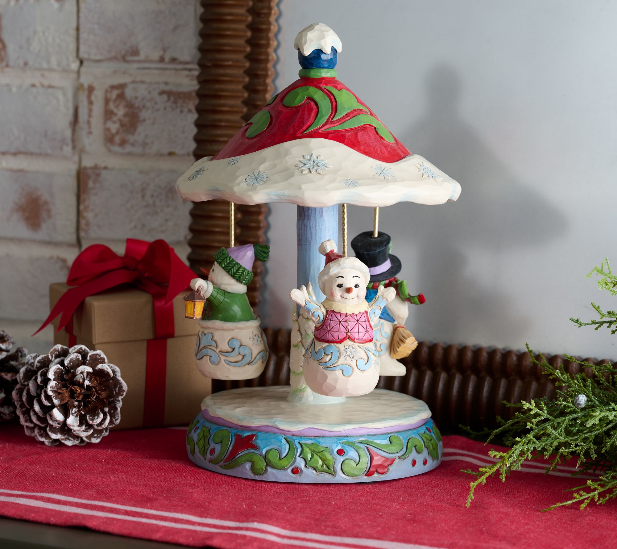 Festive gatherings take on new whimsy whenever this handpush carousel brings snow friends into motion. Watch as finely detailed figures dressed in cozy scarves and hats spin around, filling the air with a dash of nostalgia and playful spirit that guests of all ages will love. Display it near the tree or on a favorite holiday shelf for a charming scene you'll look forward to each season. From the Heartwood Creek Collection by Jim Shore.