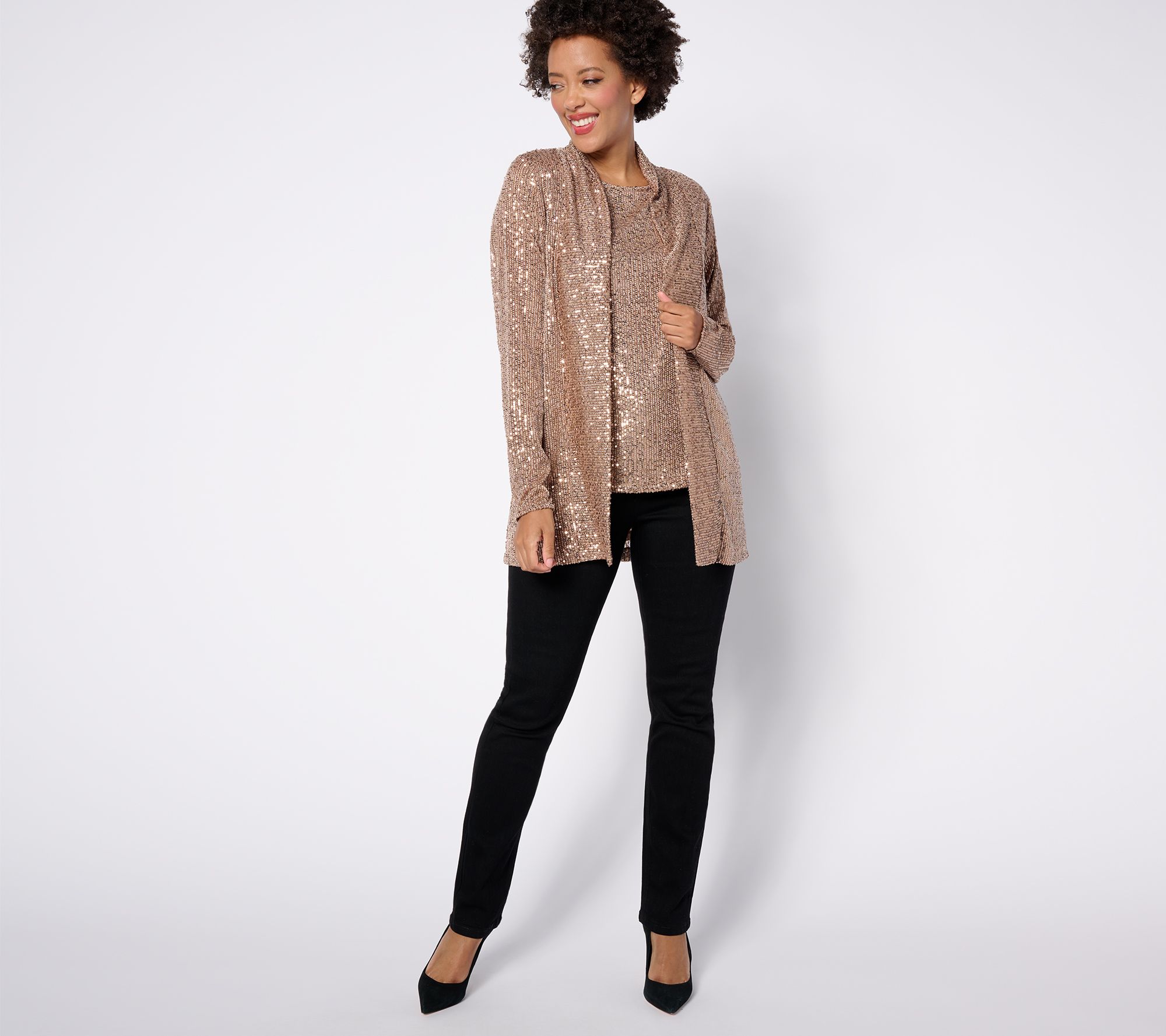 • Features: allover sequins, long sleeves, open front, shawl collar, straight bottom hem