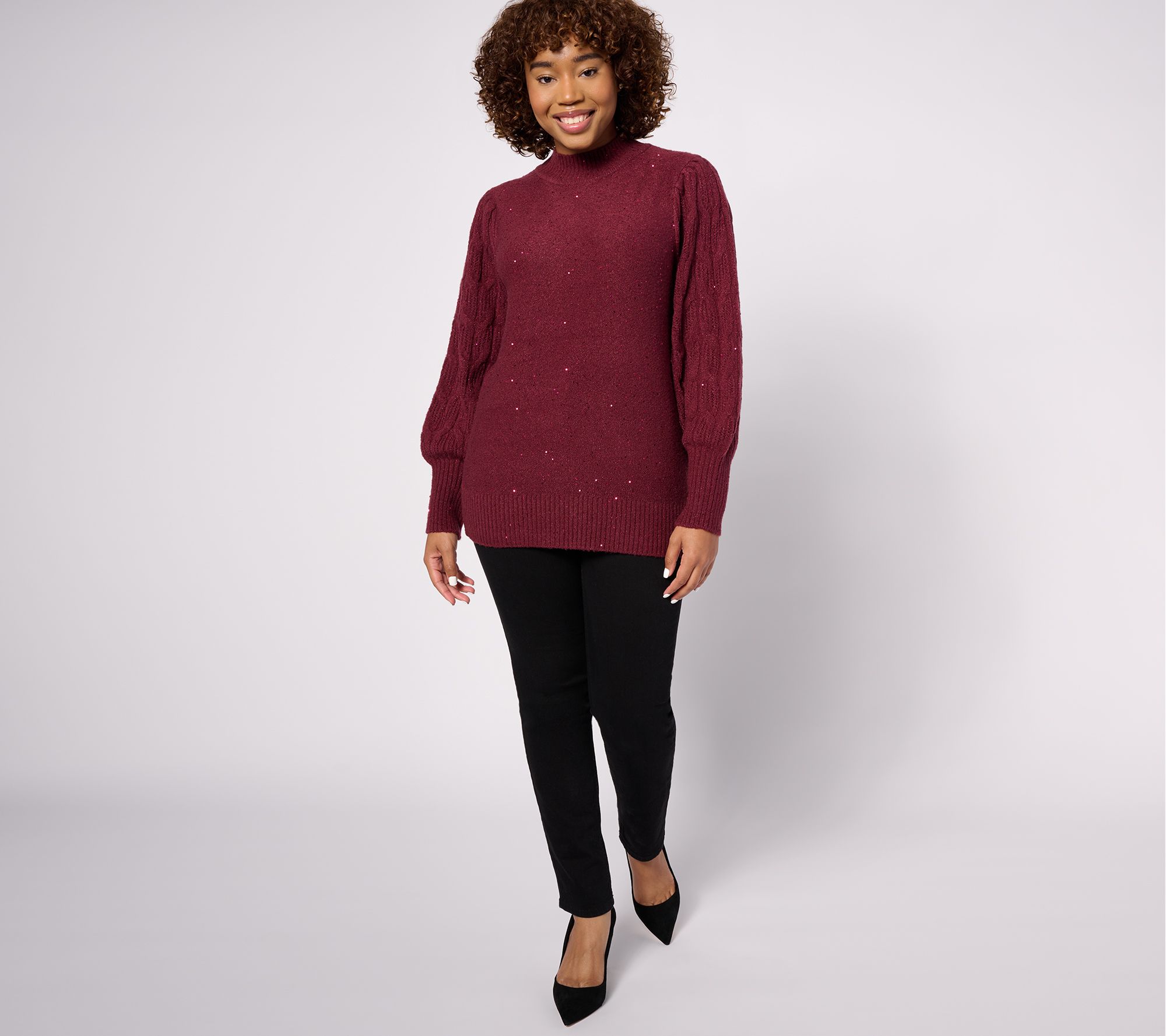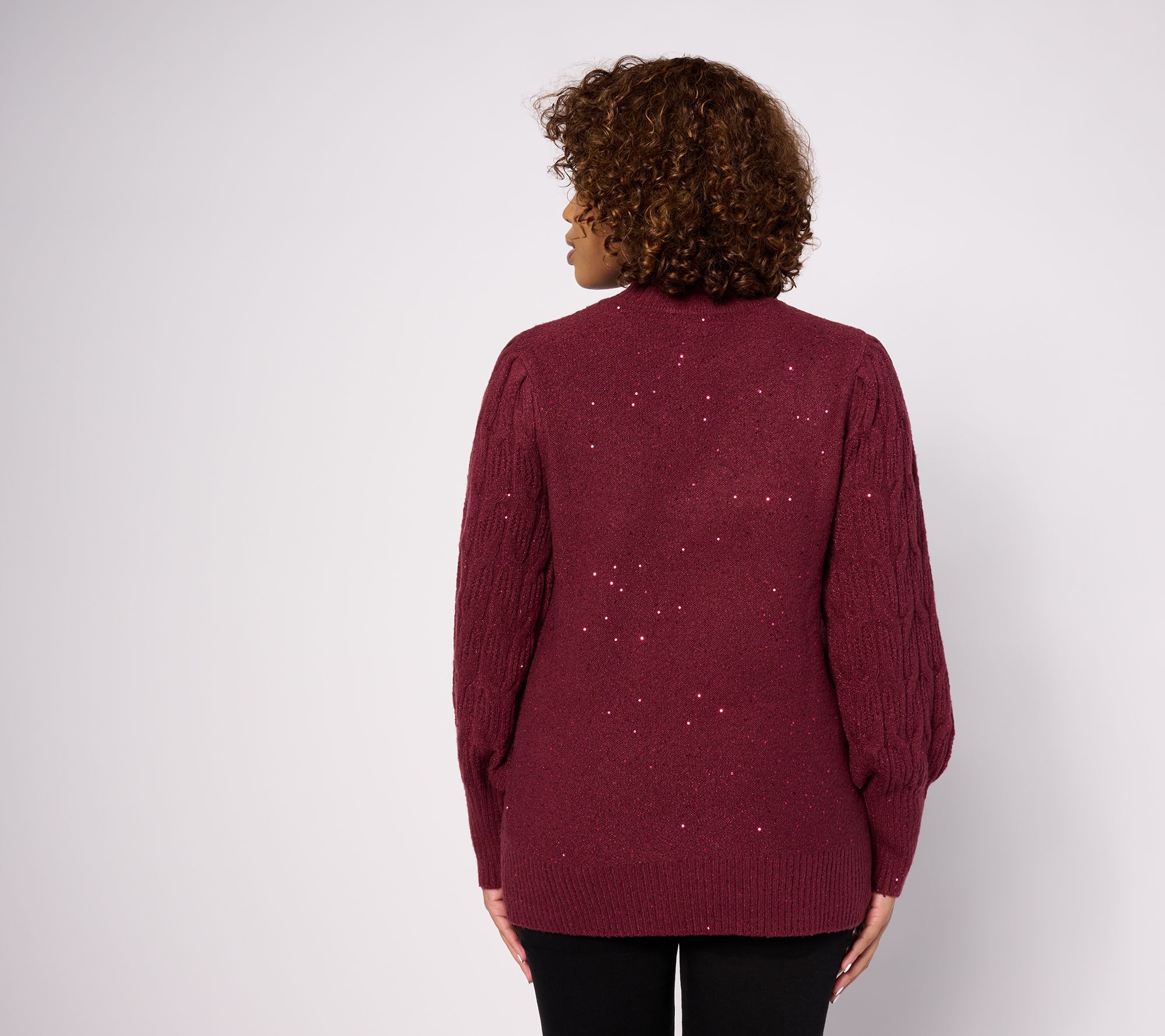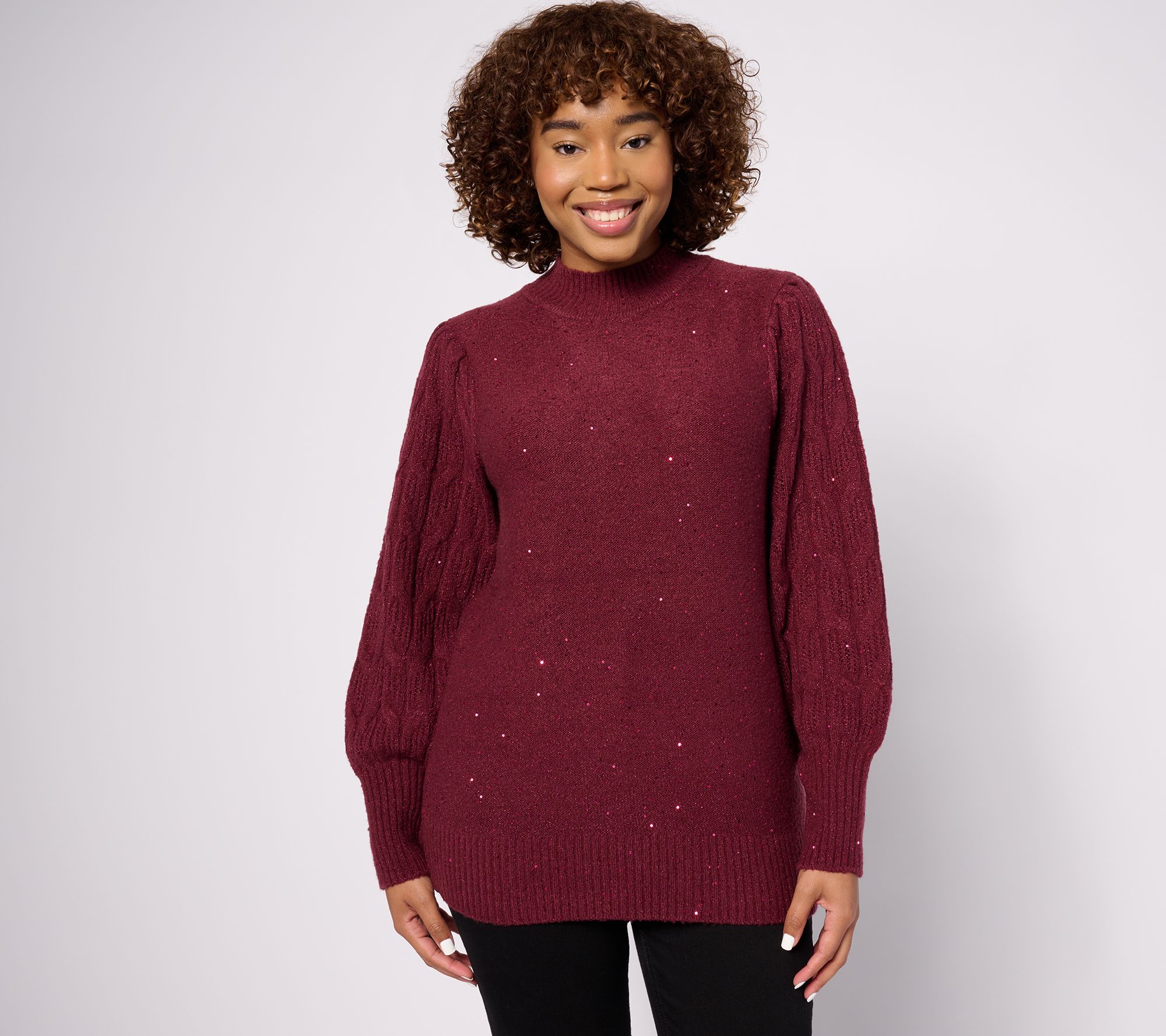 • Features: mock neckline, sequins, long cable-knit sleeves with ribbed cuff, straight hem with ribbed bottom band