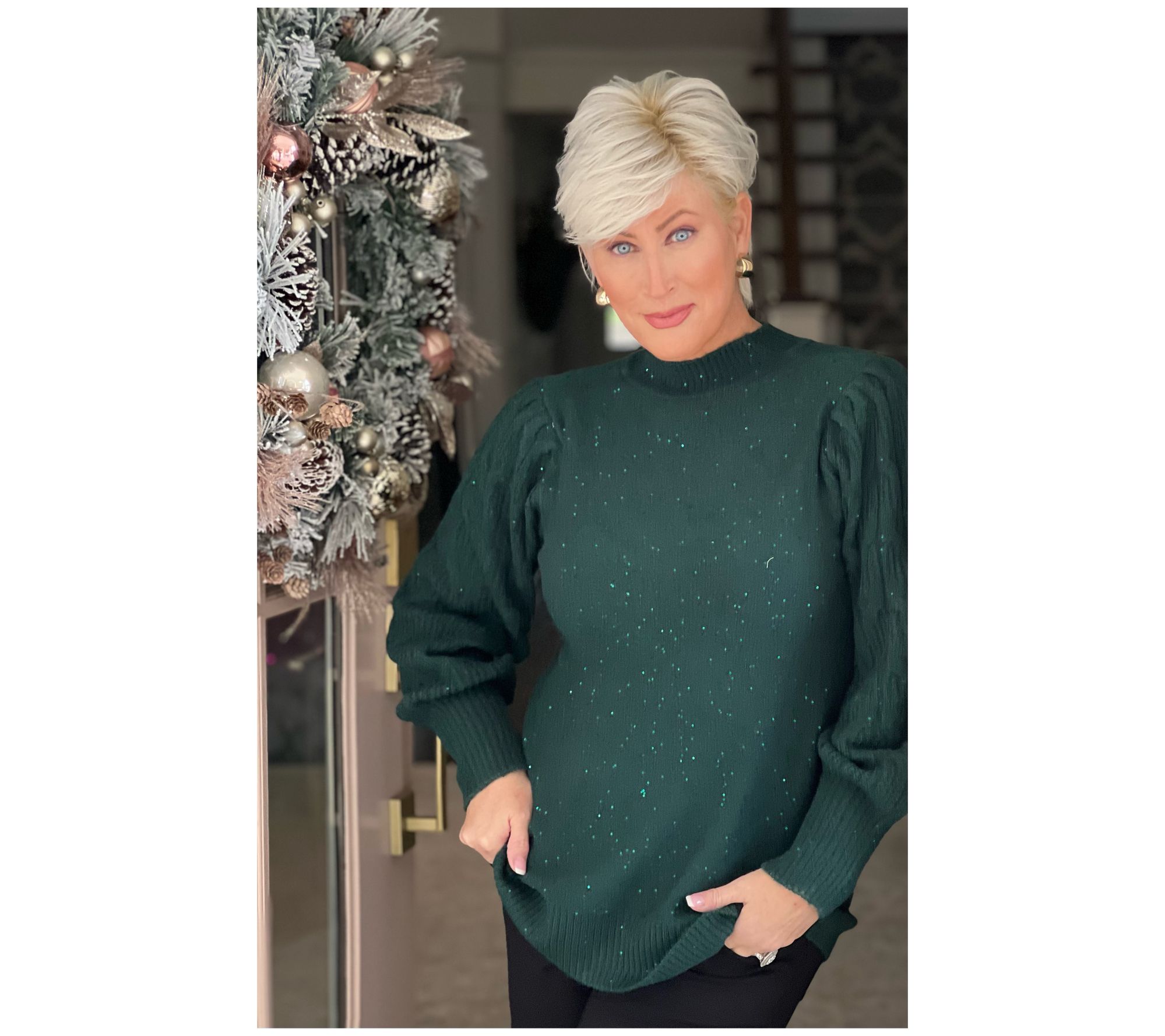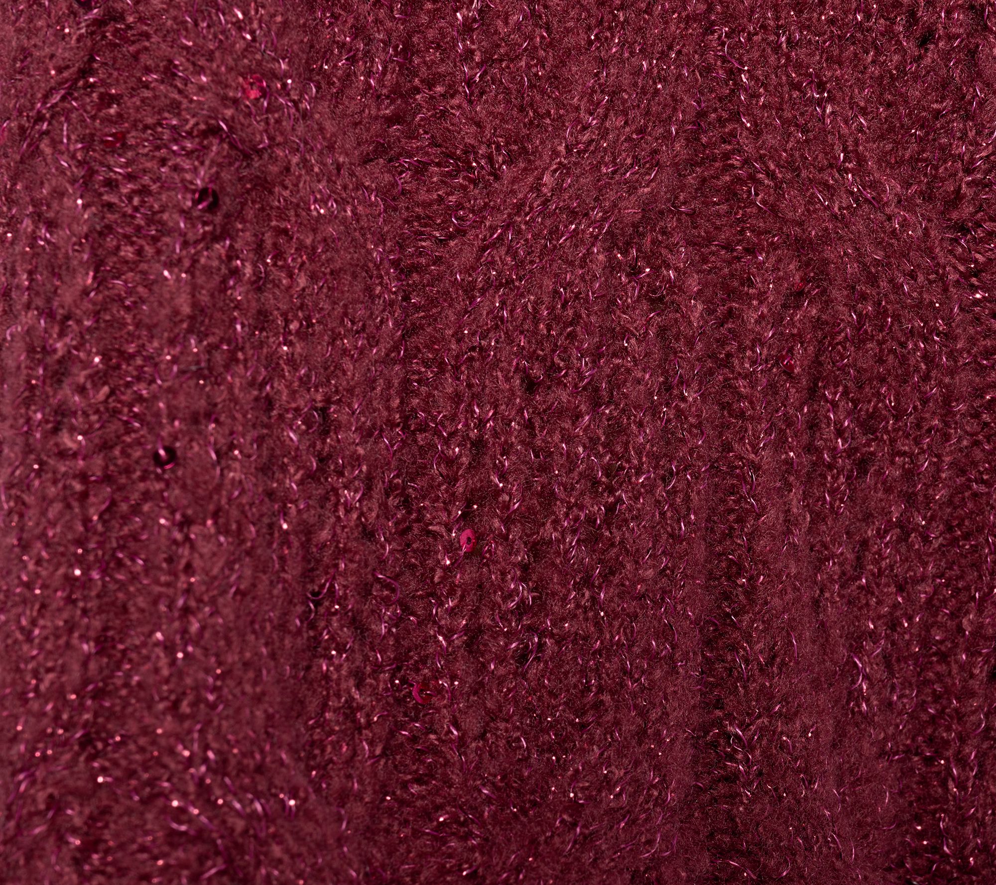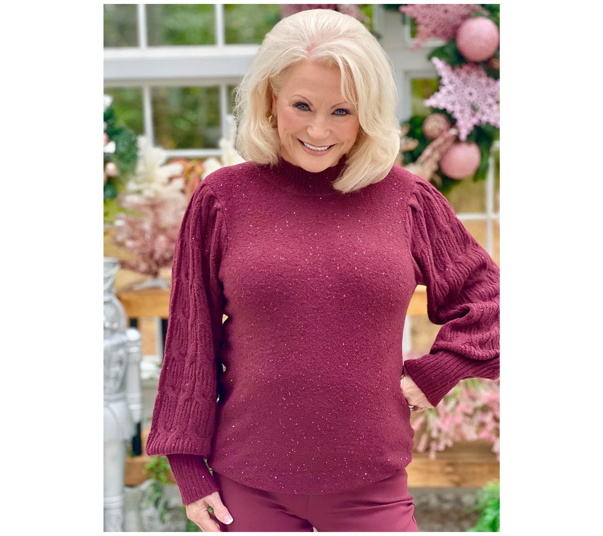 • Features: mock neckline, sequins, long cable-knit sleeves with ribbed cuff, straight hem with ribbed bottom band