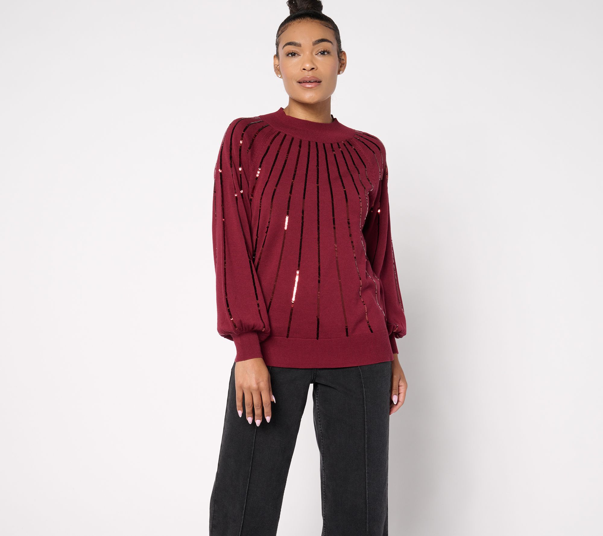 Don't just walk in -- Arrive! Radiate with scene-stealing style when you enter the room wearing this sequinned mock neck sweater from Kim Gravel's holiday capsule collection. You'll bring the glam with light-catching rows of gleaming starburst rays -- along with easy elegance thanks to billowy blouson sleeves and a face-framing mock neck. Pair this stunner with denim or ponte knit for house parties or be the (jingle) belle of the ball in paillette-embellished pants or a billowy chiffon skirt. From Jingle Belles by Kim Gravel.