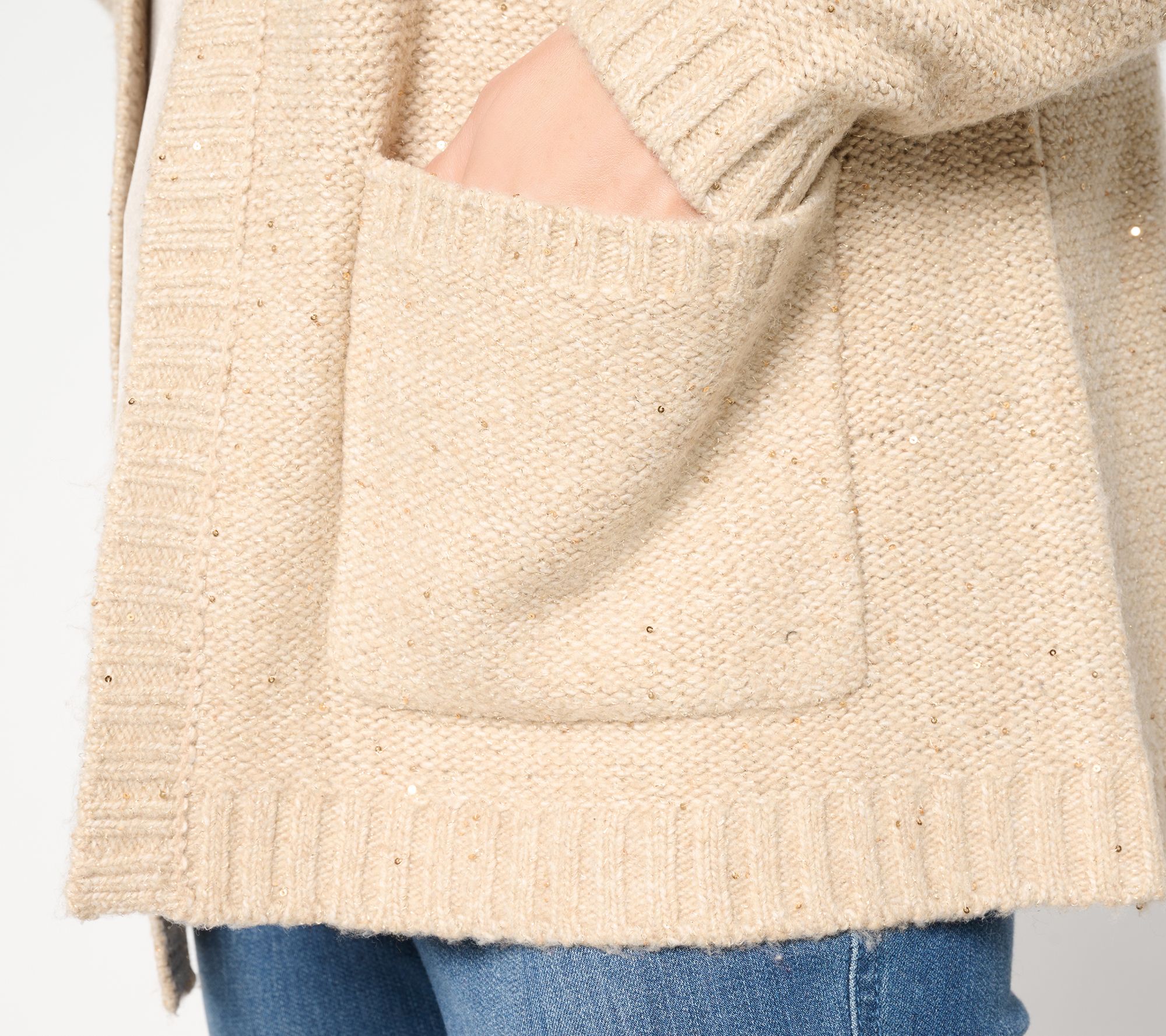 • Features: sparkle embellishment, long sleeves, open front, patch pockets, straight hem