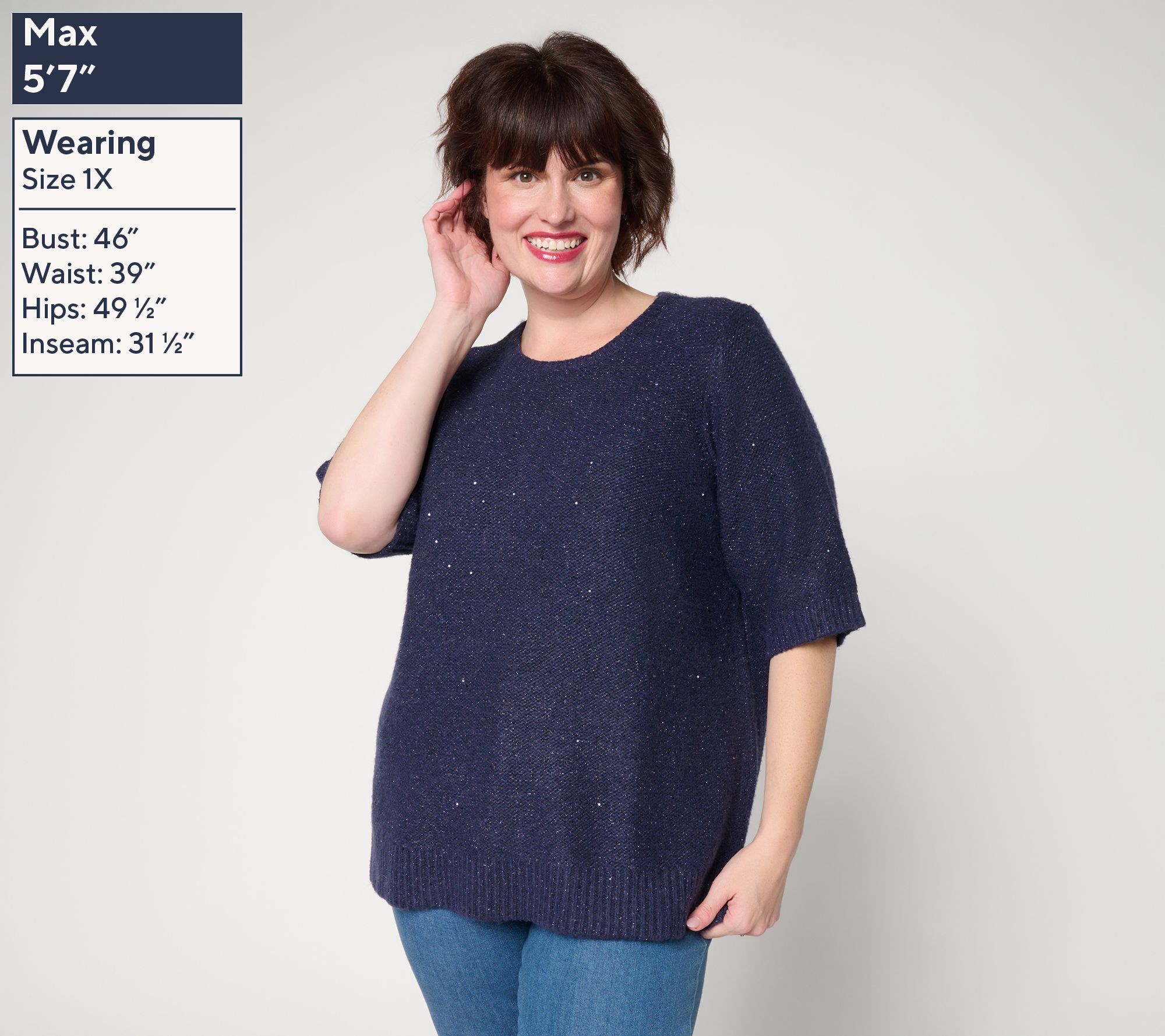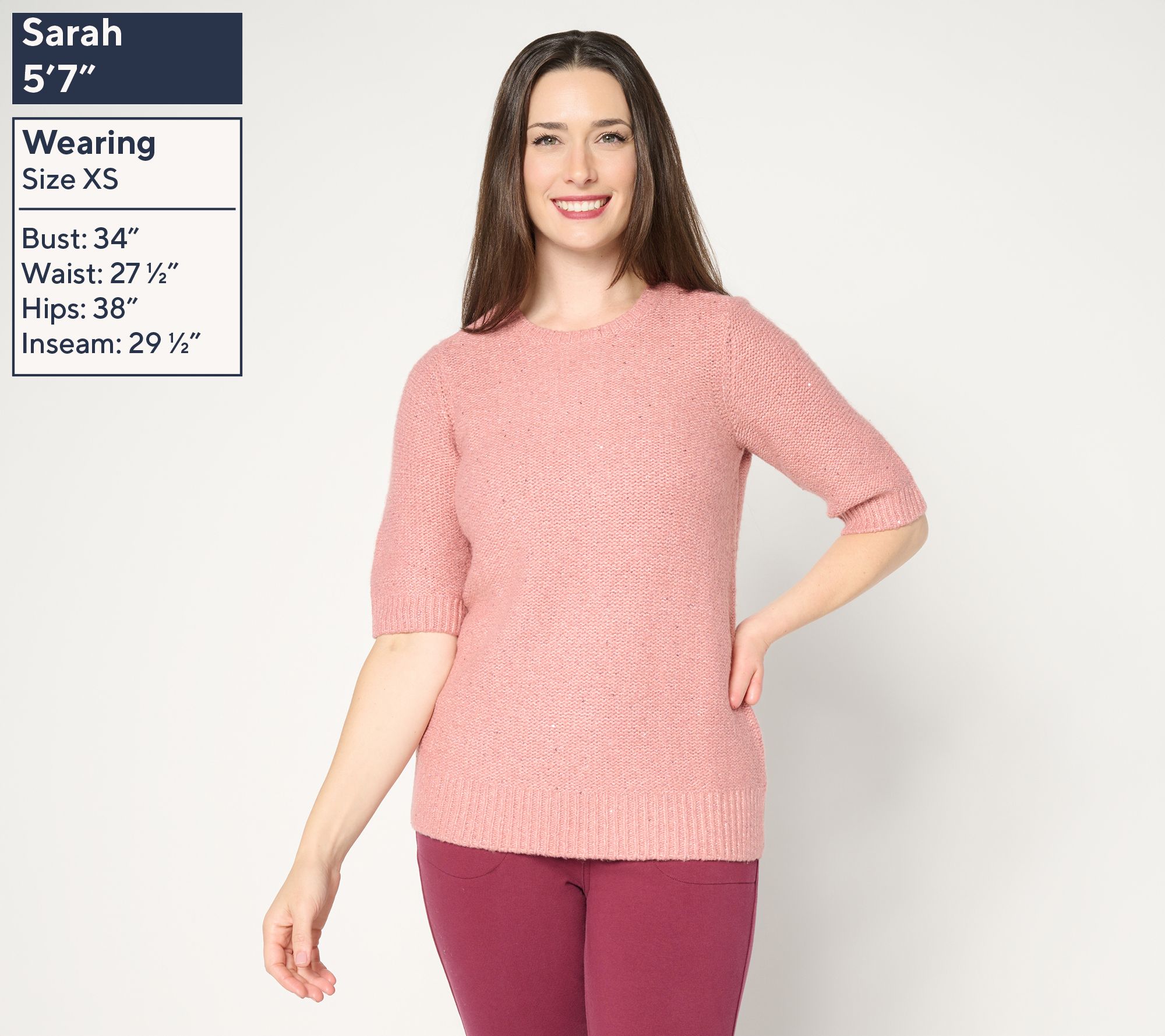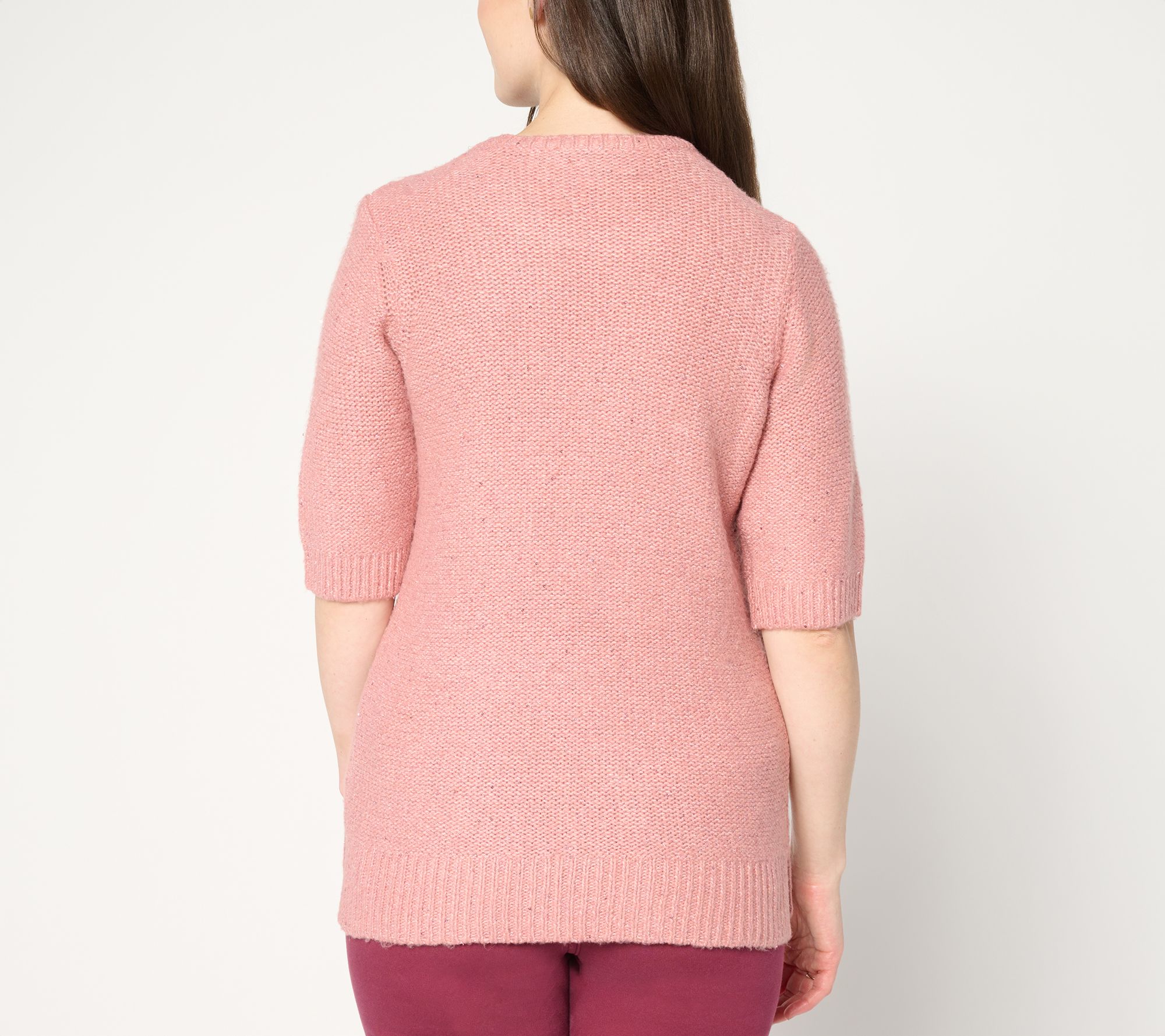 • Features: shimmer embellishment, crewneck, elbow-length sleeves, ribbed cuffs/neck/bottom band, straight hem with side slits