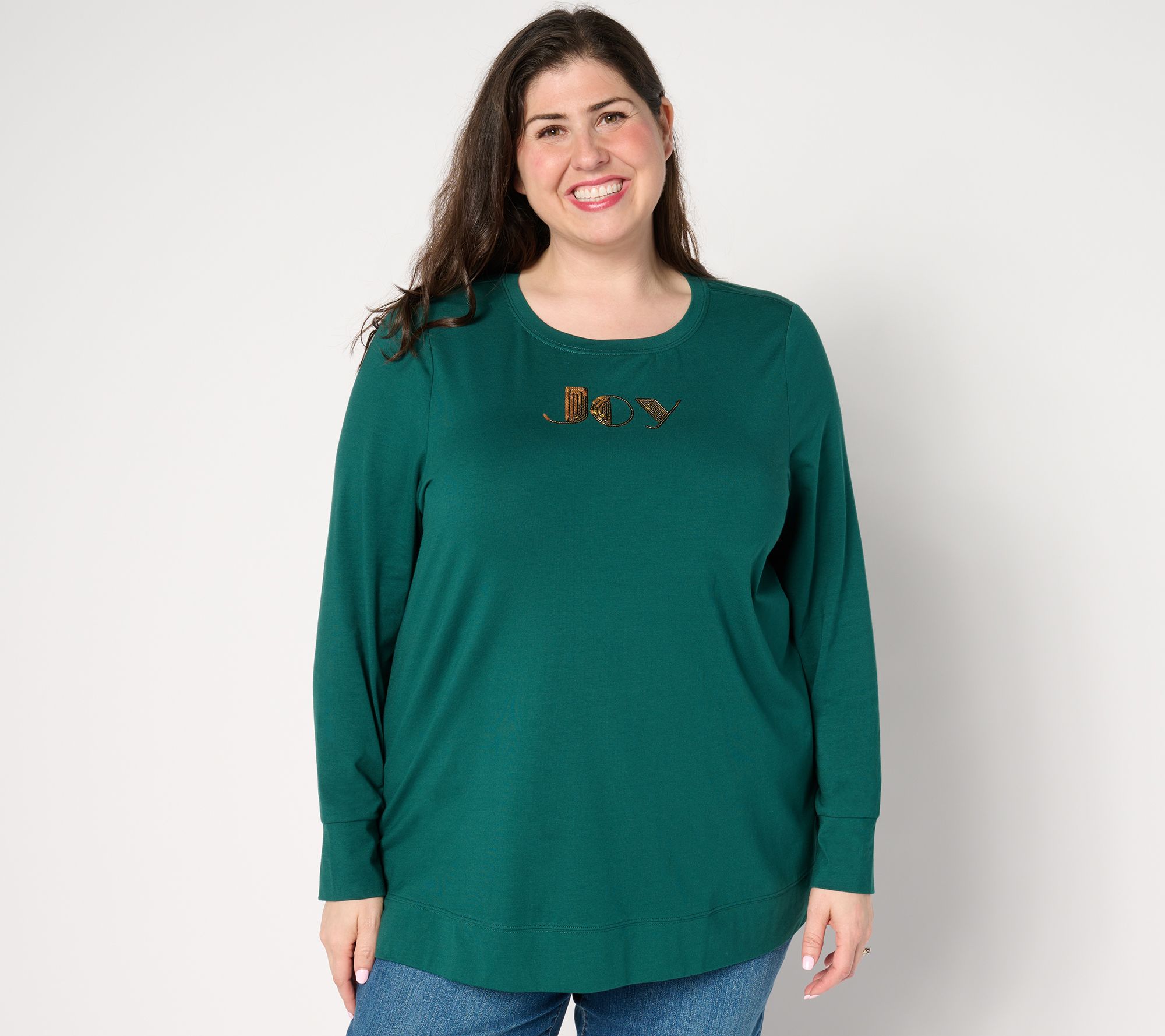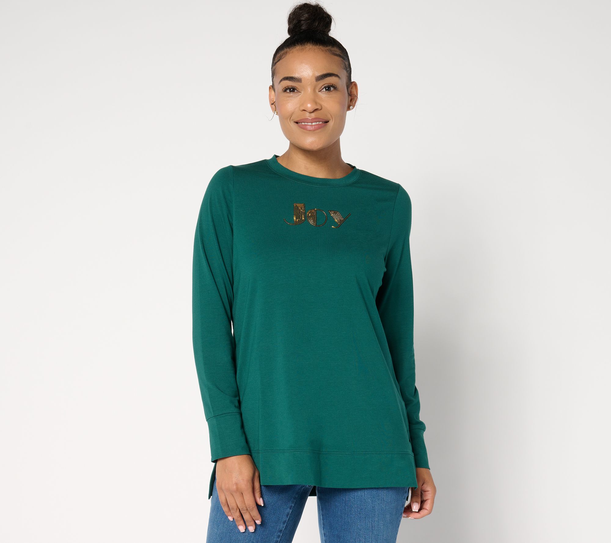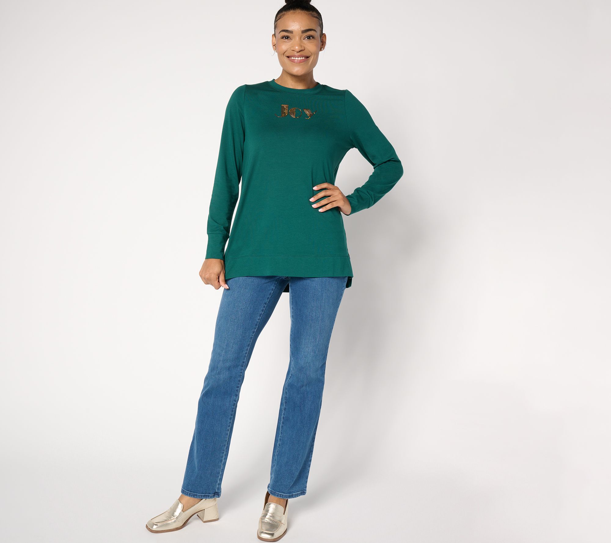 Spread some holiday cheers with this Tripleluxe knit top. The festive crew neck features a positive sentiment spelled out in sparkly sequins for all to see. Wear it to the Christmas potluck or family gathering where you're sure to be met with a sea full of smiles. From Jingle Belles by Kim Gravel.