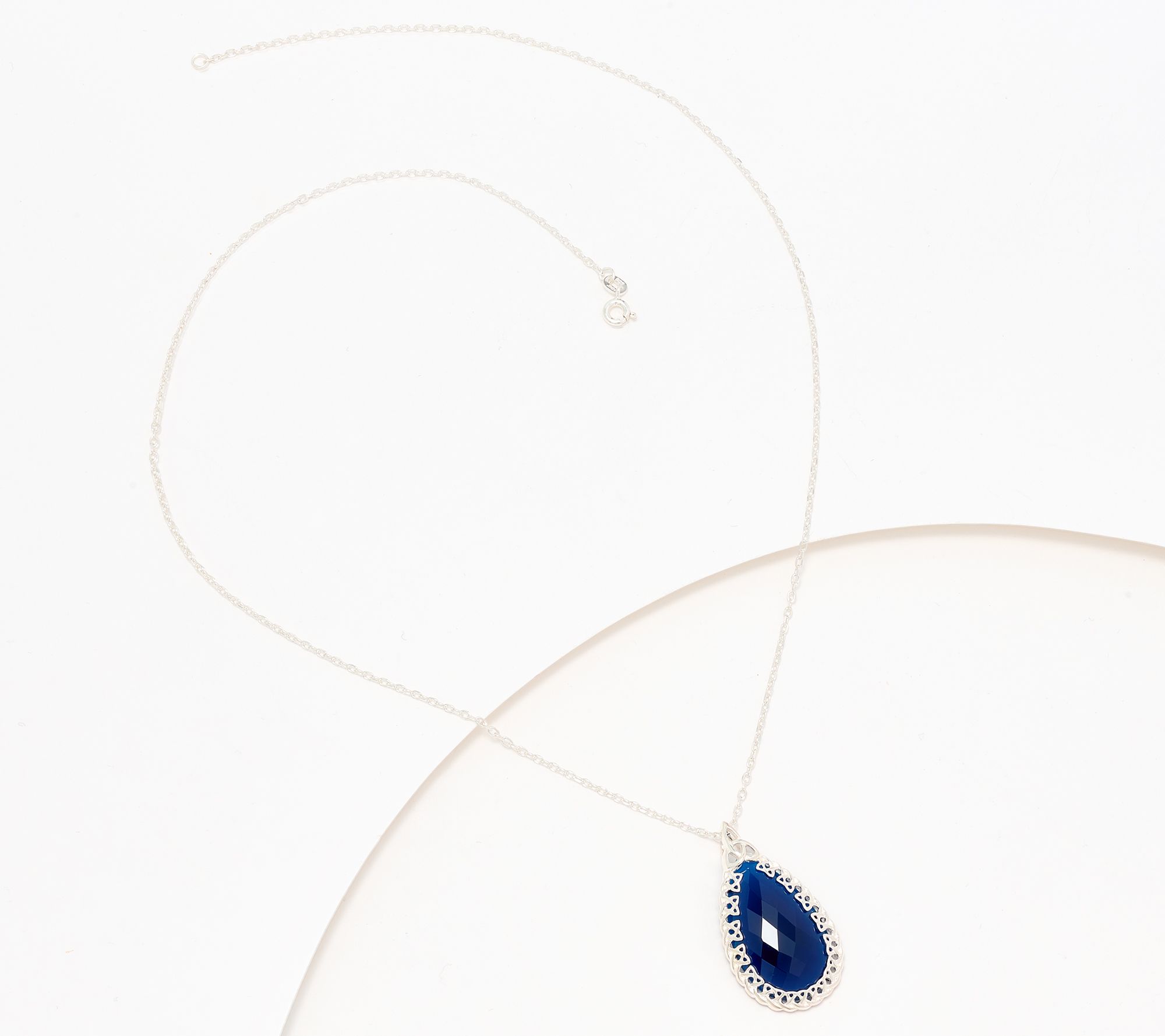 A pear-shaped gemstone is beautifully surrounded by a filigree trinity knot design to create this stunning necklace. From JMH Jewellery.