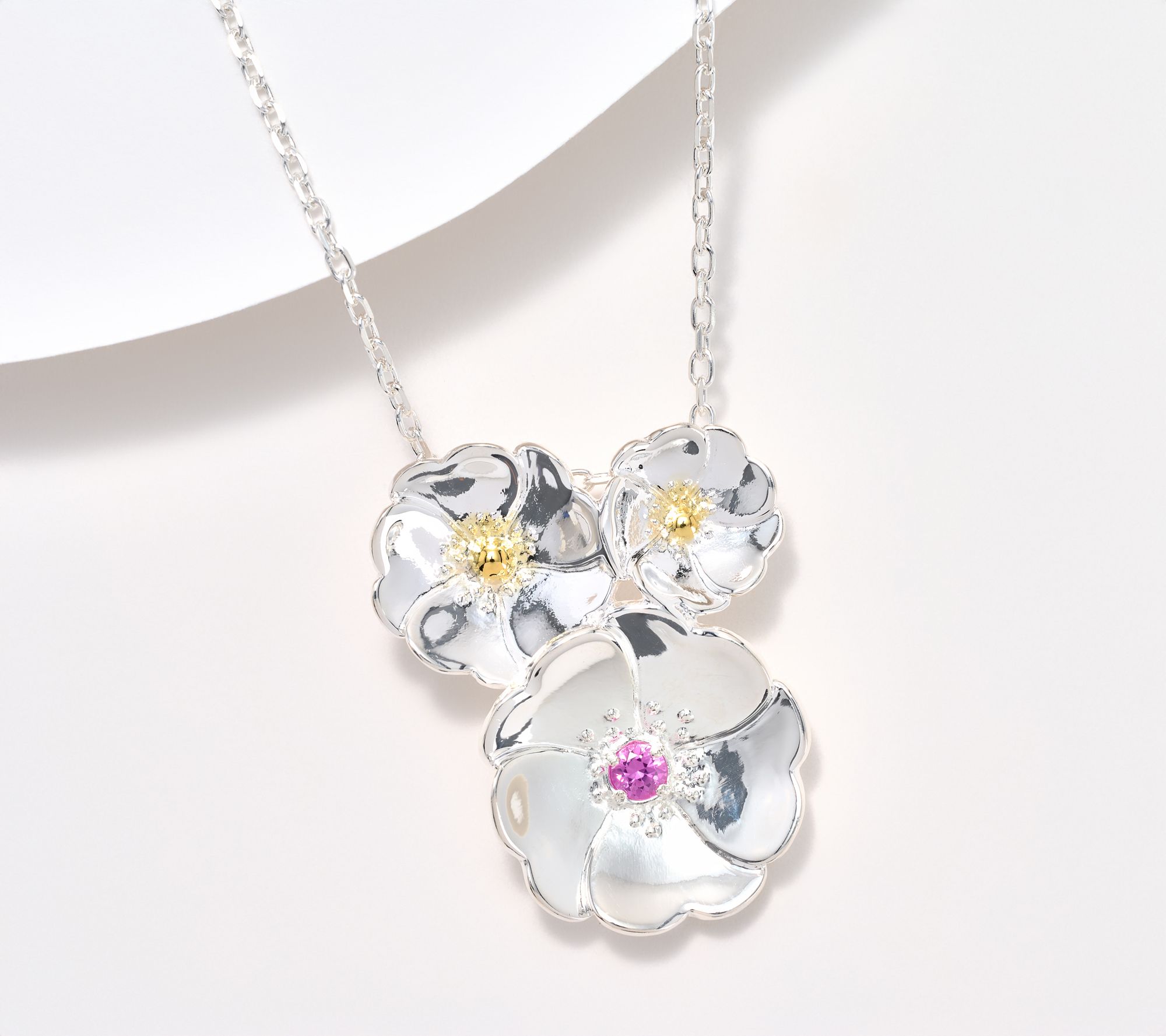 • Pink simulated sapphires; gold accents; flash plating on the pollen in the flowers