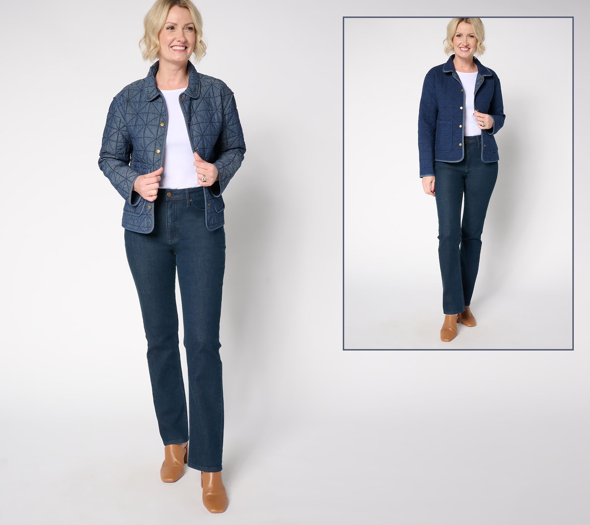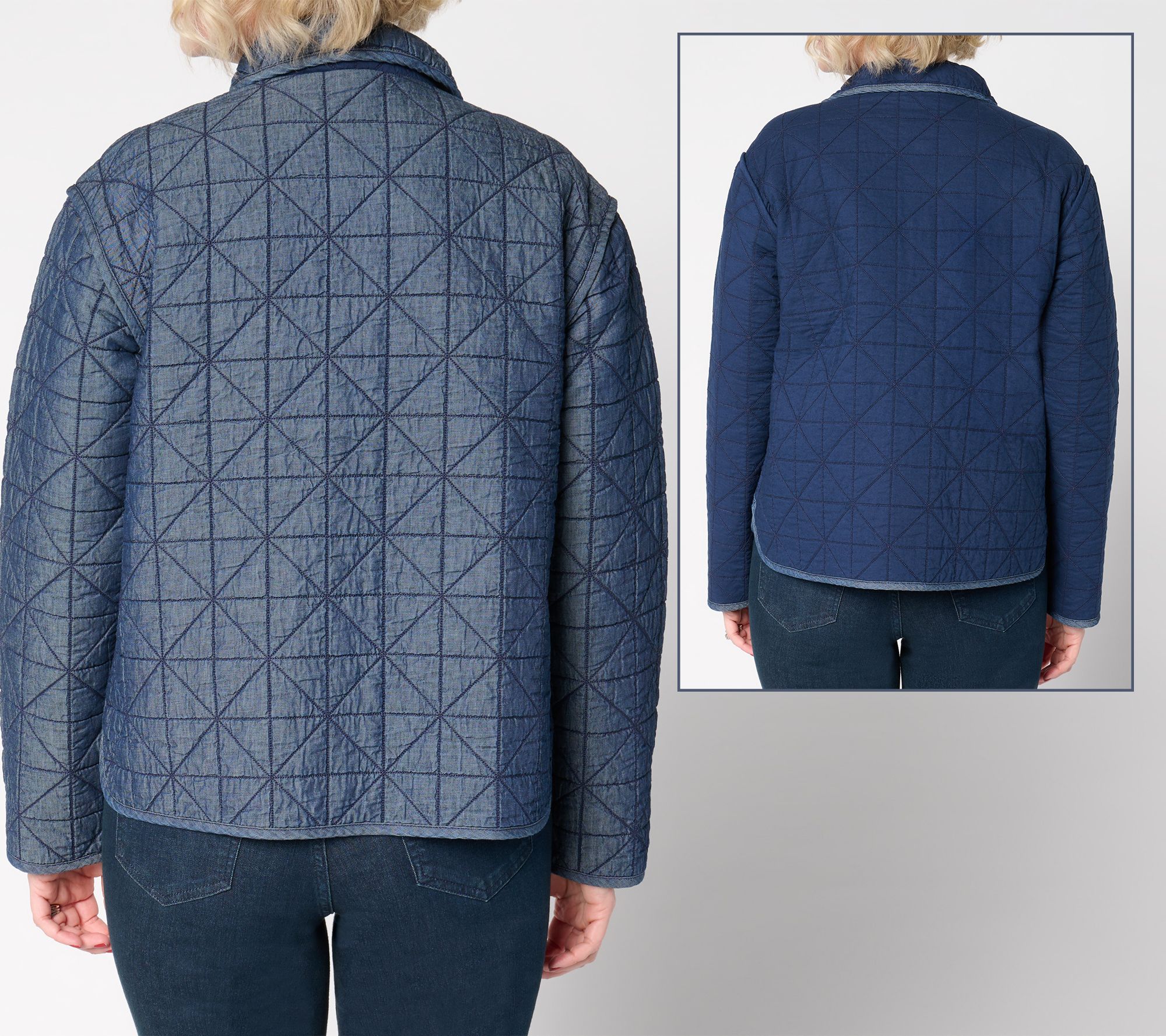The denim jacket -- reimagined. This closet staple gets twice the love with a quilted reversible design and easy snap closures -- swiftly elevating your outerwear game with a two-sided topper that's ideal for transitional weather. Snap it up and enjoy its fresh and so-chic vibe. From the Joan Rivers Classics Collection®.