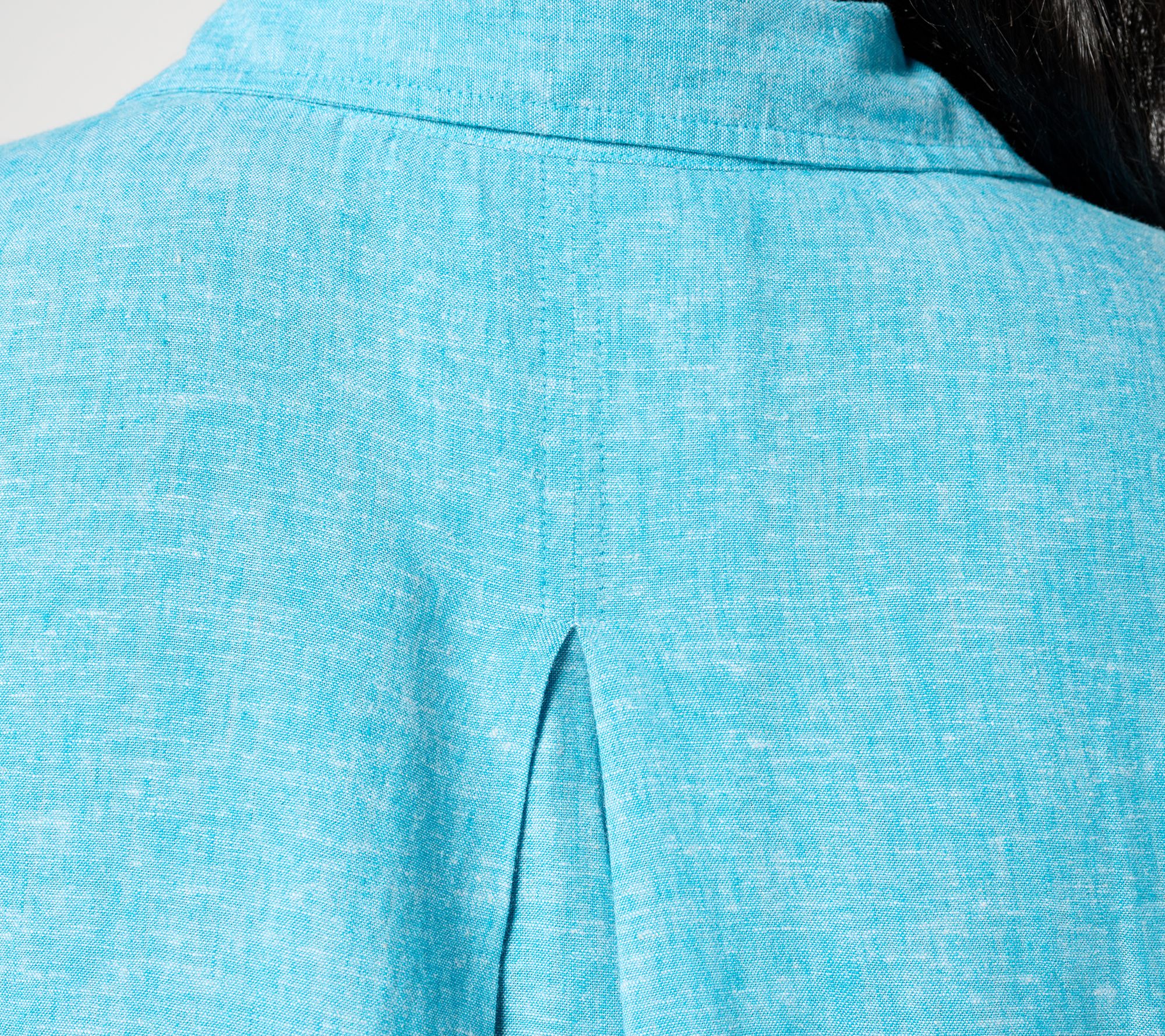 • Features: double button-front closure, collar, 3/4-length sleeves, inverted back pleat, side slits at bottom hem