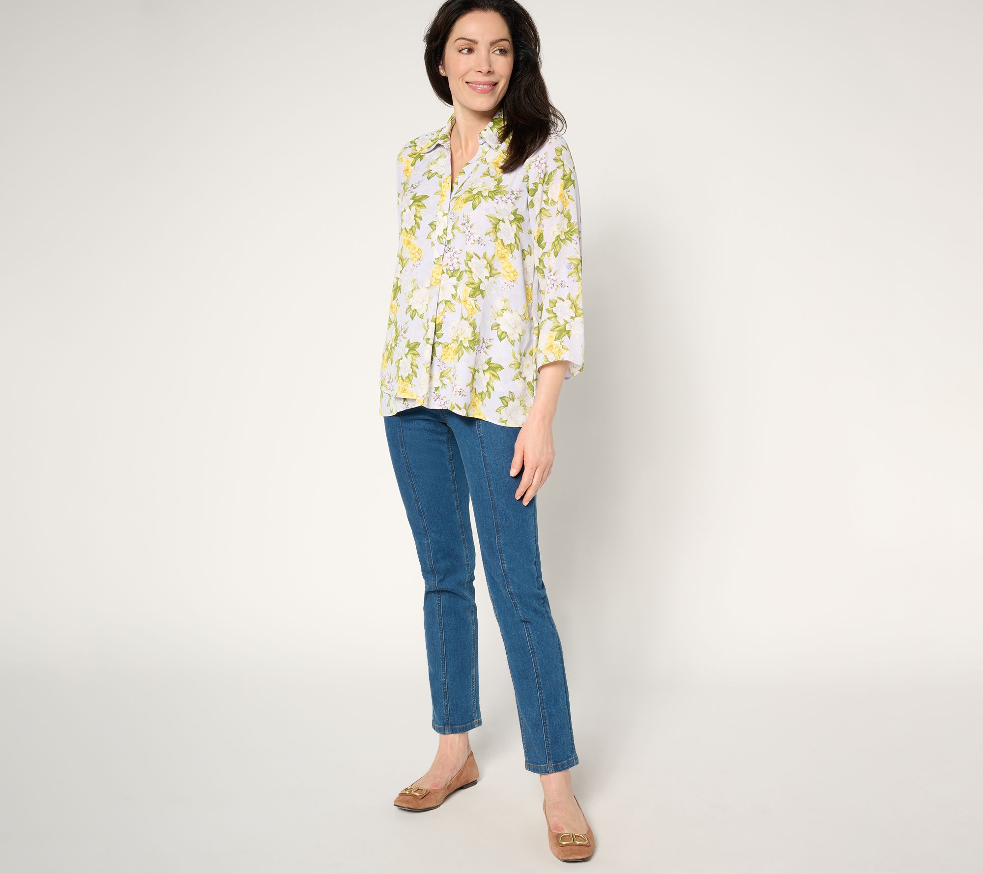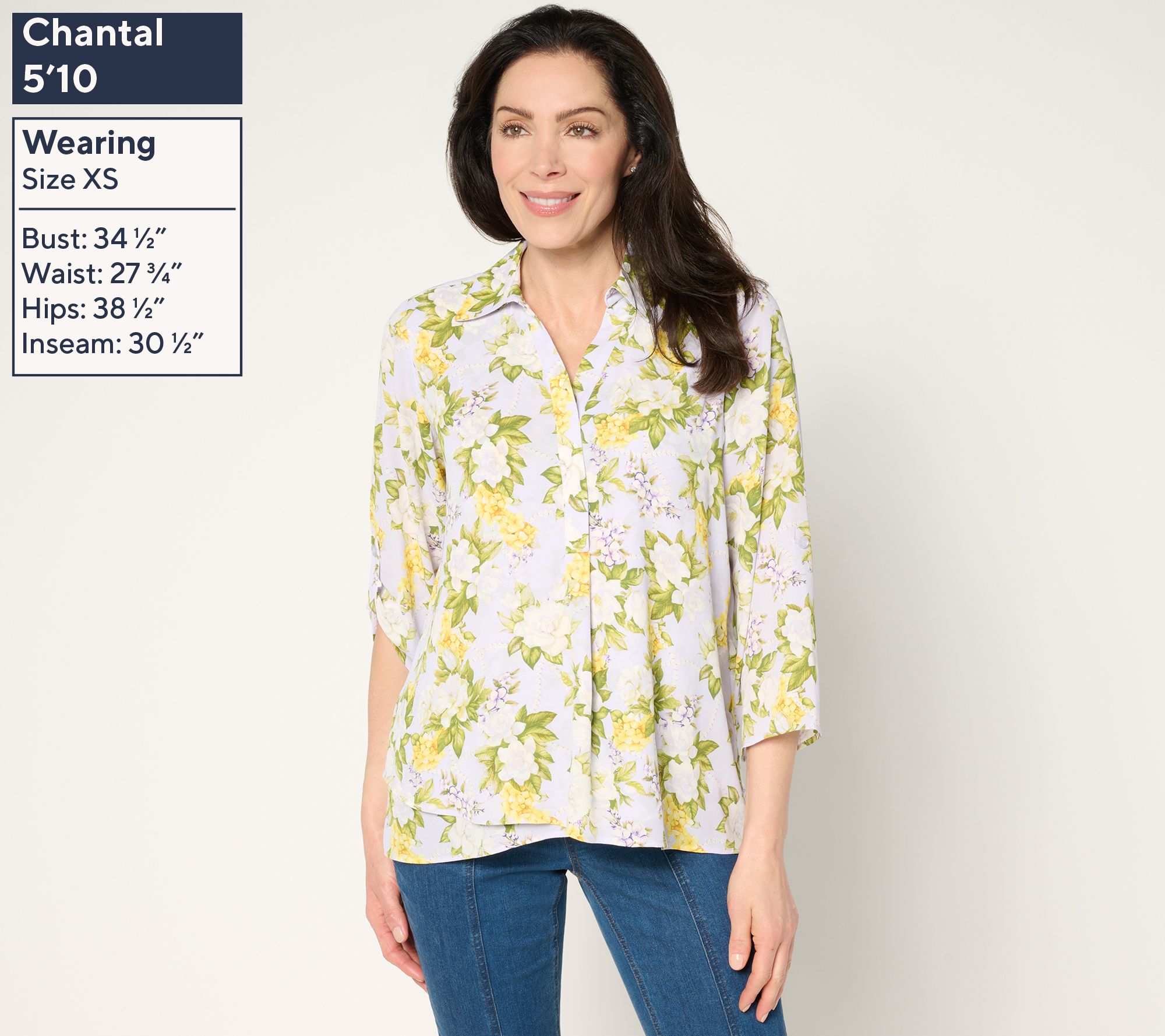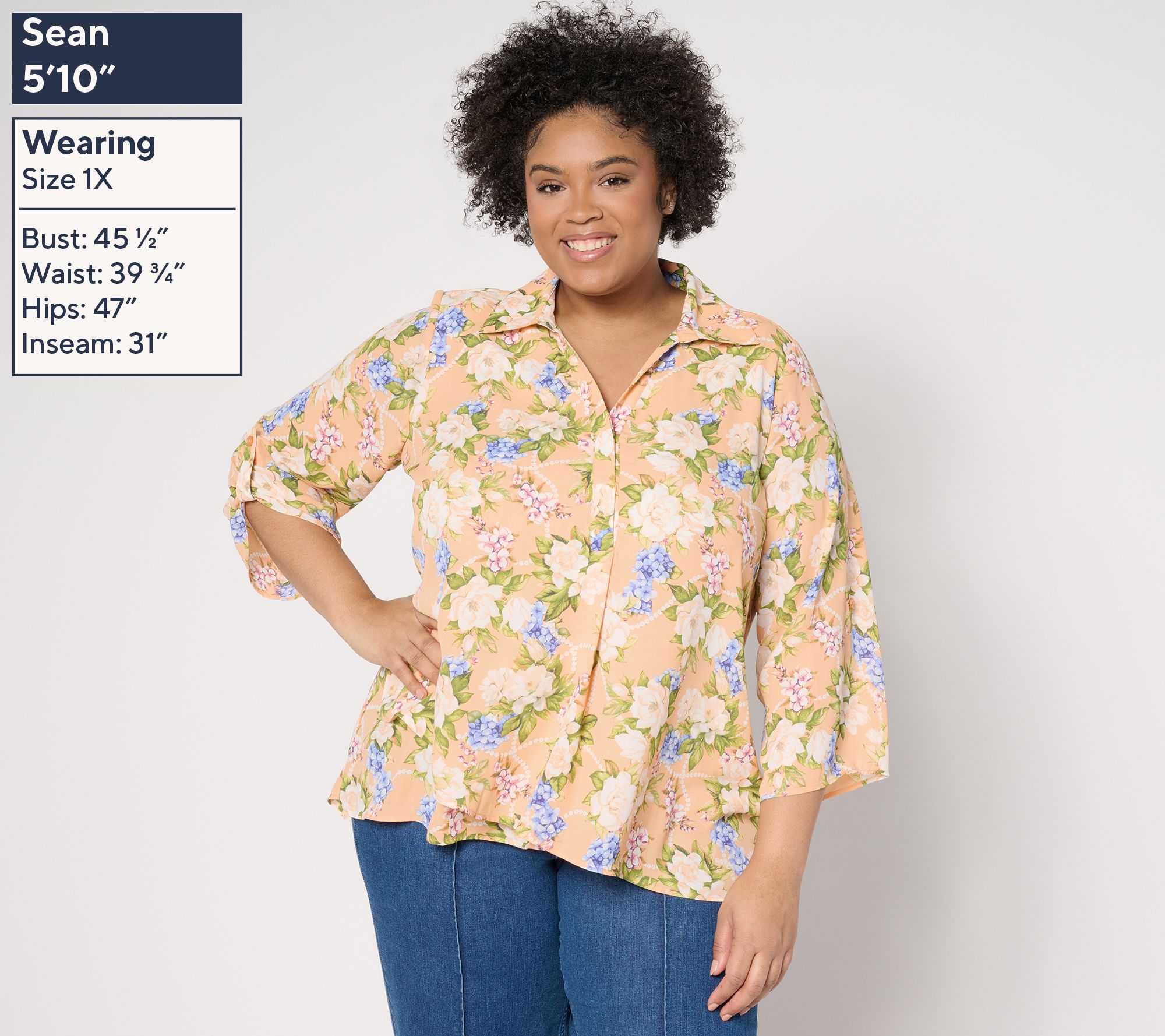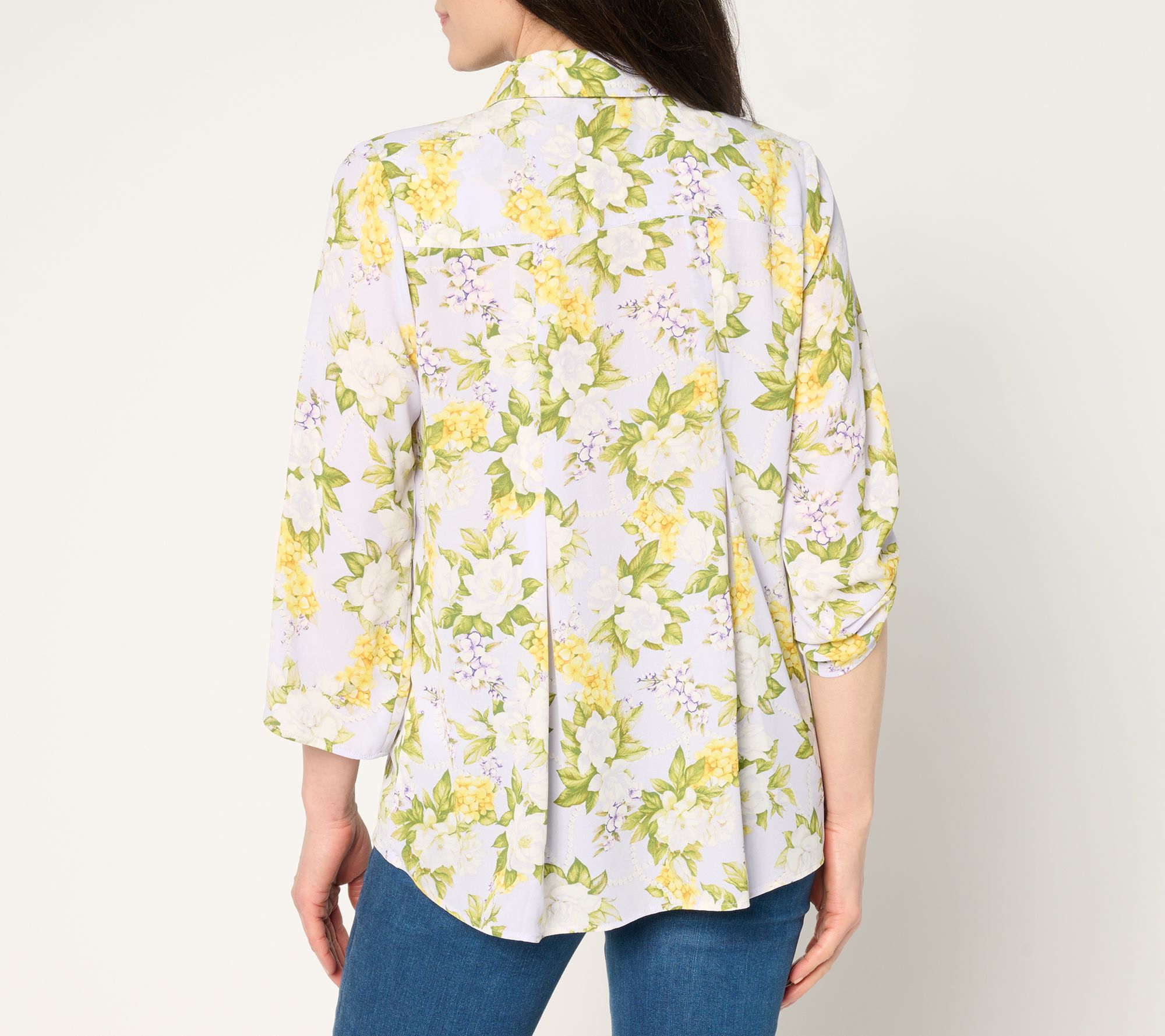 Can't get enough florals? This gardenia print lady blouse with roll-tab sleeves adds a fresh, feminine vibe to your wardrobe. The hidden placket and tulip slit at the front offer subtle sophistication, while the box pleat on the back ensures a figure-flattering fit. From Joan Rivers.
