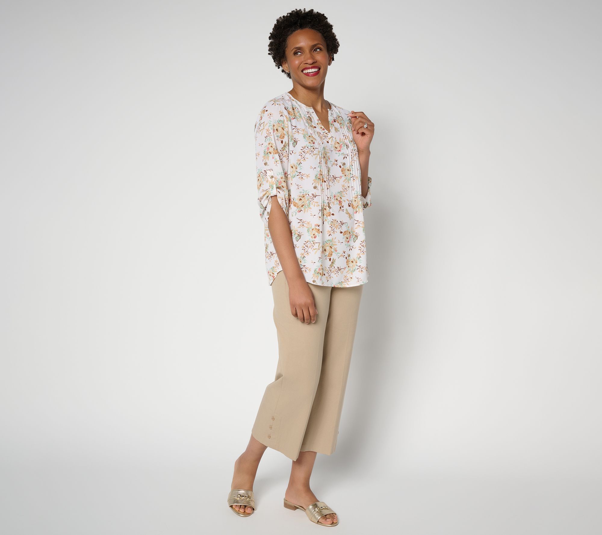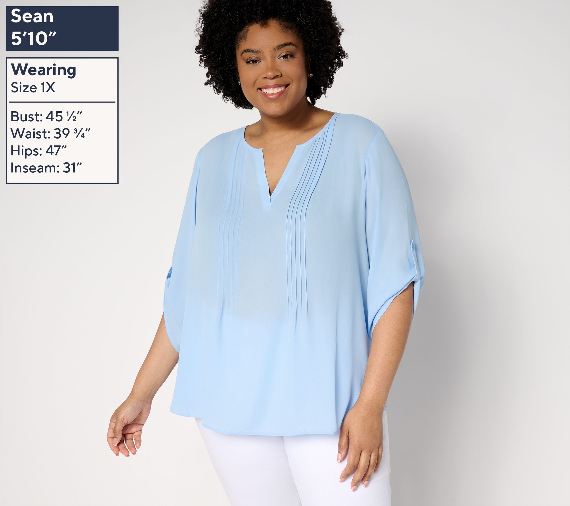 Pencil in that dinner date, client presentation, or weekend winery tour. This pretty pintucked blouse in graceful georgette helps your closet keep up with your calendar! Pair with twill crops and sneakers, a pencil skirt and kitten heels, or (oh!) white jeans and sparkly sandals. From the Joan Rivers Classics Collection®.