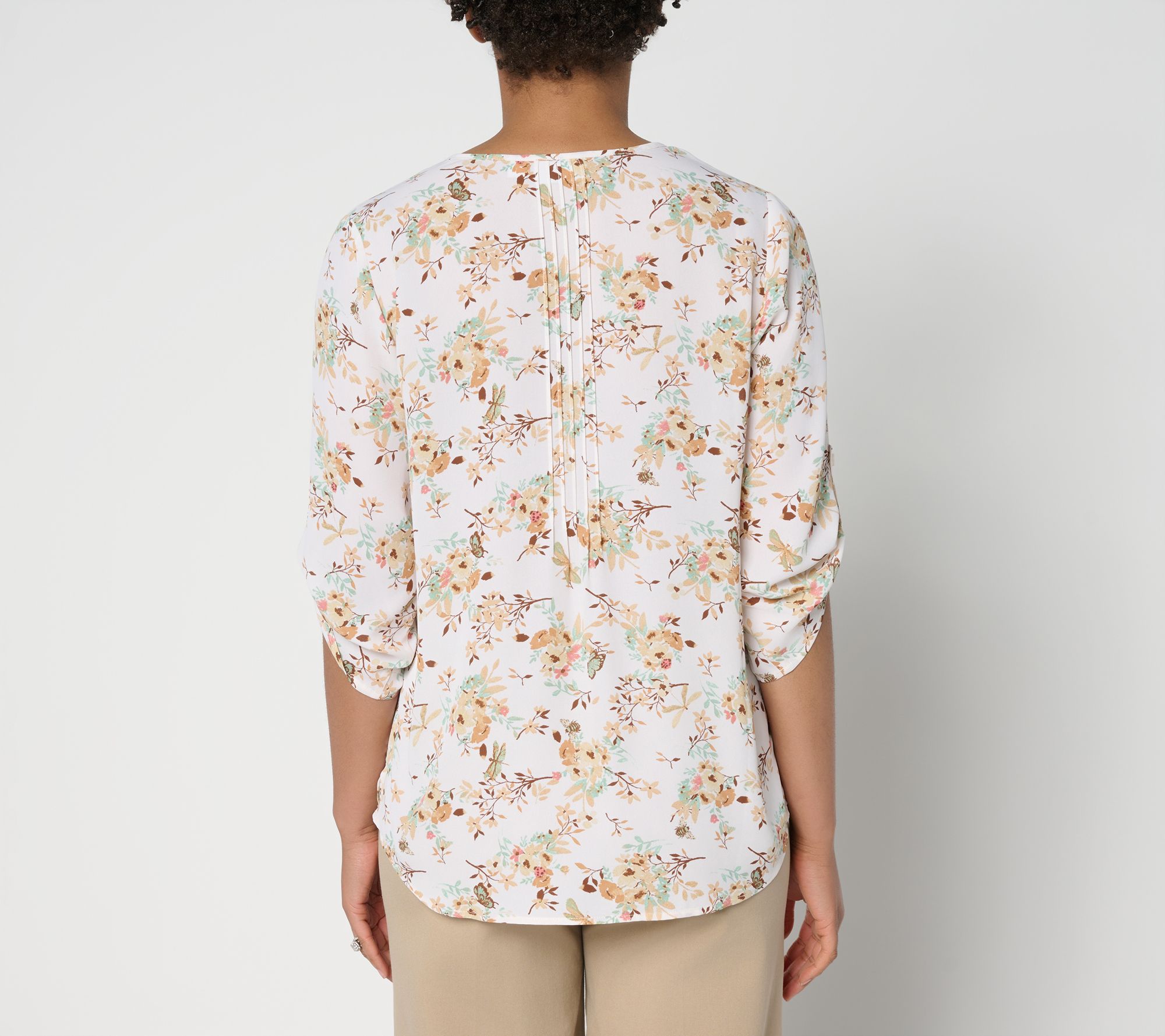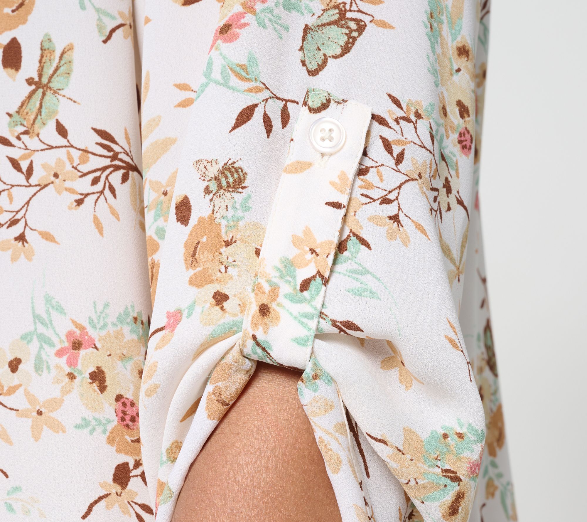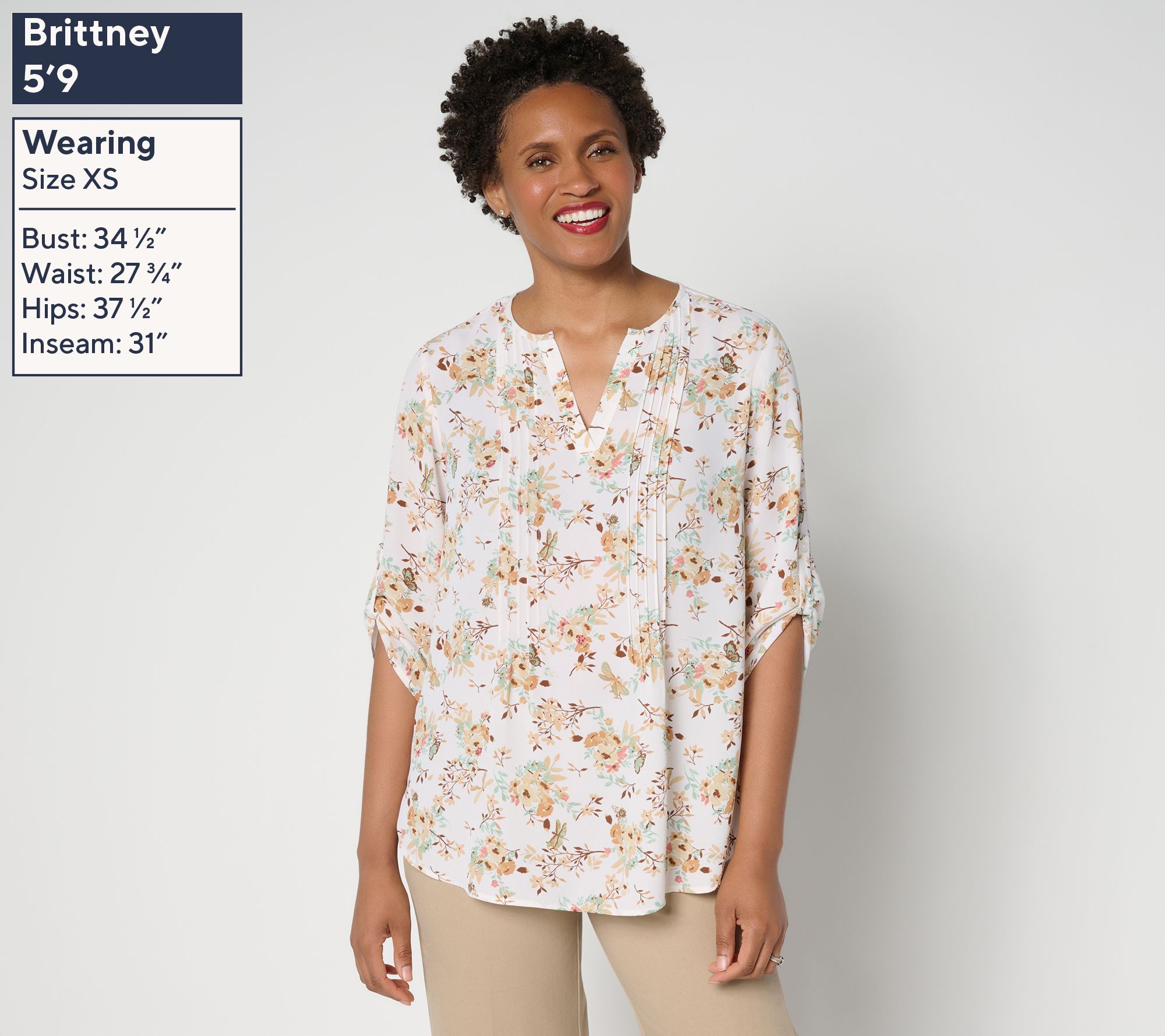 • Features: front and back pintuck details, split V-neckline, roll-tab sleeves, side slits