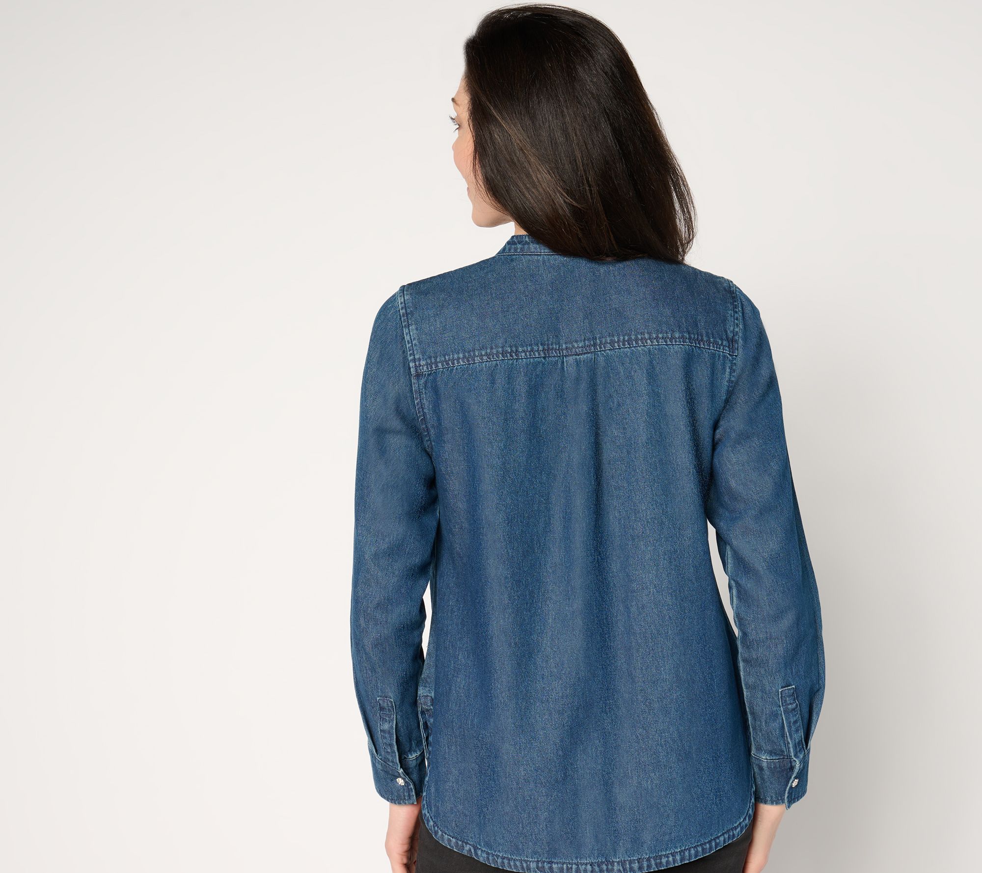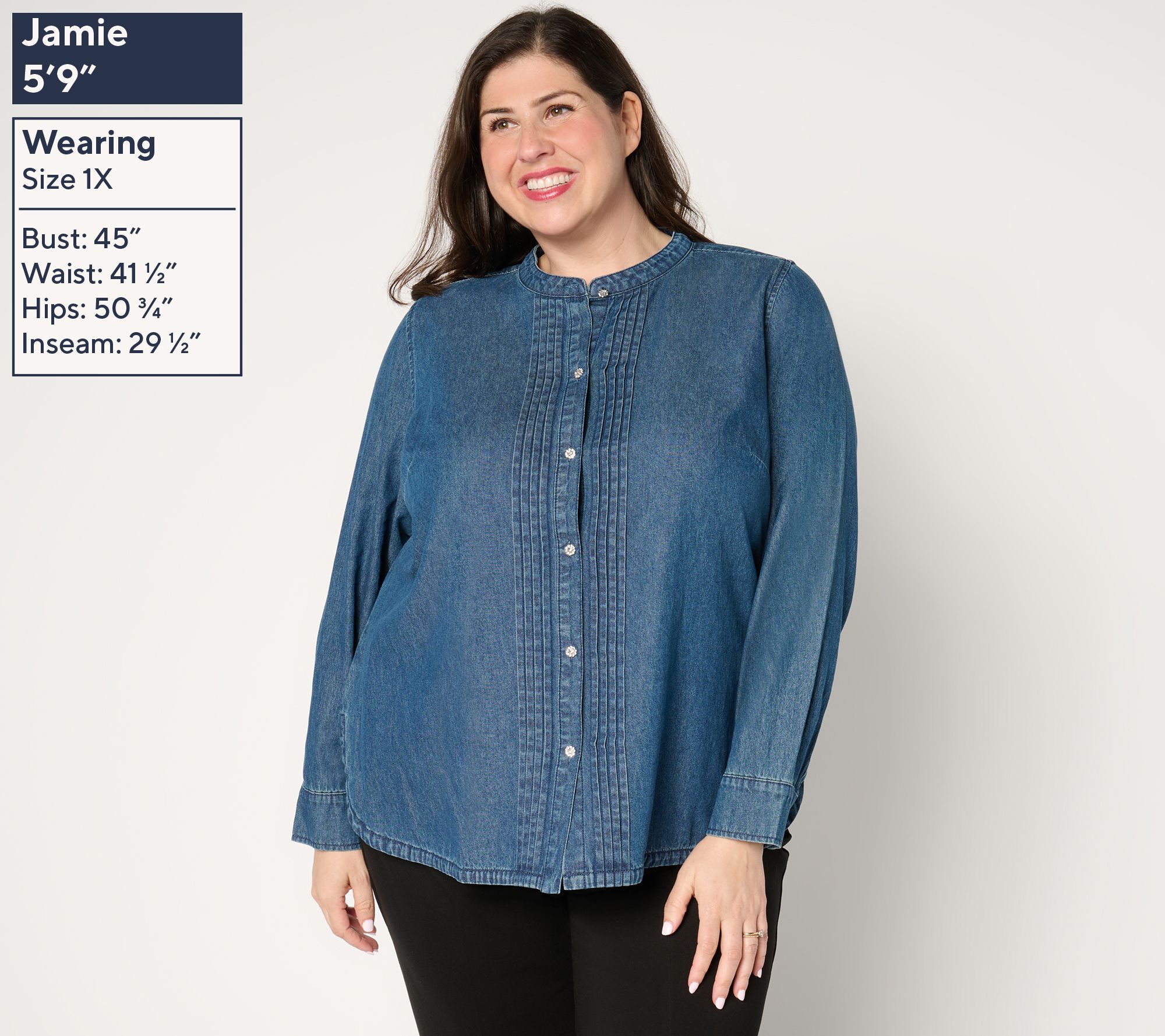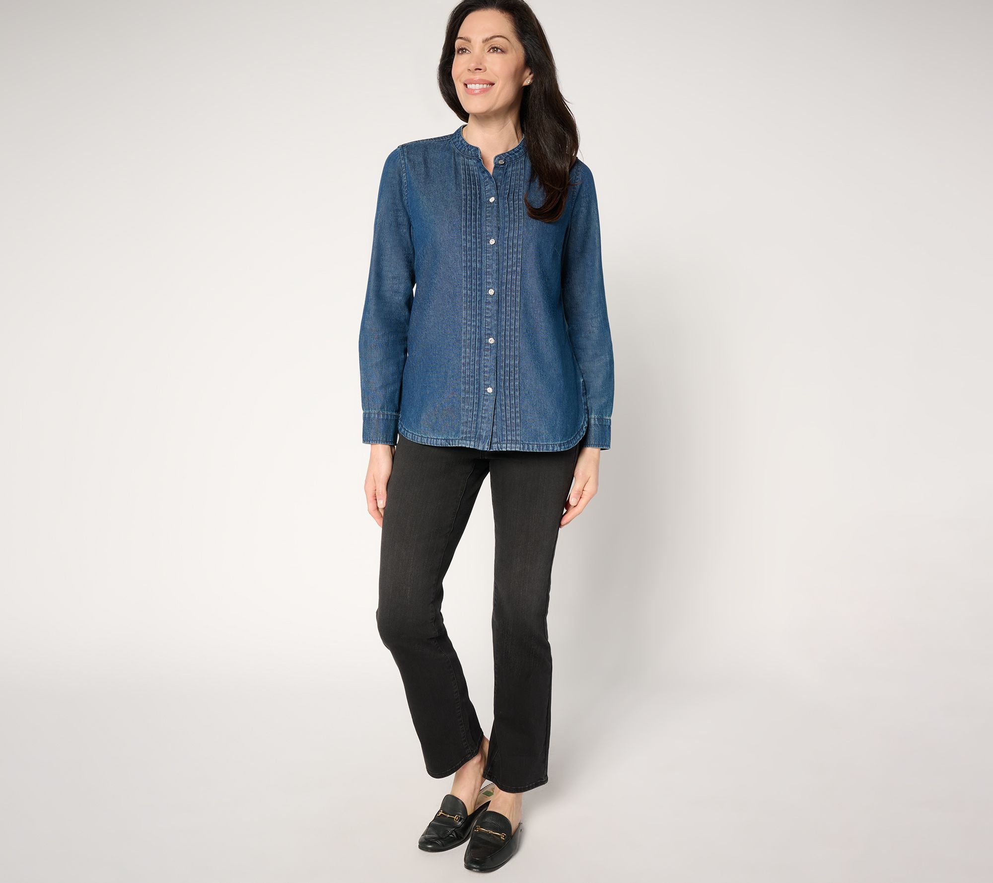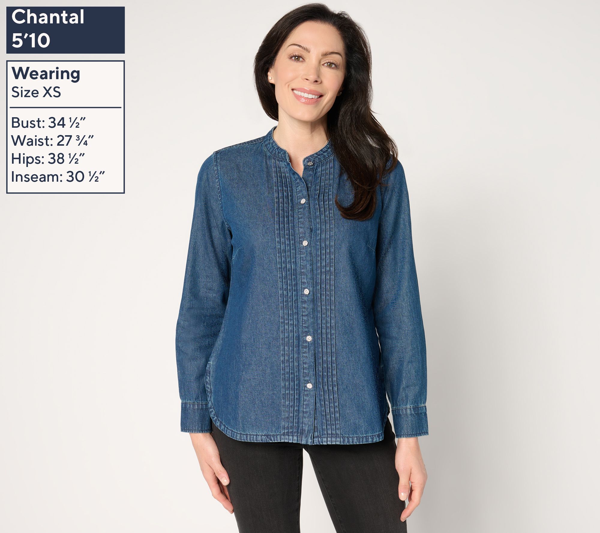 Rhinestone buttons and front pintuck details elevate the classic look of this denim shirt, making it perfect for both casual and more polished occasions. Pair it with your favorite jeans or a tailored skirt for versatile styling. From the Joan Rivers Classics Collection®.