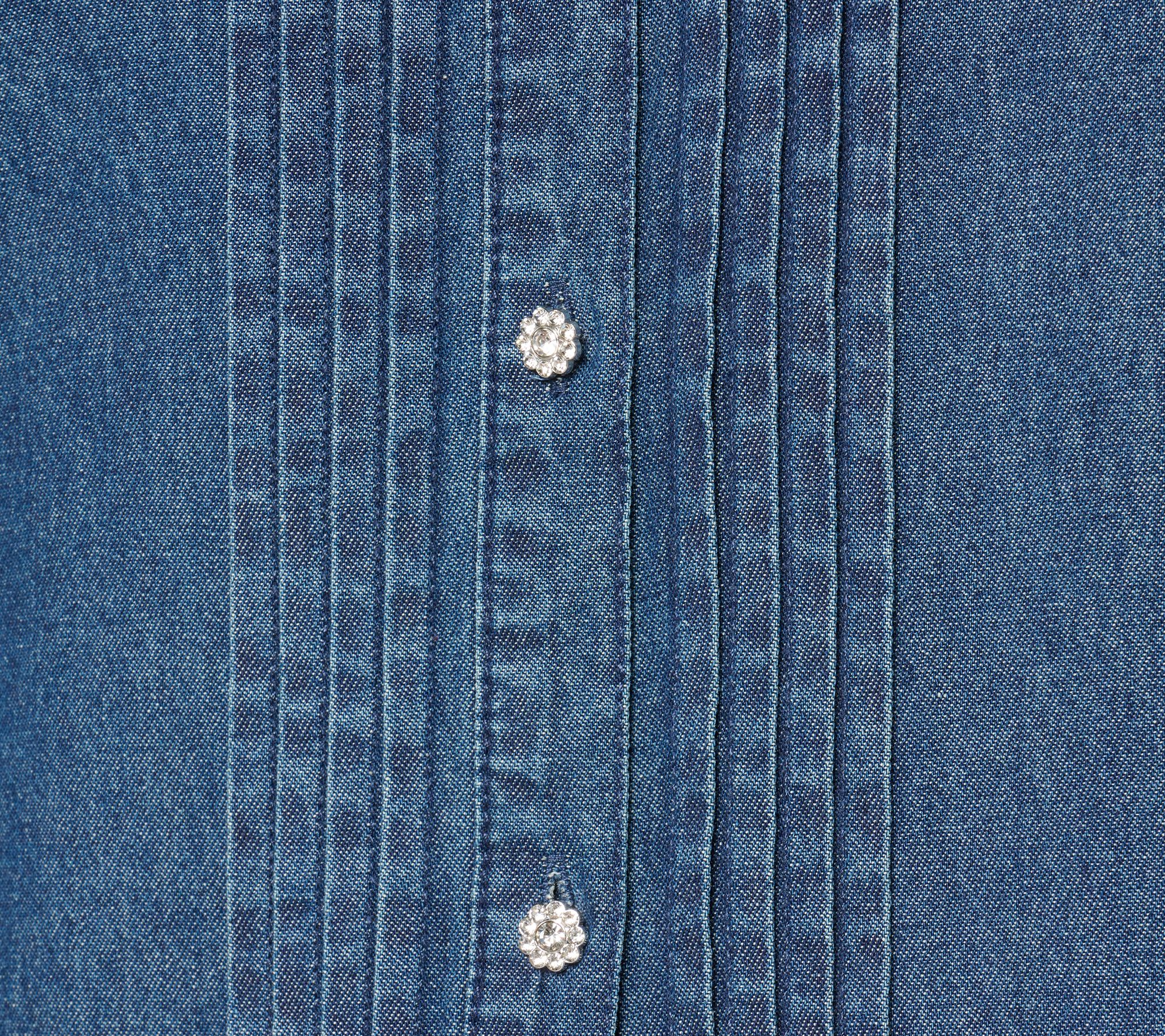 • Features: rhinestone buttons, bust darts, front pintuck details, back yoke with box pleat, hi-low curved hem, cuffs with one-button closures