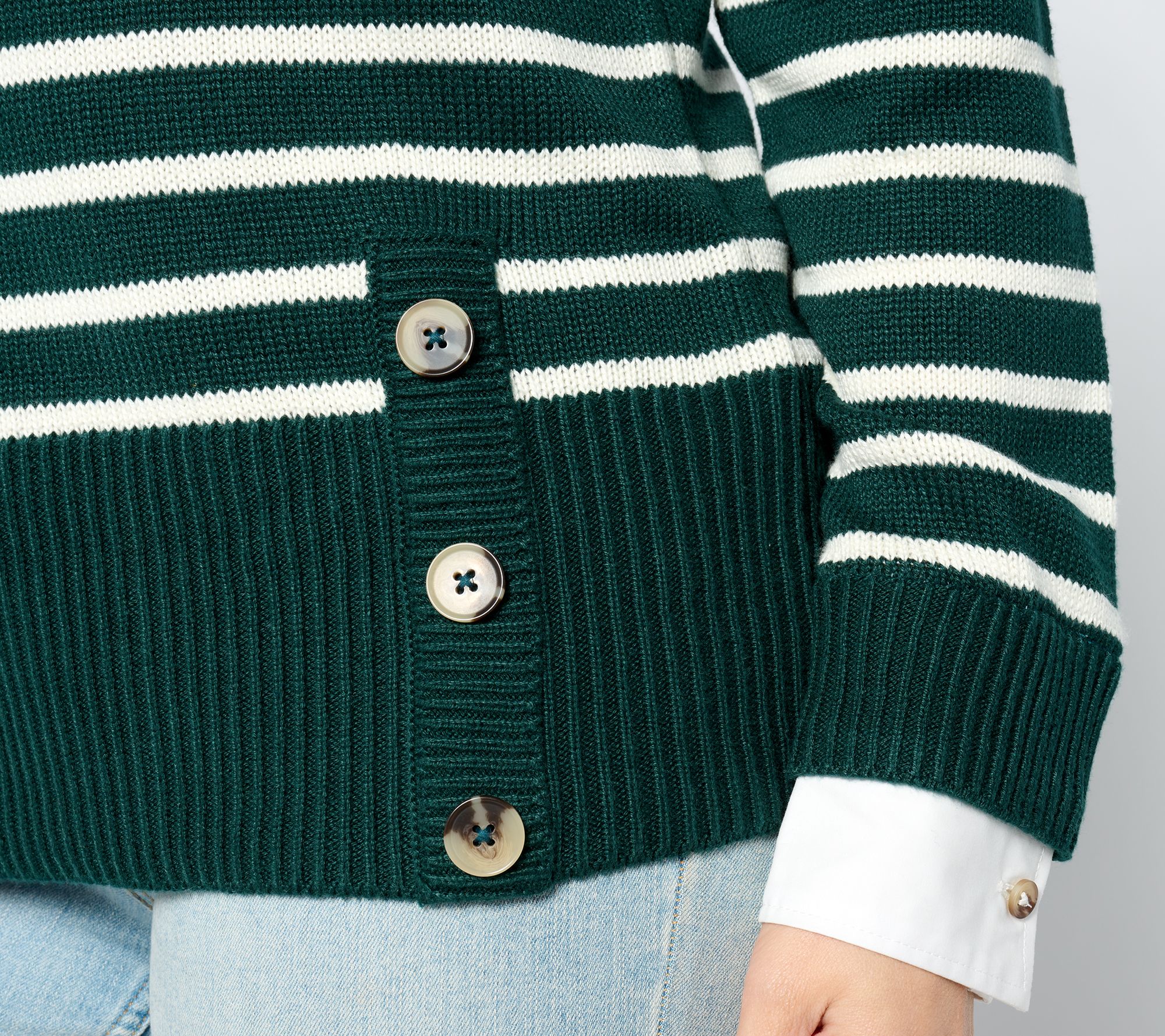 • Fabrication: mixed media, sweater knit body, woven collar and cuffs with button closures