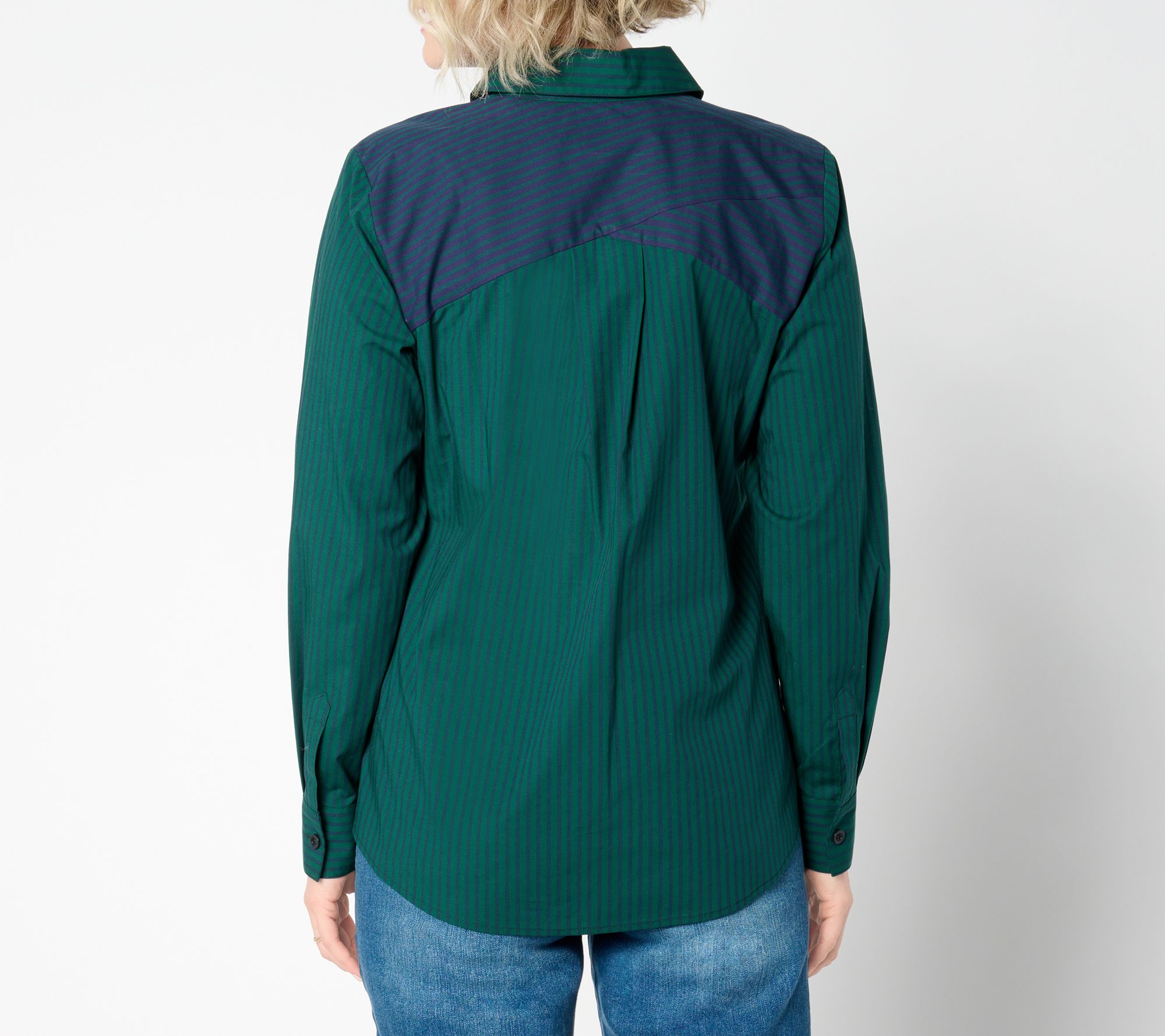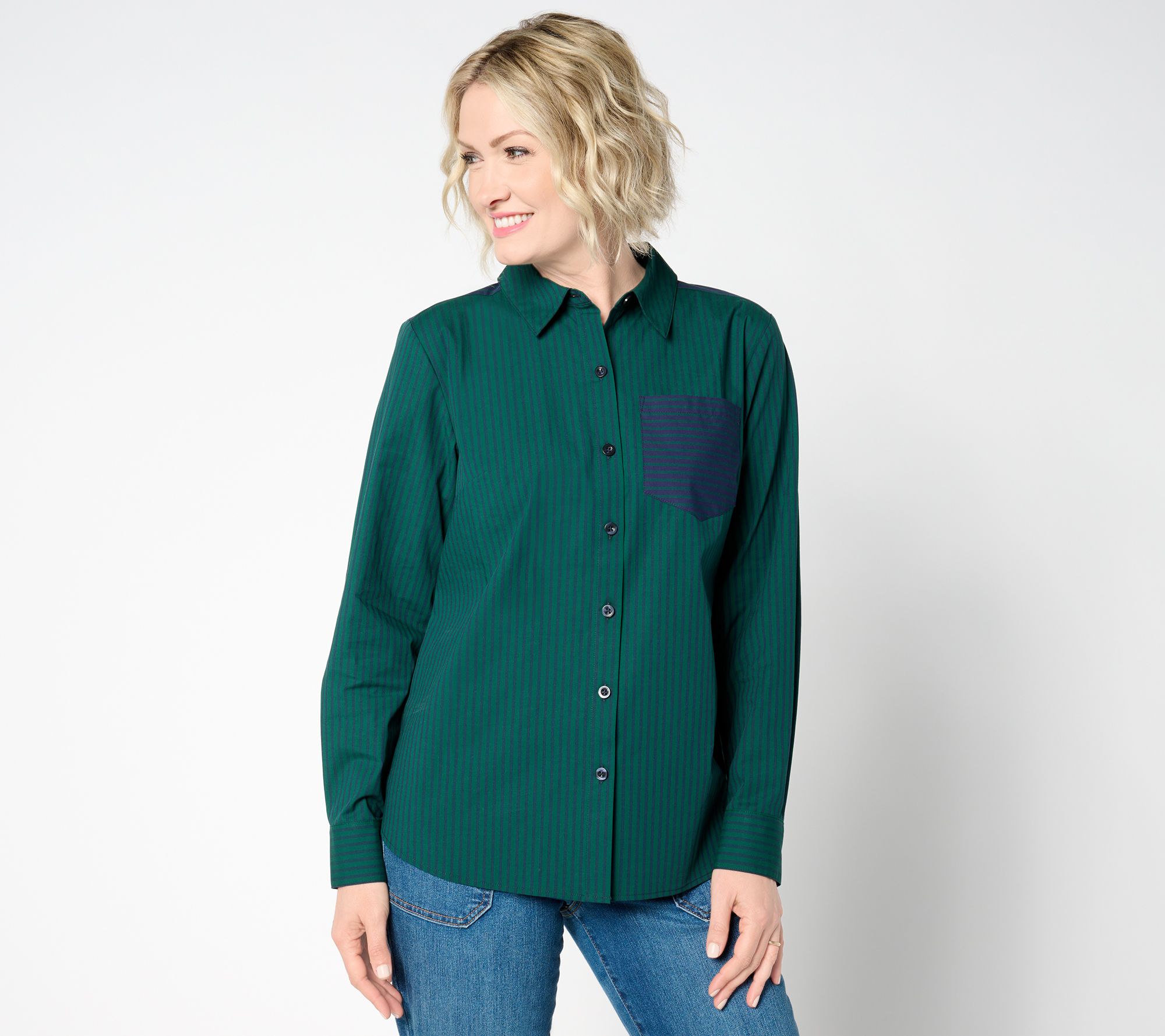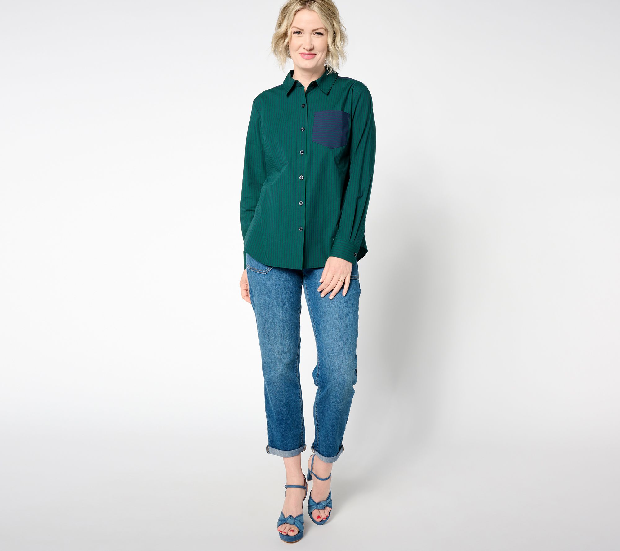 From bonfires to pumpkin patches to lunch with the girls, this boyfriend shirt does it all! A mixed stripe pattern adds interest, as does a patch pocket. From the Joan Rivers Classics Collection®.