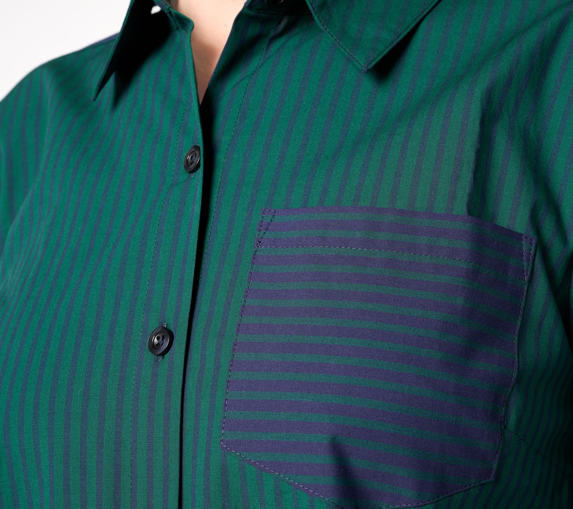 • Features: mixed stripe, button front, bust darts, long sleeves with cuffs, curved hem with side slits, patch pocket