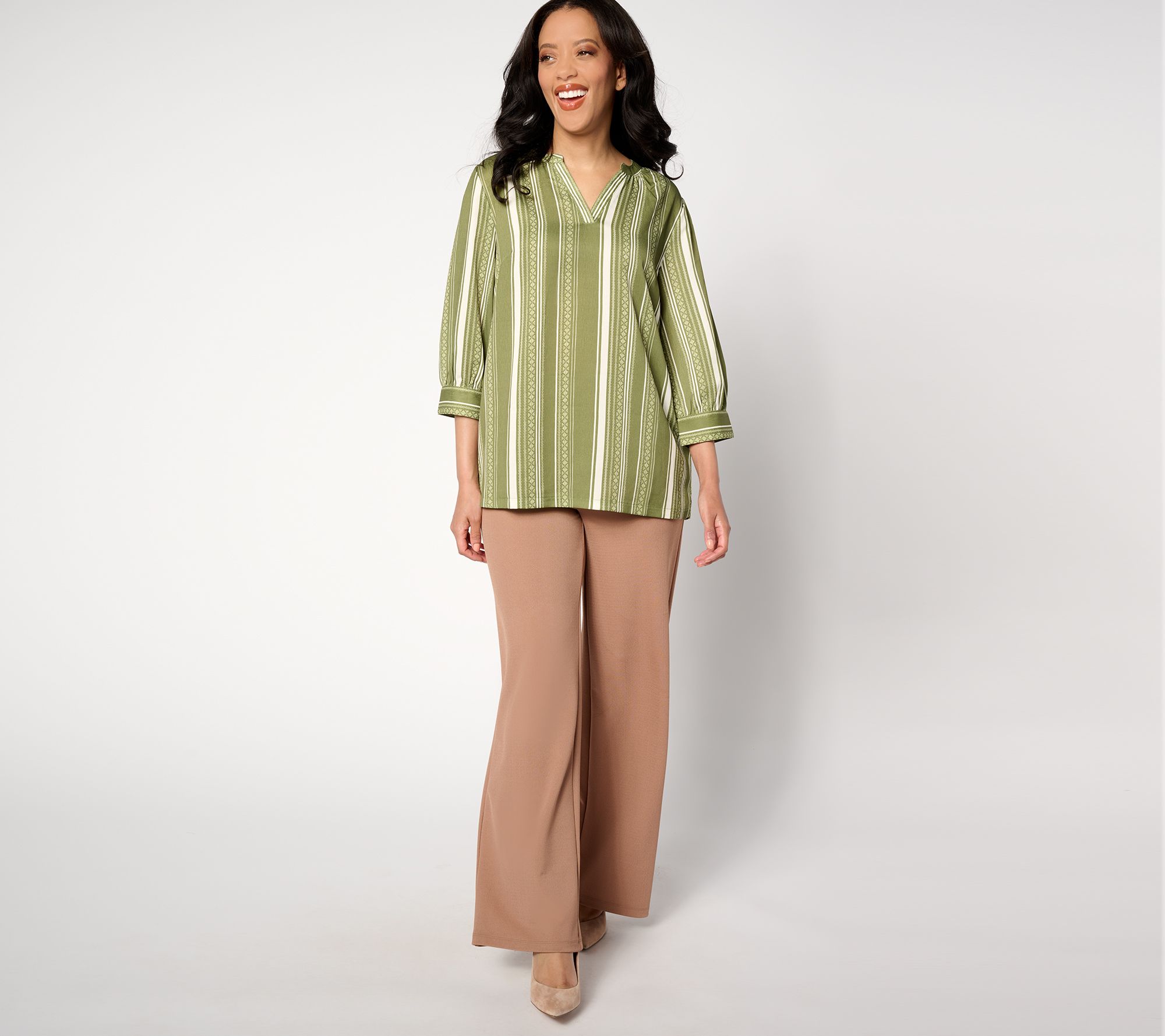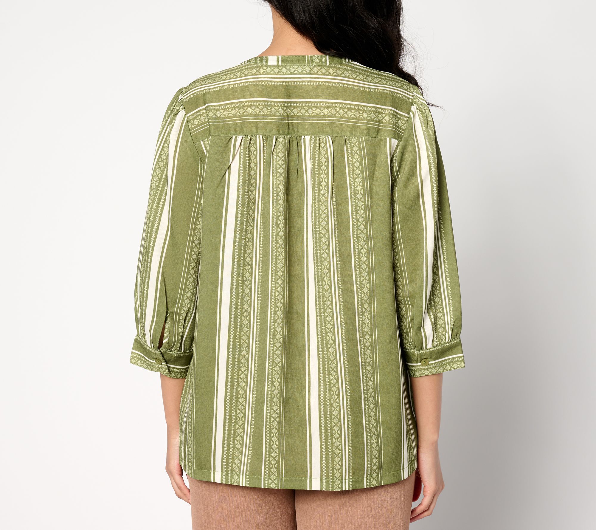 • Features: vertical striping, 3/4-length sleeves with button cuff