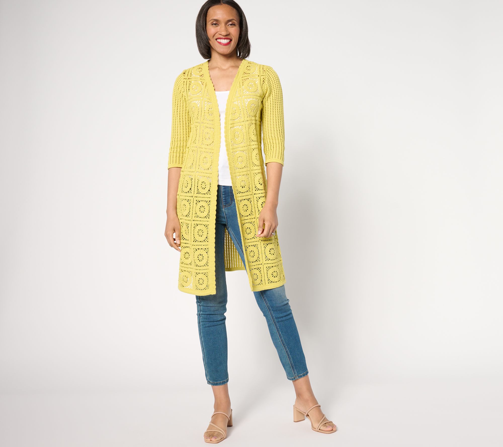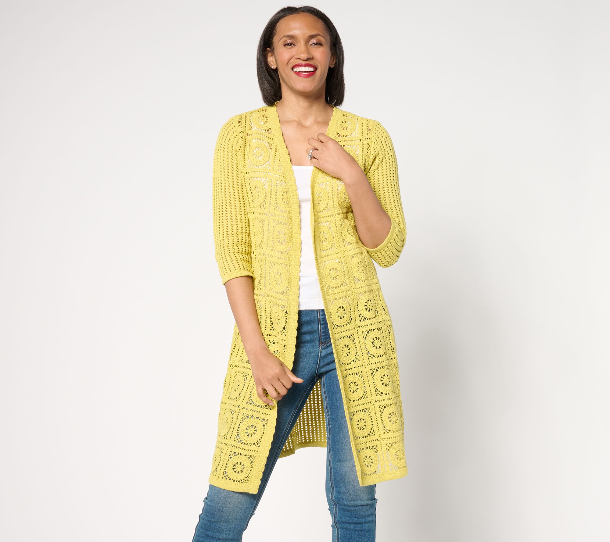 This isn't your grandmother's crochet cardigan. This stylish sweater features an open-front design with a scallop trim and airy knitted pattern on back and sleeves. Layer it over a tank top and jeans and let this see-through style take center stage. From the Joan Rivers Classics Collection®.