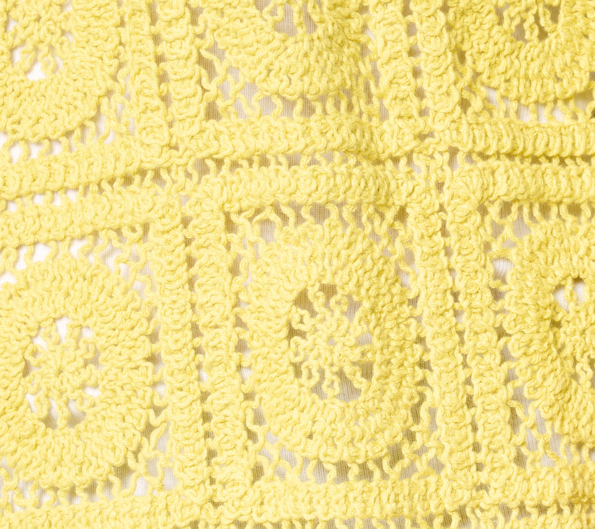 • Features: open front, ribbed neck placket with crochet scallop trim at edge, open knit sleeves and back