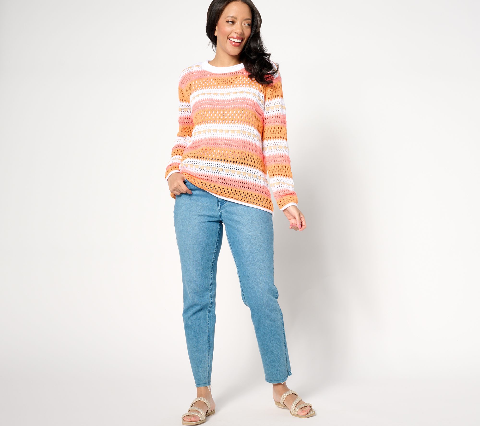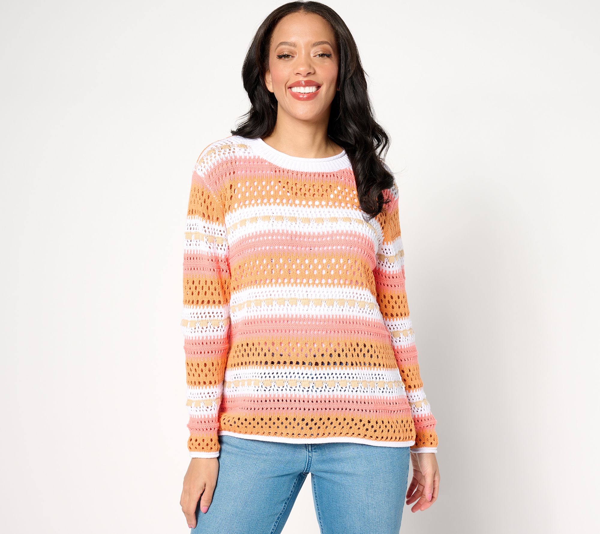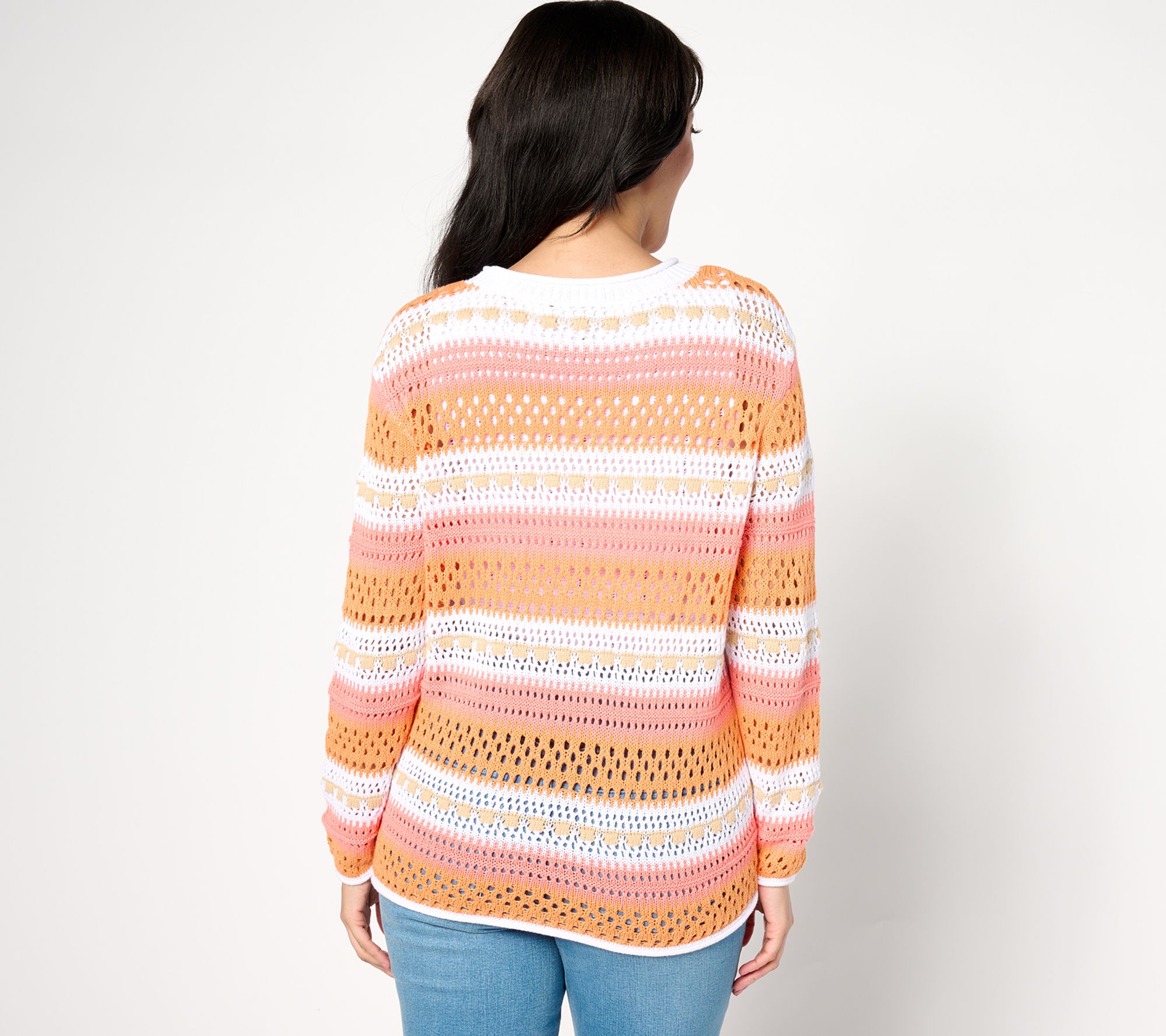 Sweater weather: summer edition! An airy open knit -- that's perfect for layering over a bare-shouldered tank or lightweight tee -- takes the guesswork out of dressing for day-to-night adventures, breezy waterside locales, and air conditioned spaces. From the Joan Rivers Classics Collection®.
