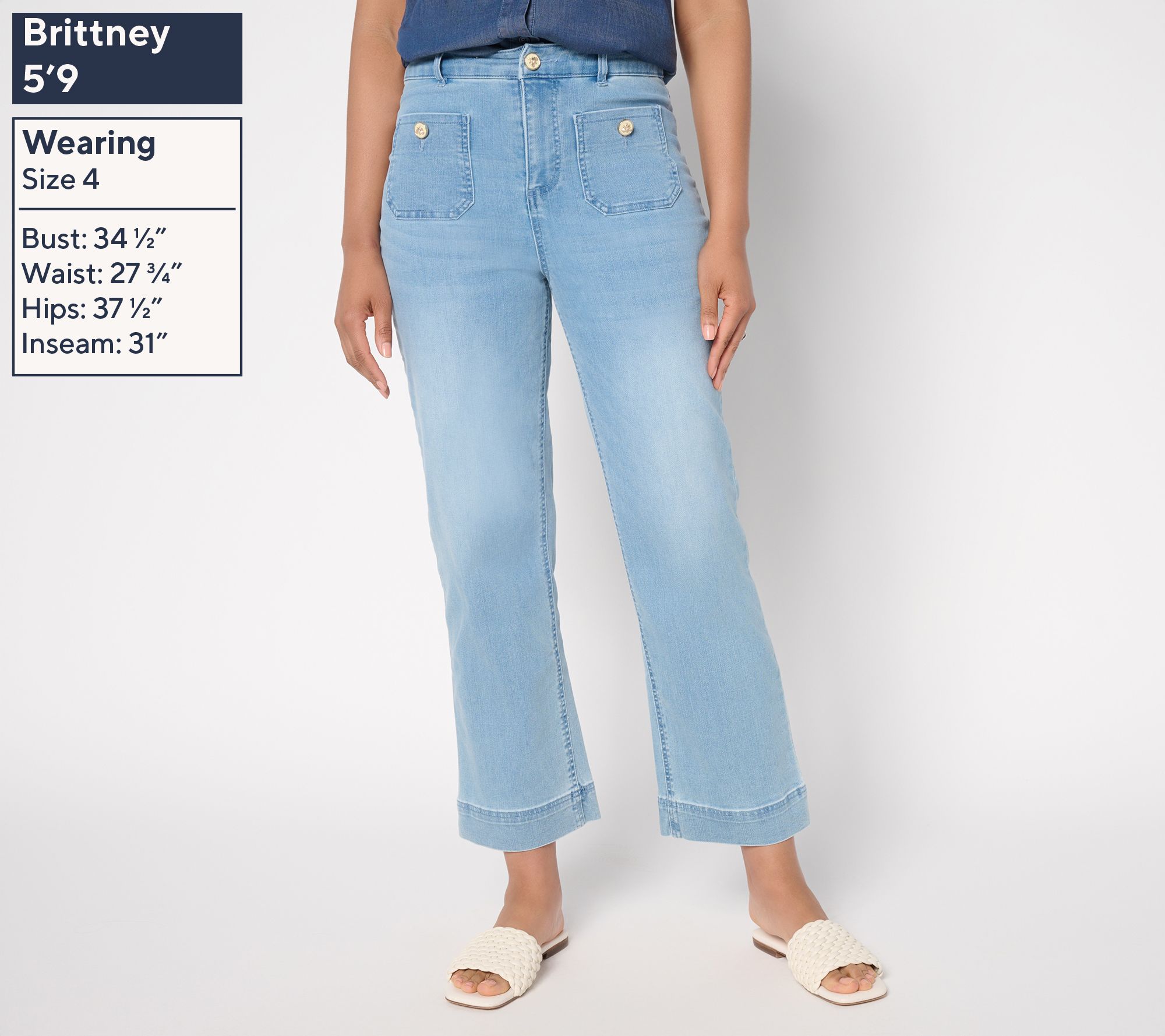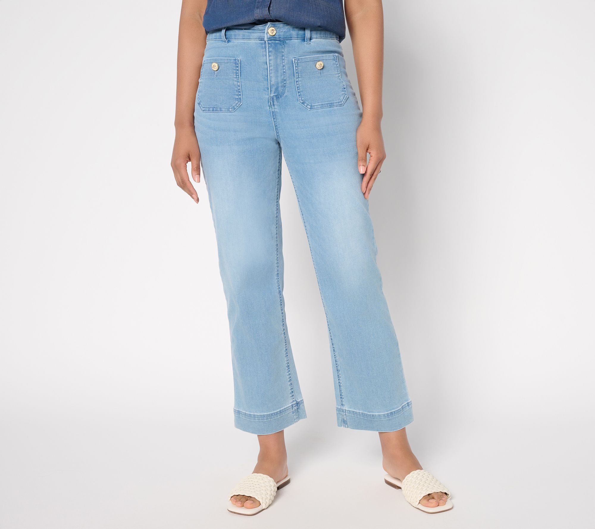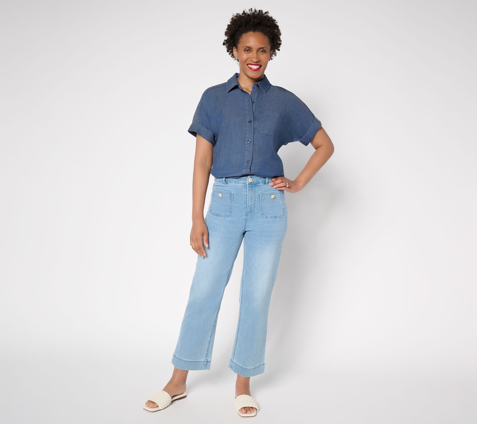 Refreshingly stylish for garden parties, brunch dates, or in-office days, these denim trousers blend a classic full leg with a vintage-y vibe -- and too-cute bee buttons! Style them with your favorite sandals or heels for an effortlessly chic look. From the Joan Rivers Classics Collection®.
