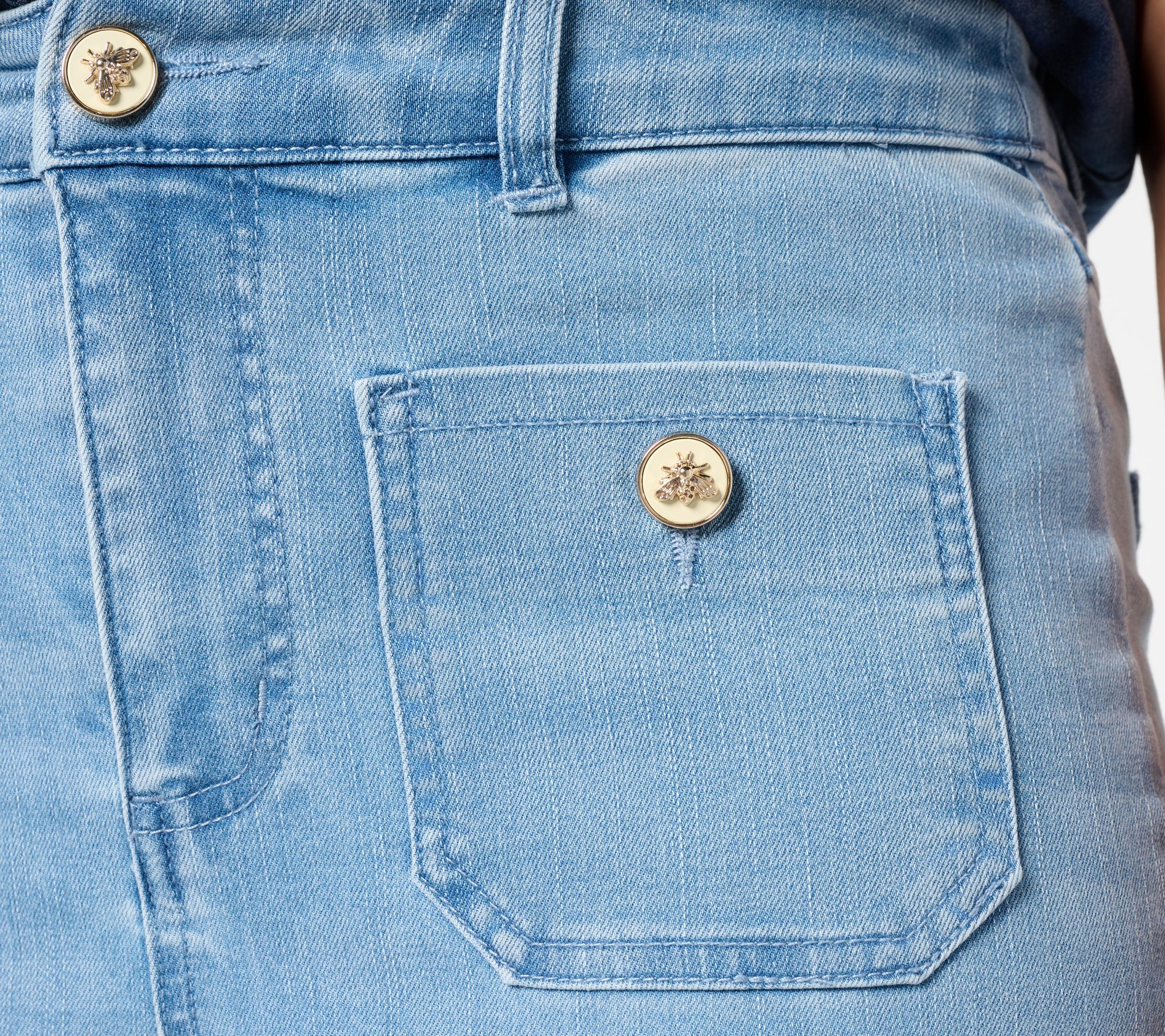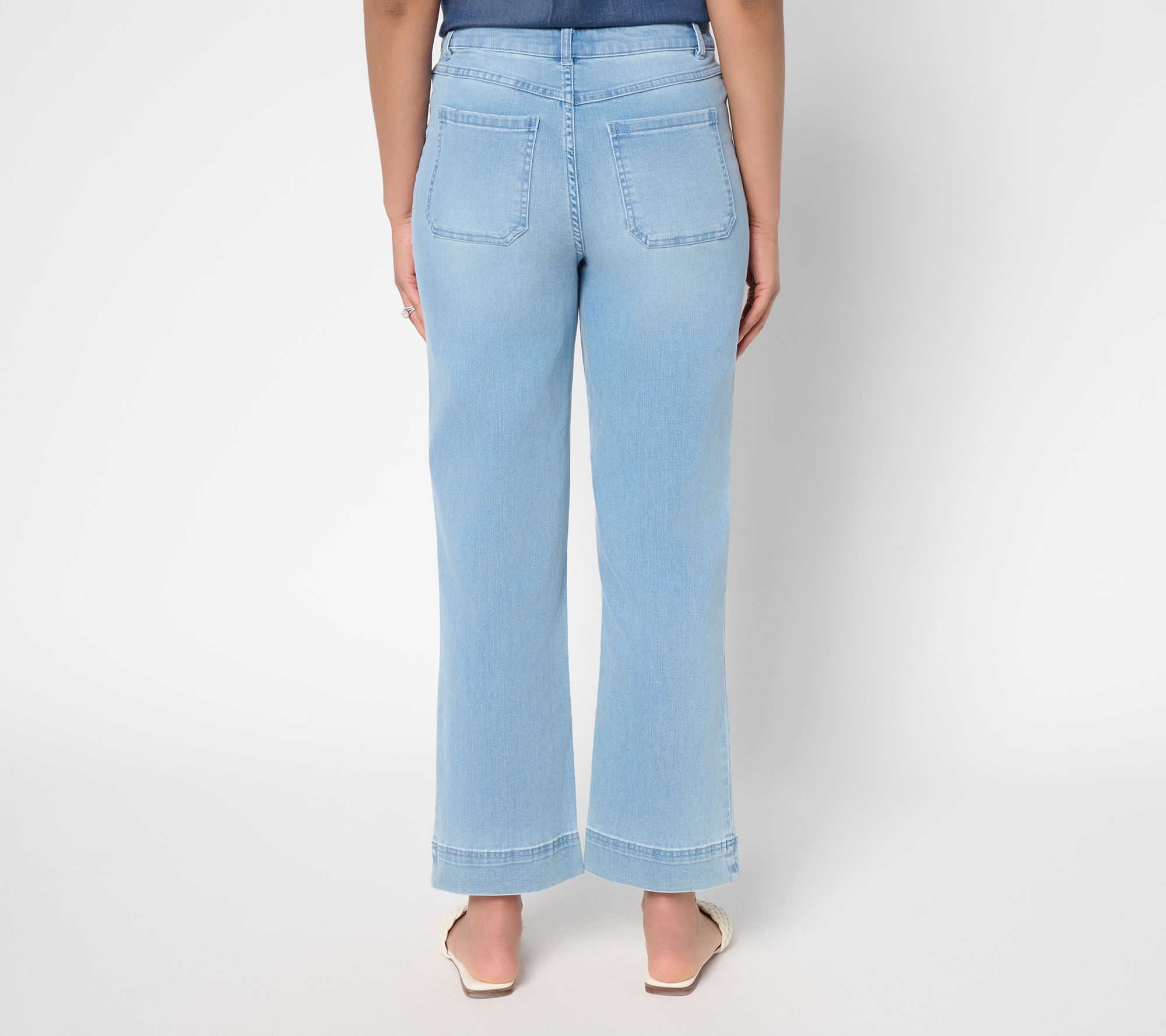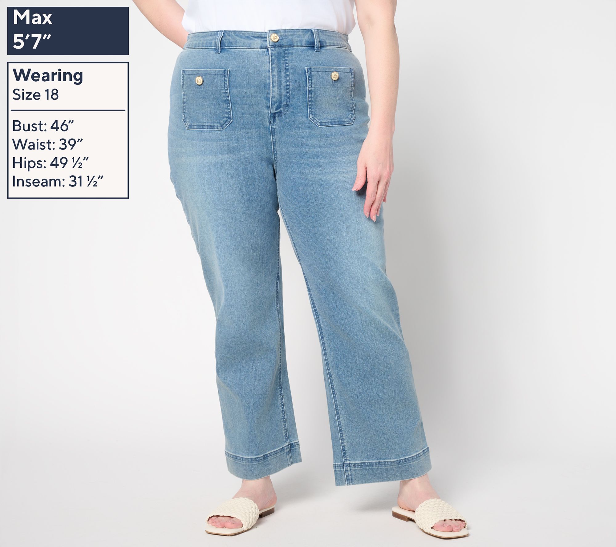 Refreshingly stylish for garden parties, brunch dates, or in-office days, these denim trousers blend a classic full leg with a vintage-y vibe -- and too-cute bee buttons! Style them with your favorite sandals or heels for an effortlessly chic look. From the Joan Rivers Classics Collection®.