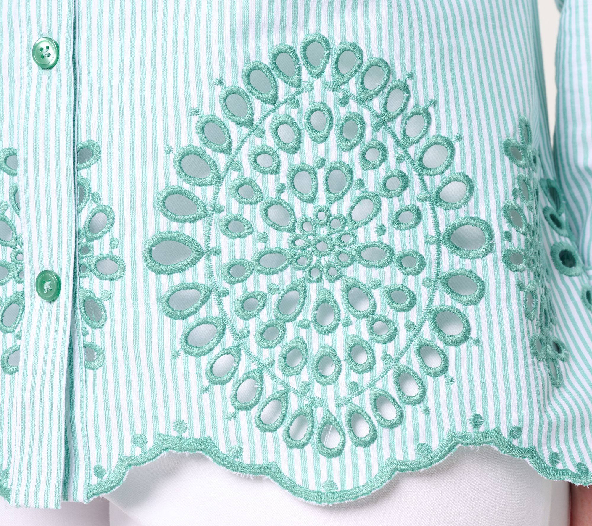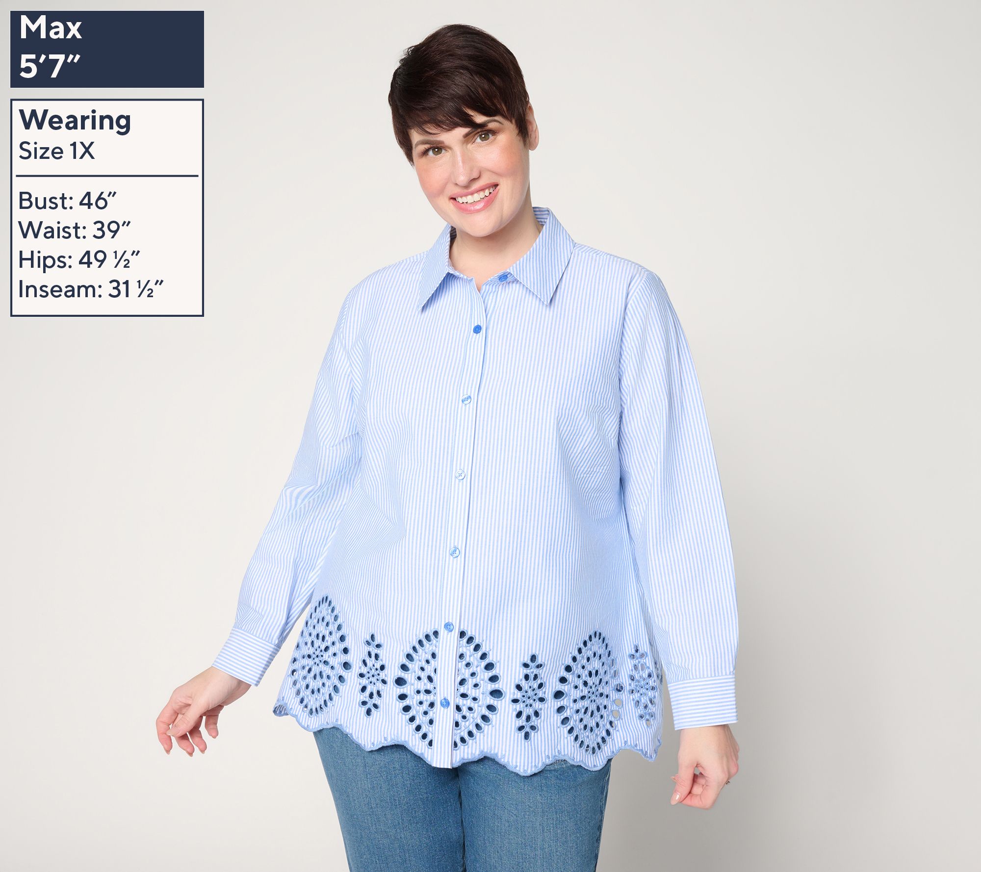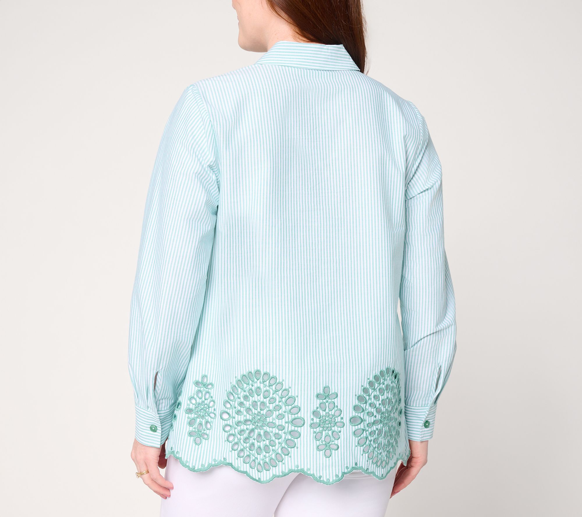 All eyes on eyelet! Perennially pretty embroidery puts a fresh stamp on a Modern Fit tunic. See how the crisp poplin shirt complements white pants, dress trousers, and your daily denim. From the Joan Rivers Classics Collection®.