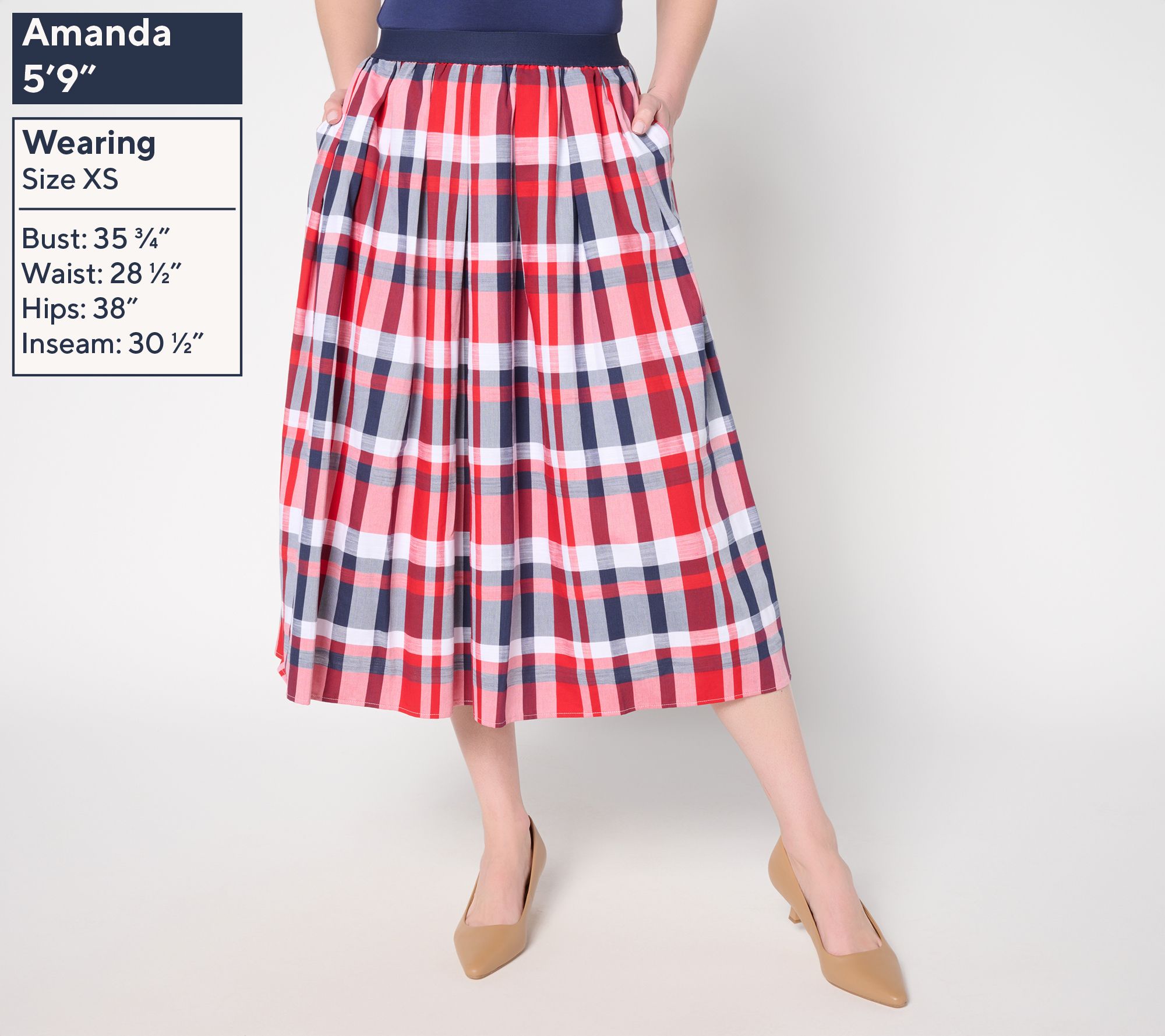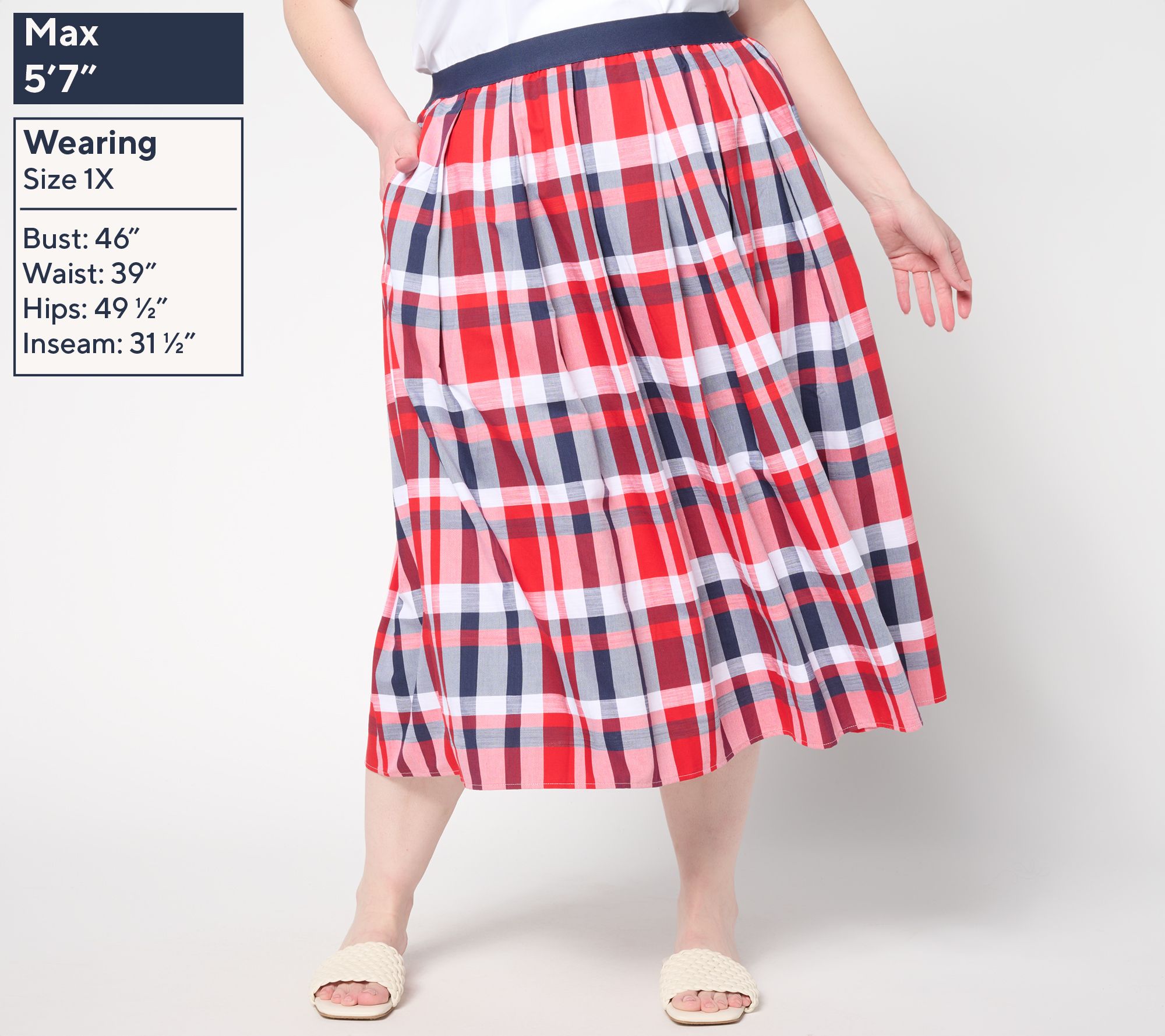 • Features: madras plaid, midi length, on-seam pockets, encased elastic waistband, shirring around entire skirt