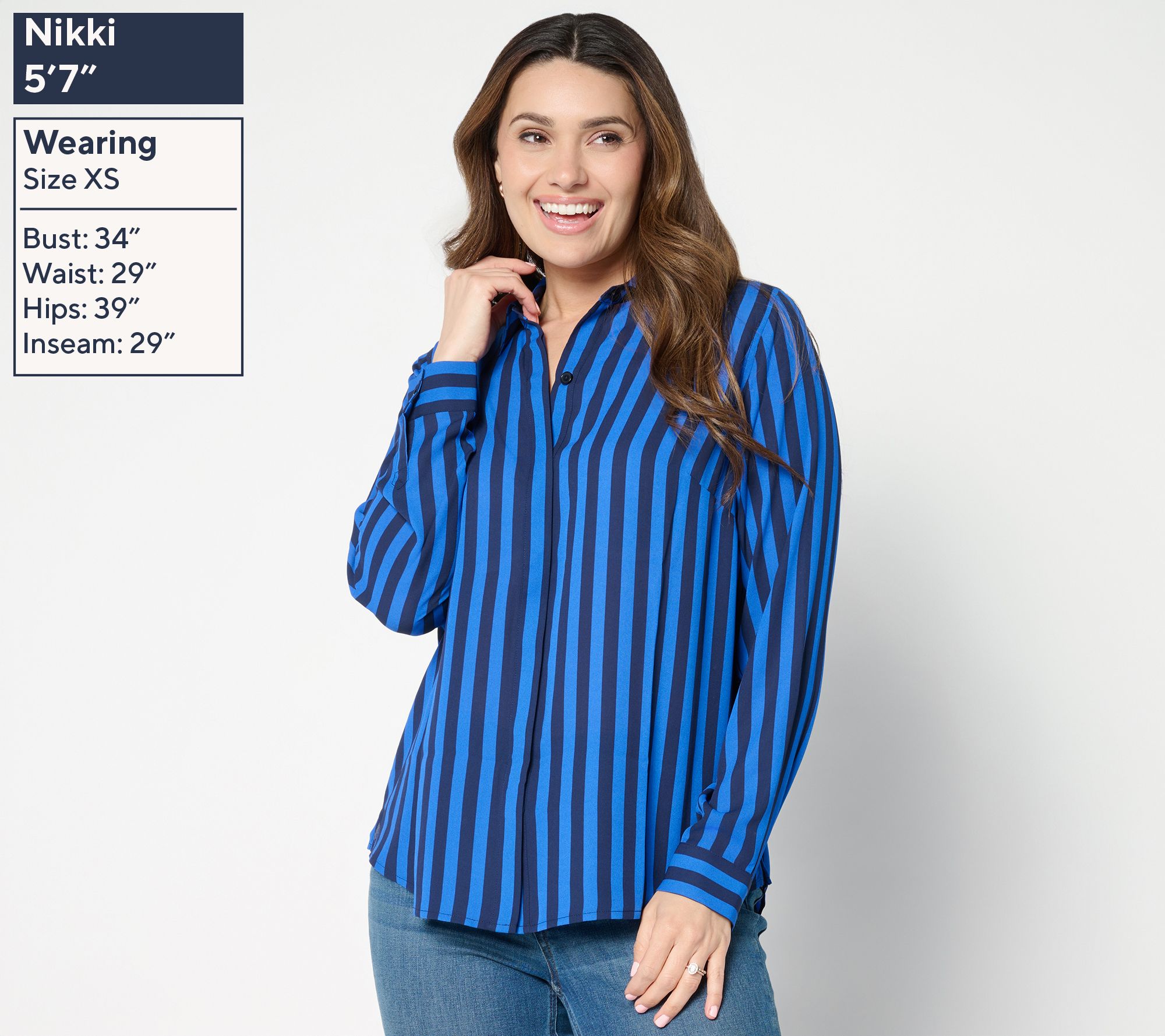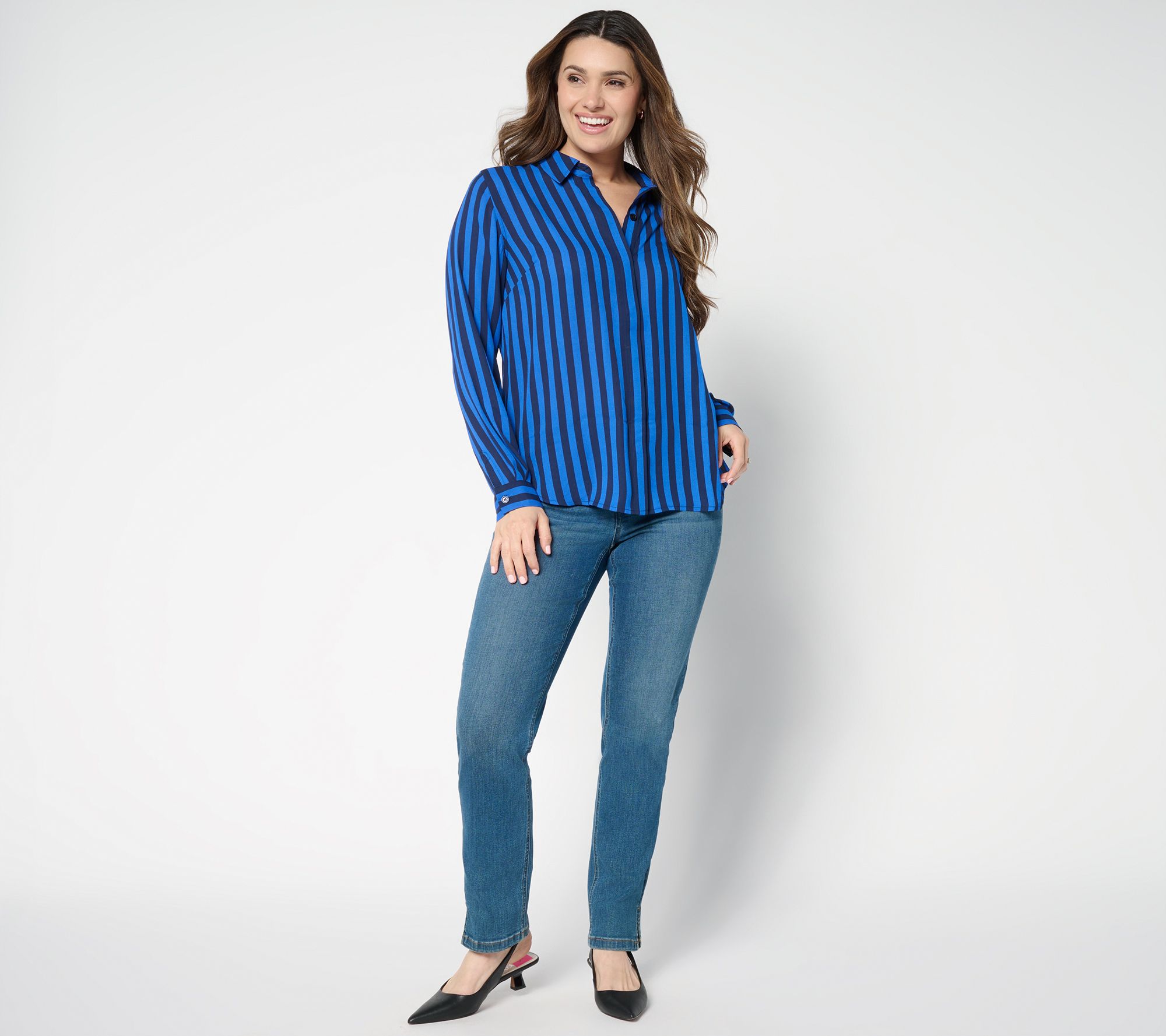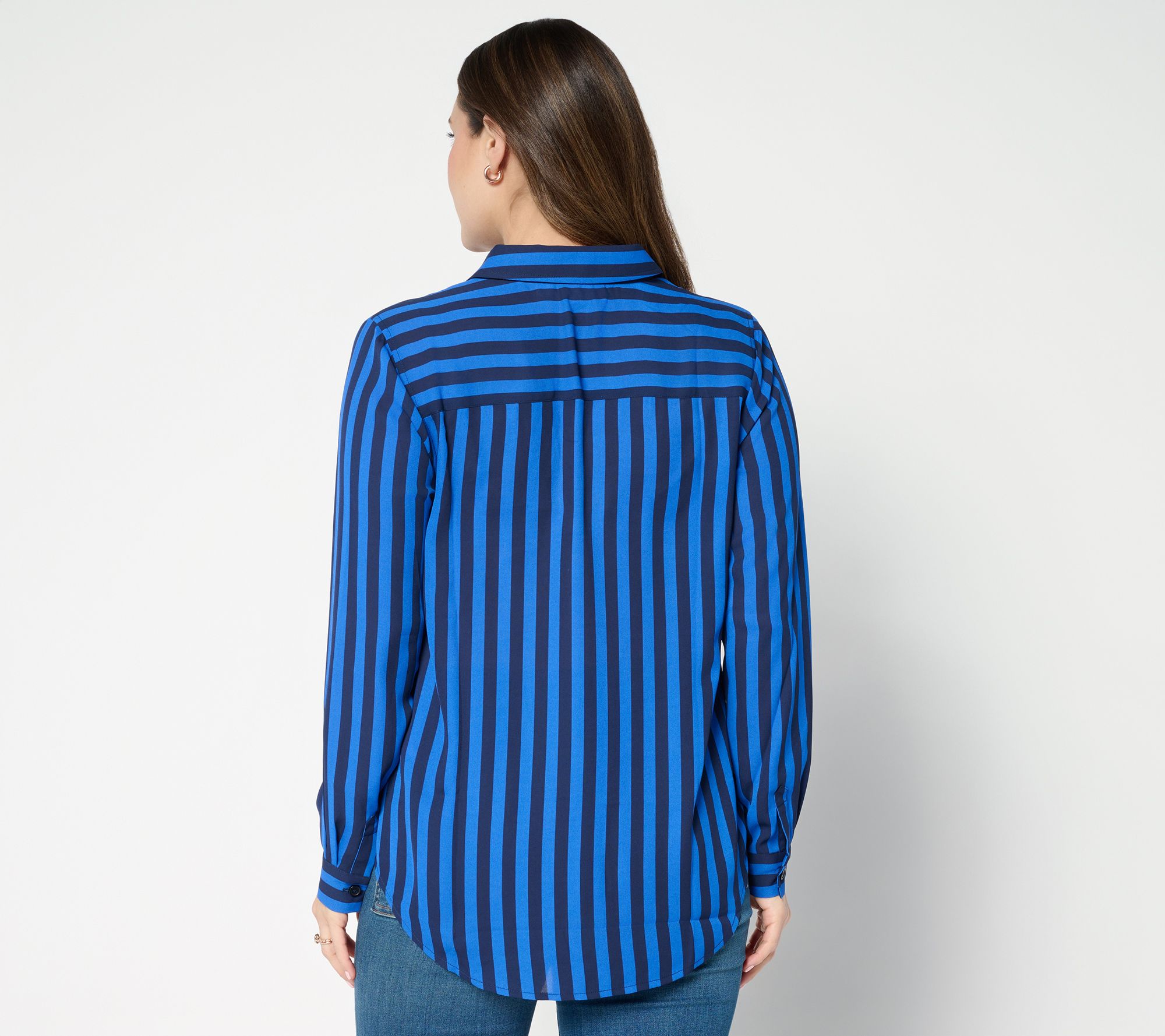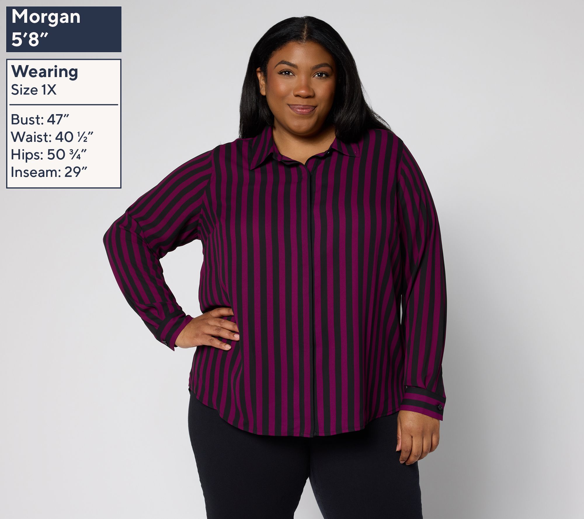 Start your day in crisp confident style thanks to this striped woven blouse, blending bold print and flowing Georgette for a polished look. The hidden button placket and shirt-tail hem add a refined touch, while bust darts and side slits offer comfort and easy movement as well as a flattering fit. From Joan Rivers Classics Collection®.