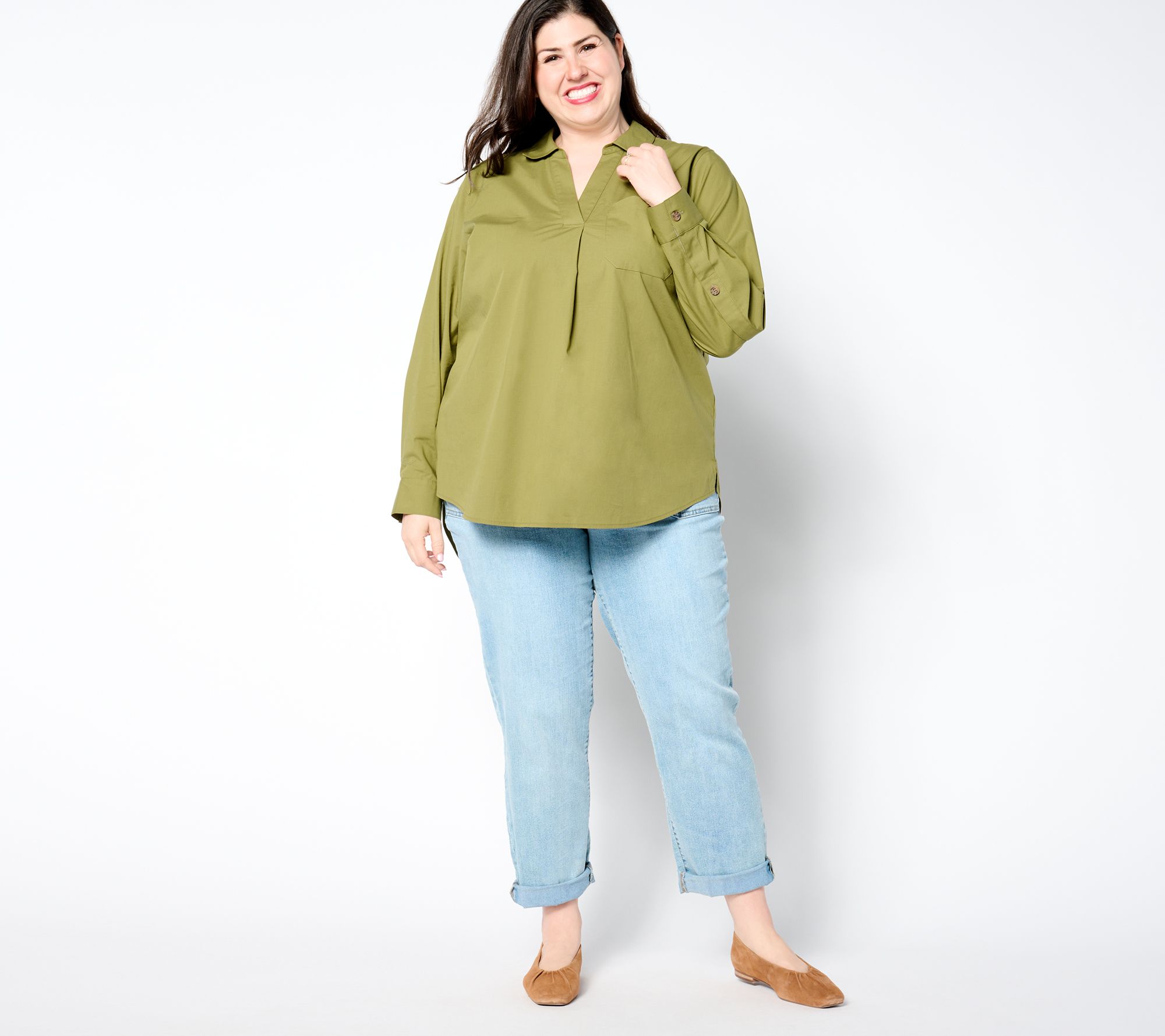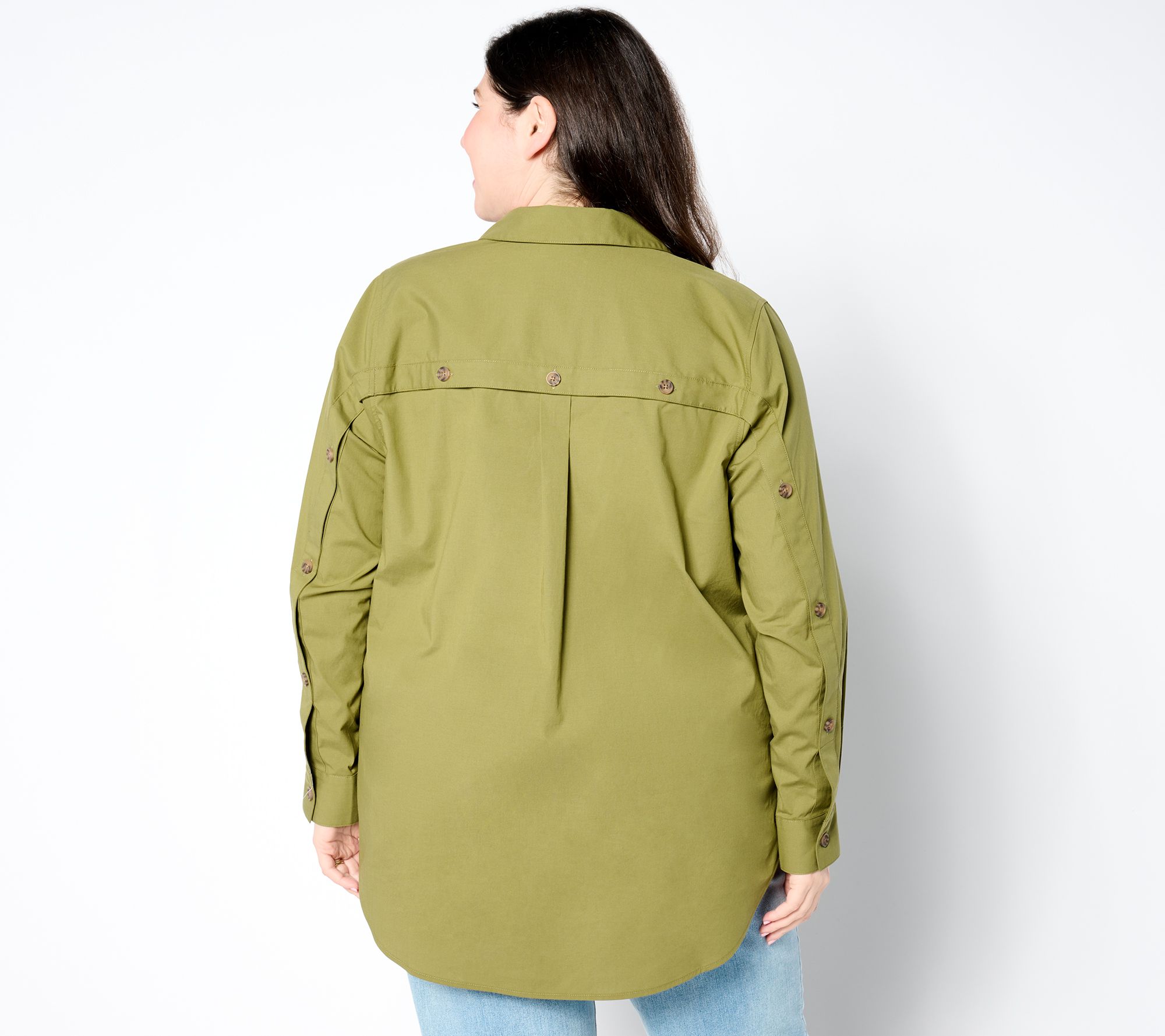 Business in the front. And business in the back! This stretch-woven pullover updates an everyday go-to with office-chic button-back details and a hi-low hem. From the Joan Rivers Classics Collection®.