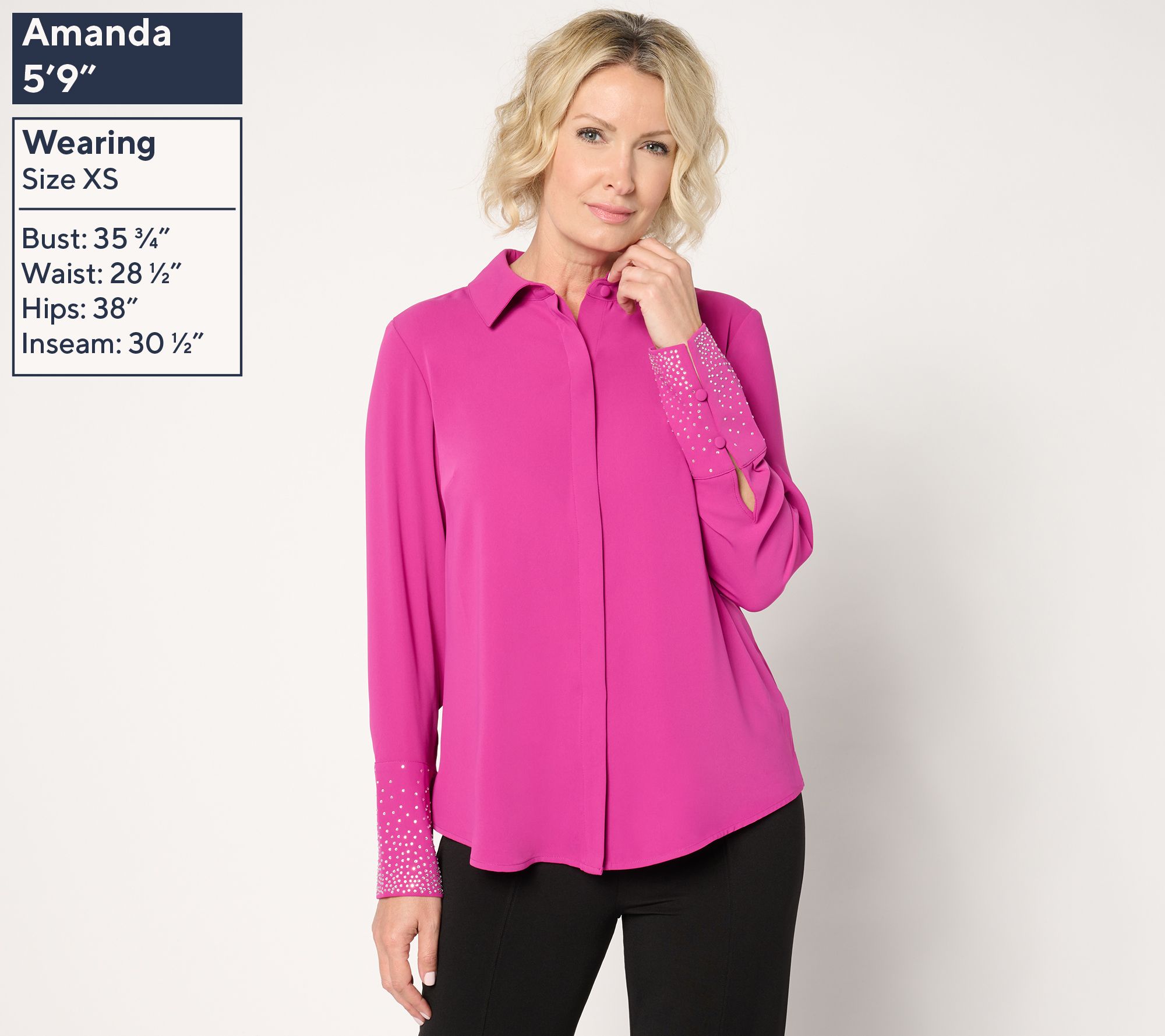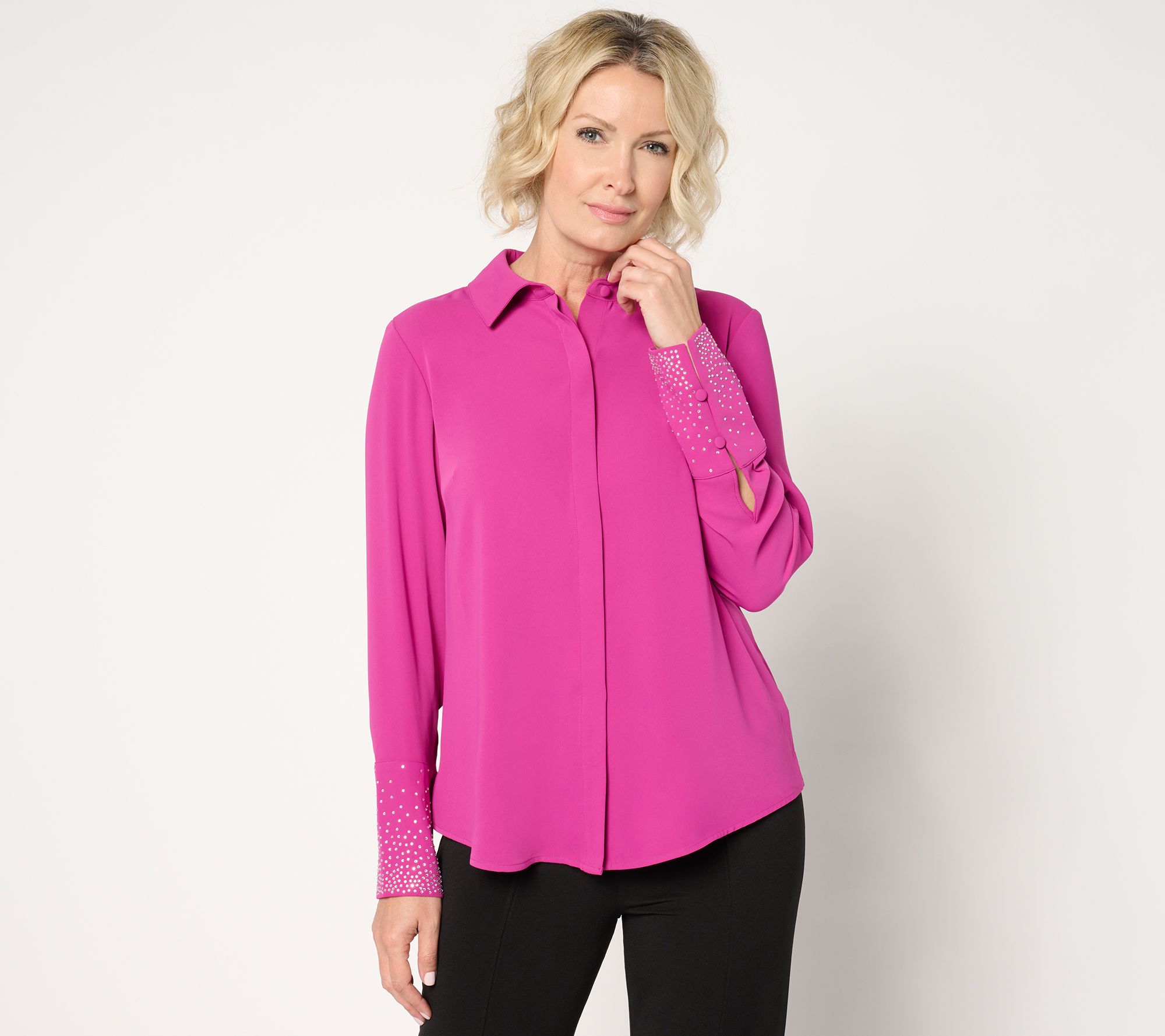 "As Is" Joan Rivers Red Carpet Crystal Button Front Long Slv Blouse
