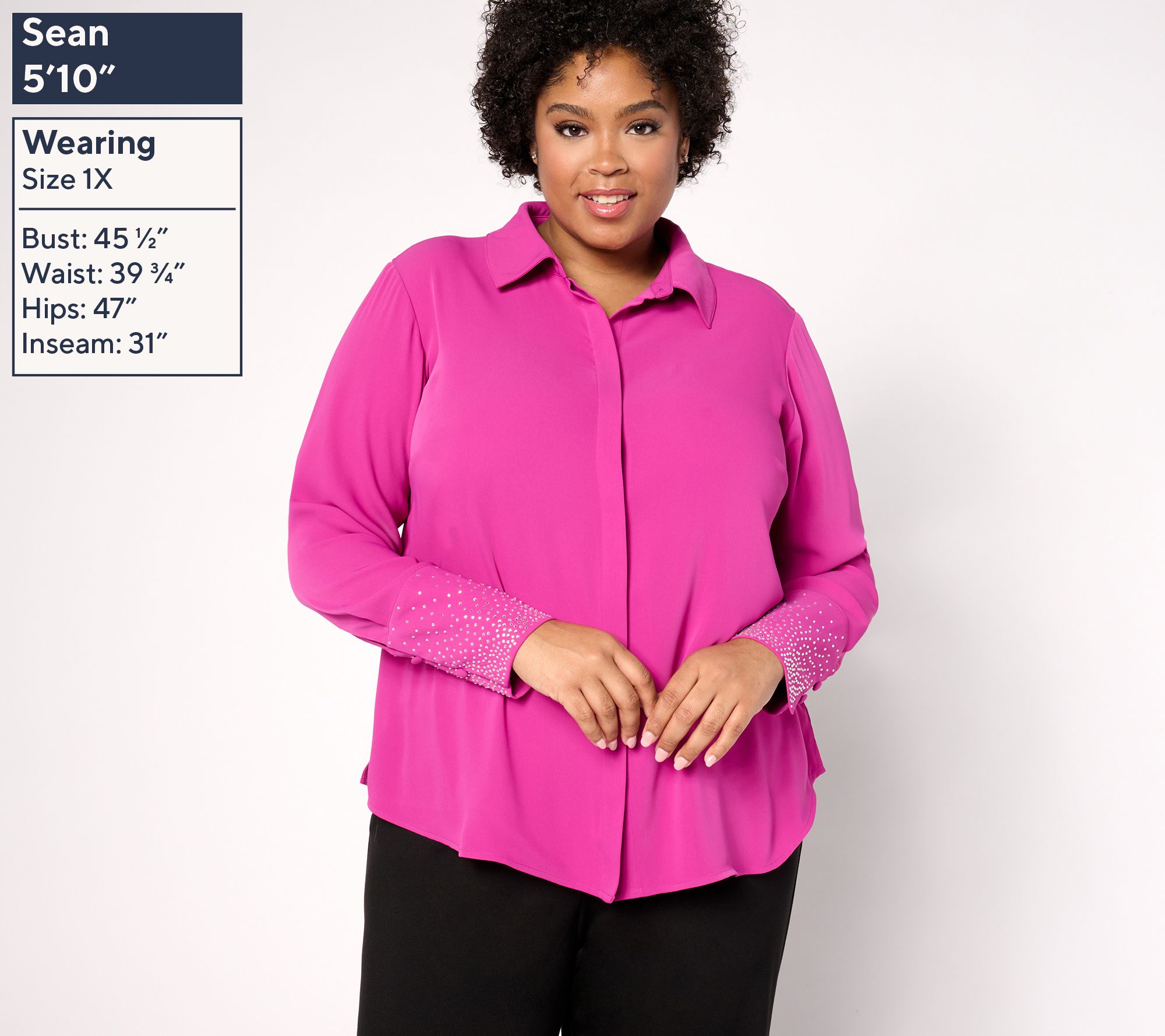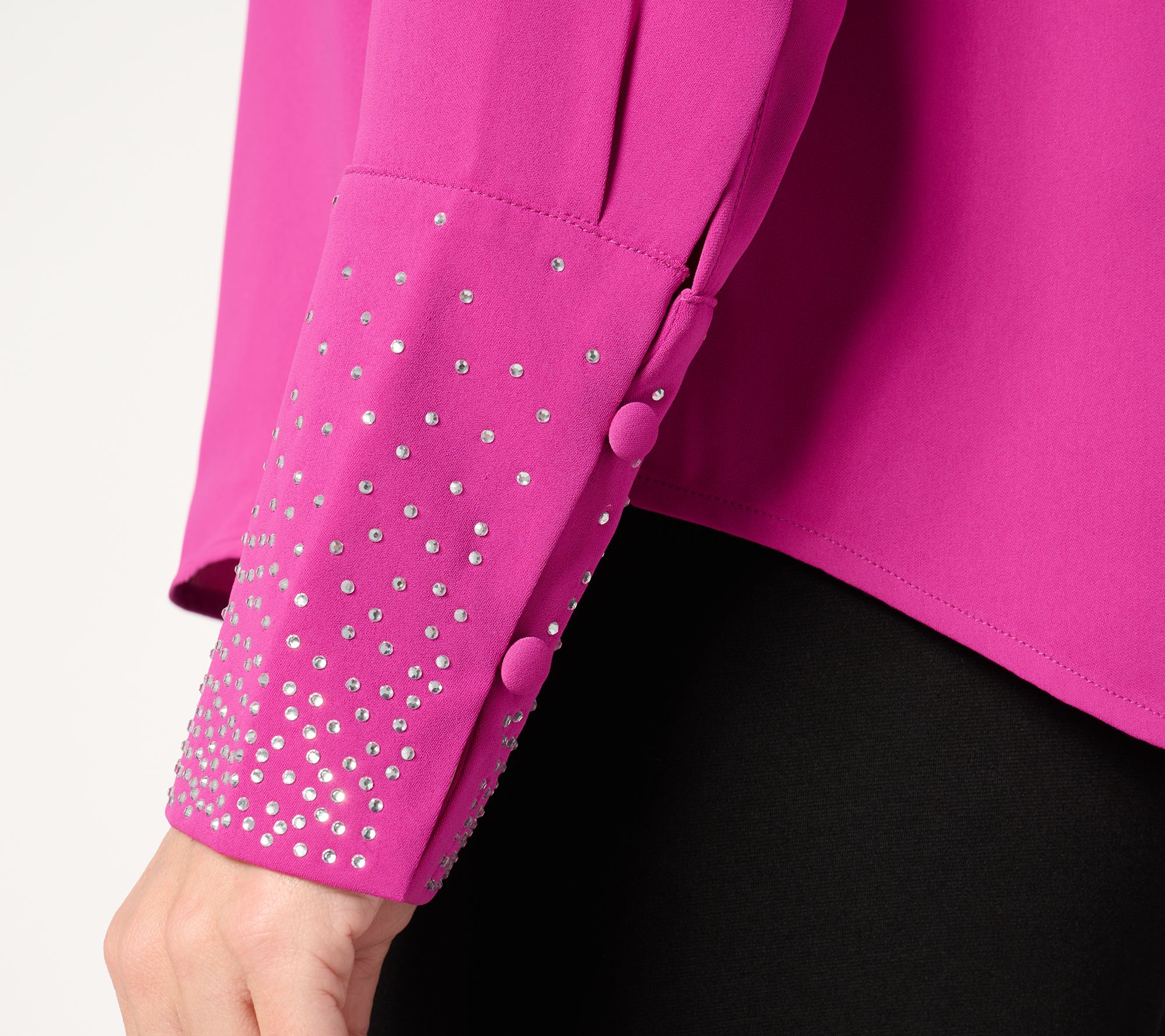 • Features: novelty crystal button front, long sleeves, cuffs with jewel details, hidden placket with functional button closure, side slits, shirttail hem