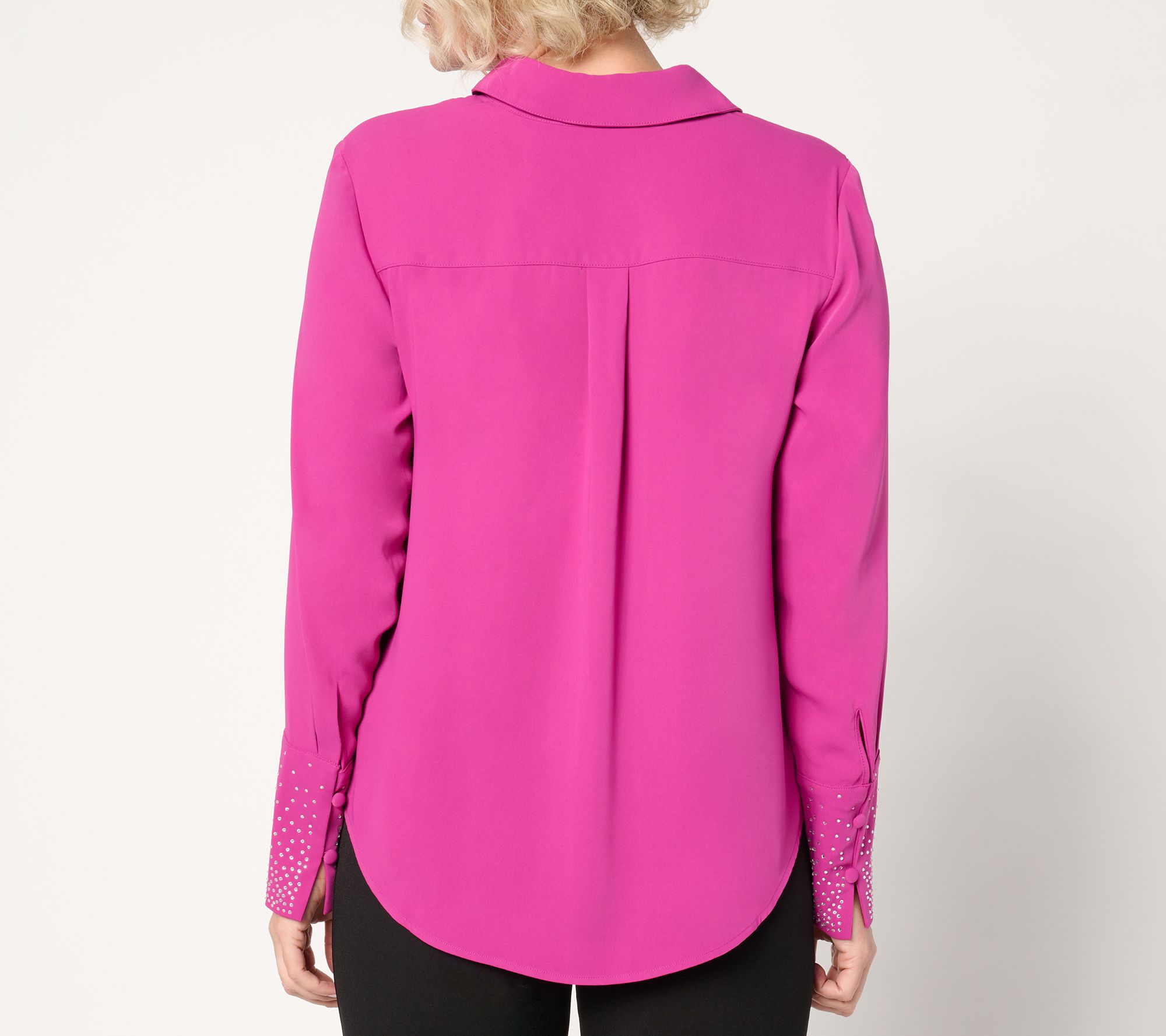 Ready to shine? Slip into this stylish blouse and take your look to the next level. Perfect for glamorous occasions or even a sophisticated dinner date, this long-sleeve beauty impresses with a bejeweled detail on the cuffs and a chic shirttail hem. From the Joan Rivers Classics Collection®.