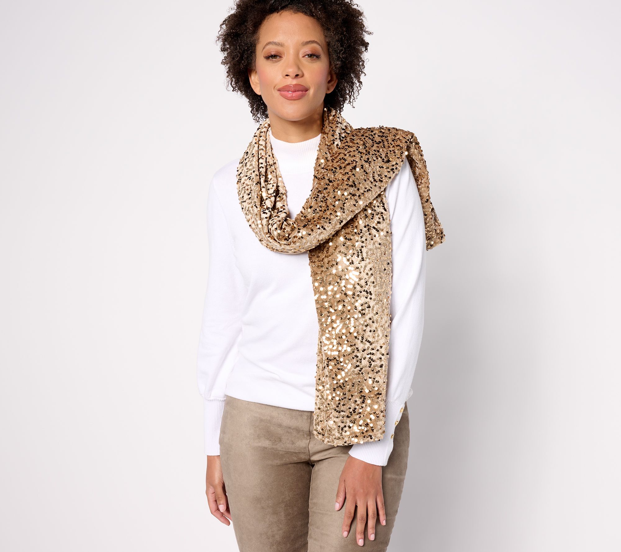 Shimmery, velvety, and beautifully crafted, this reversible sequined scarf is right at home on the red carpet -- or any event you're attending! Also fabulous with jeans and a tee when you're going for a low-key glam vibe. From the Joan Rivers Classics Collection®.