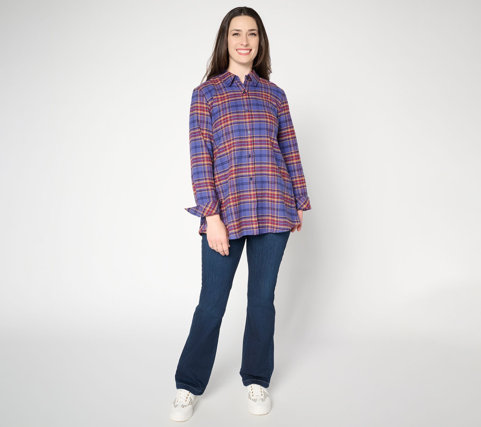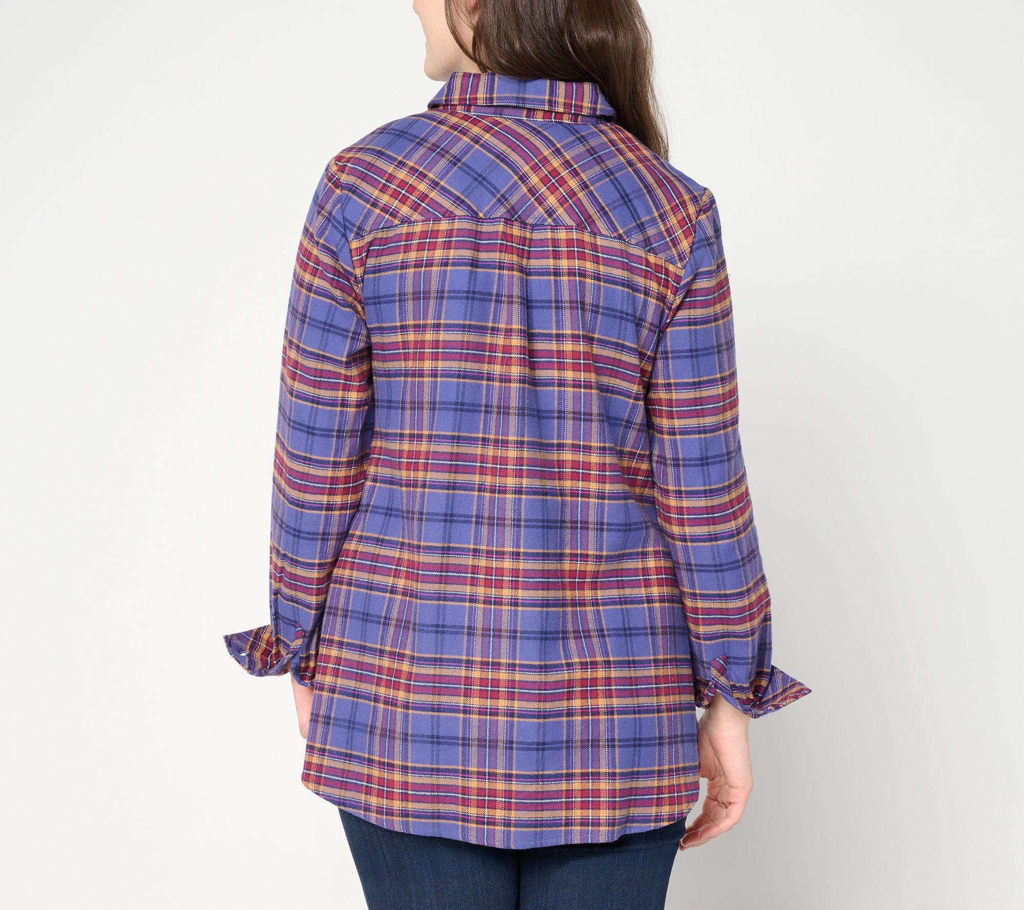 A day full of errands feels instantly more inviting with this soft brushed flannel shirt waiting in the wings. The swing silhouette, functional buttons on the side seams, and shirttail hem add to its ease and casual aesthetic, perfect for busy days when your agenda is hurried (but your look doesn't have to be). From the Joan Rivers Classic Collection®.