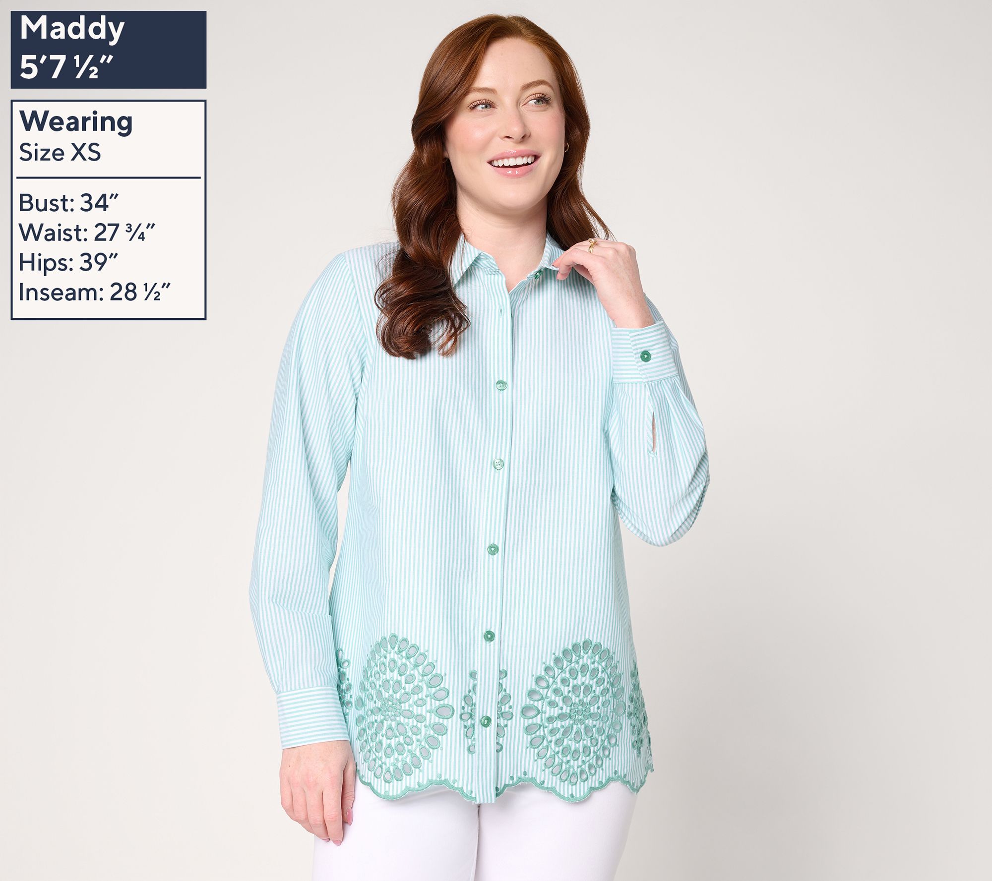 All eyes on eyelet! Perennially pretty embroidery puts a fresh stamp on a Modern Fit tunic. See how the crisp poplin shirt complements white pants, dress trousers, and your daily denim. From the Joan Rivers Classics Collection®.
