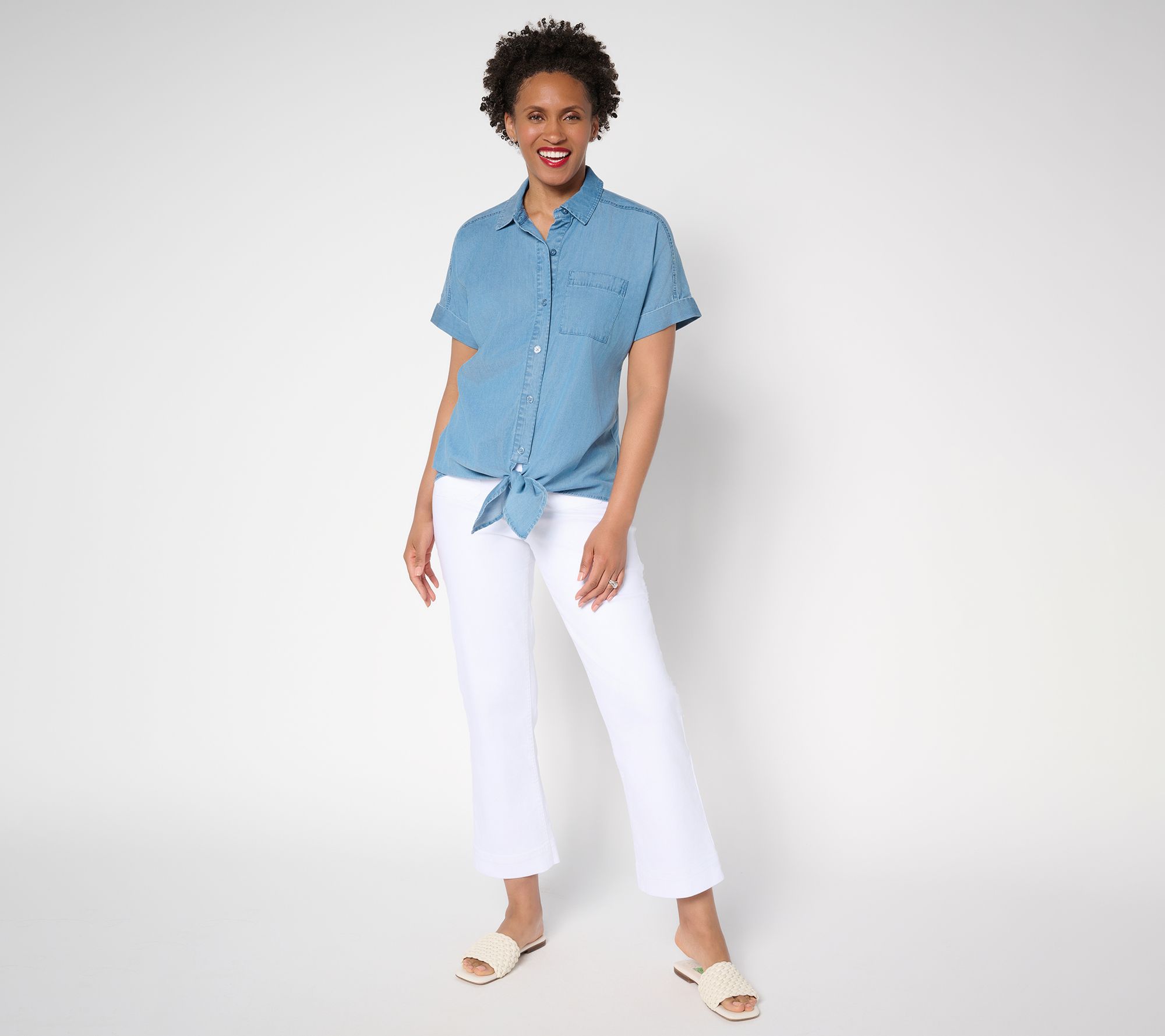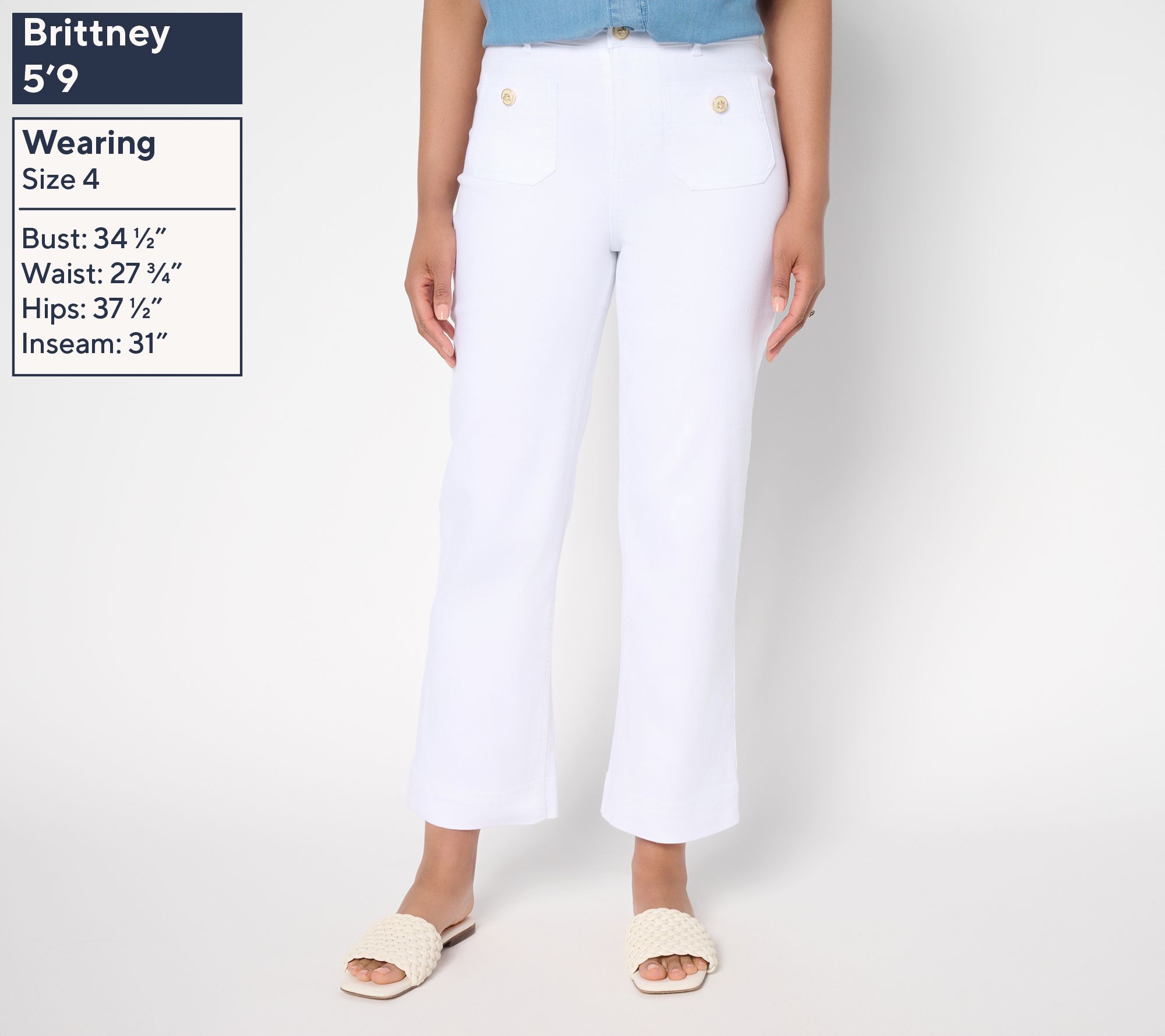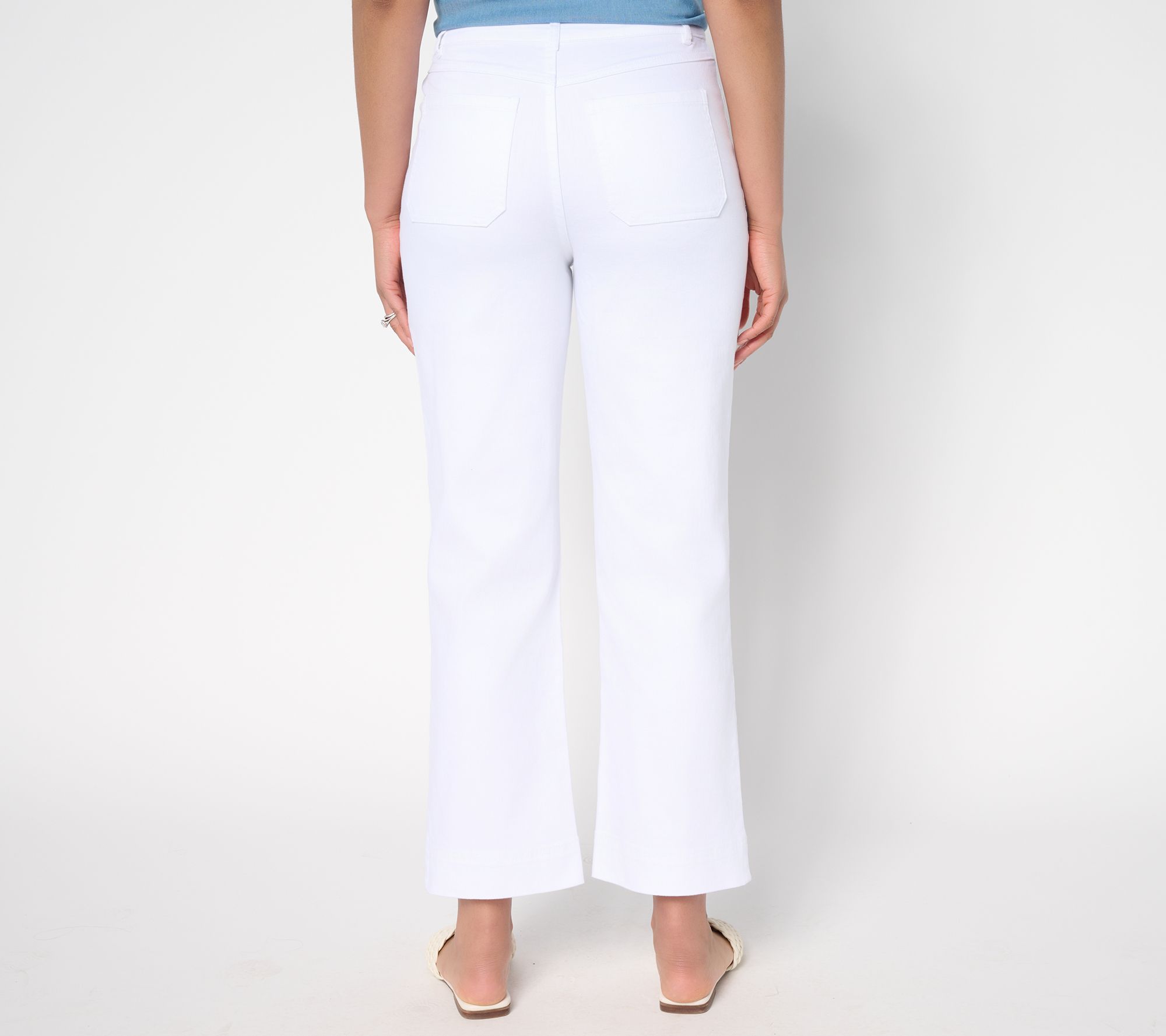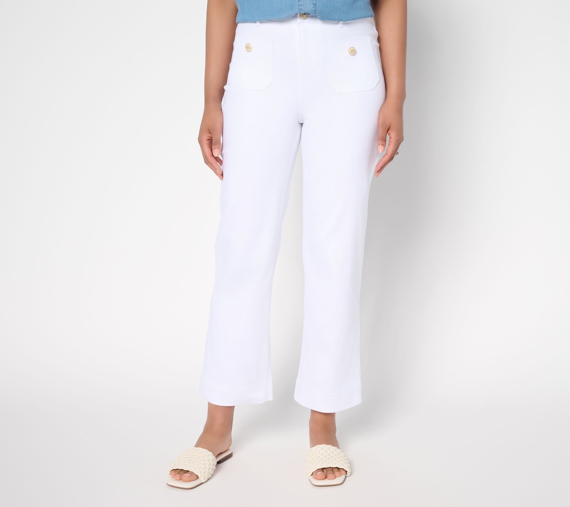 Refreshingly stylish for garden parties, brunch dates, or in-office days, these denim trousers blend a classic full leg with a vintage-y vibe -- and too-cute bee buttons! Style them with your favorite sandals or heels for an effortlessly chic look. From the Joan Rivers Classics Collection®.