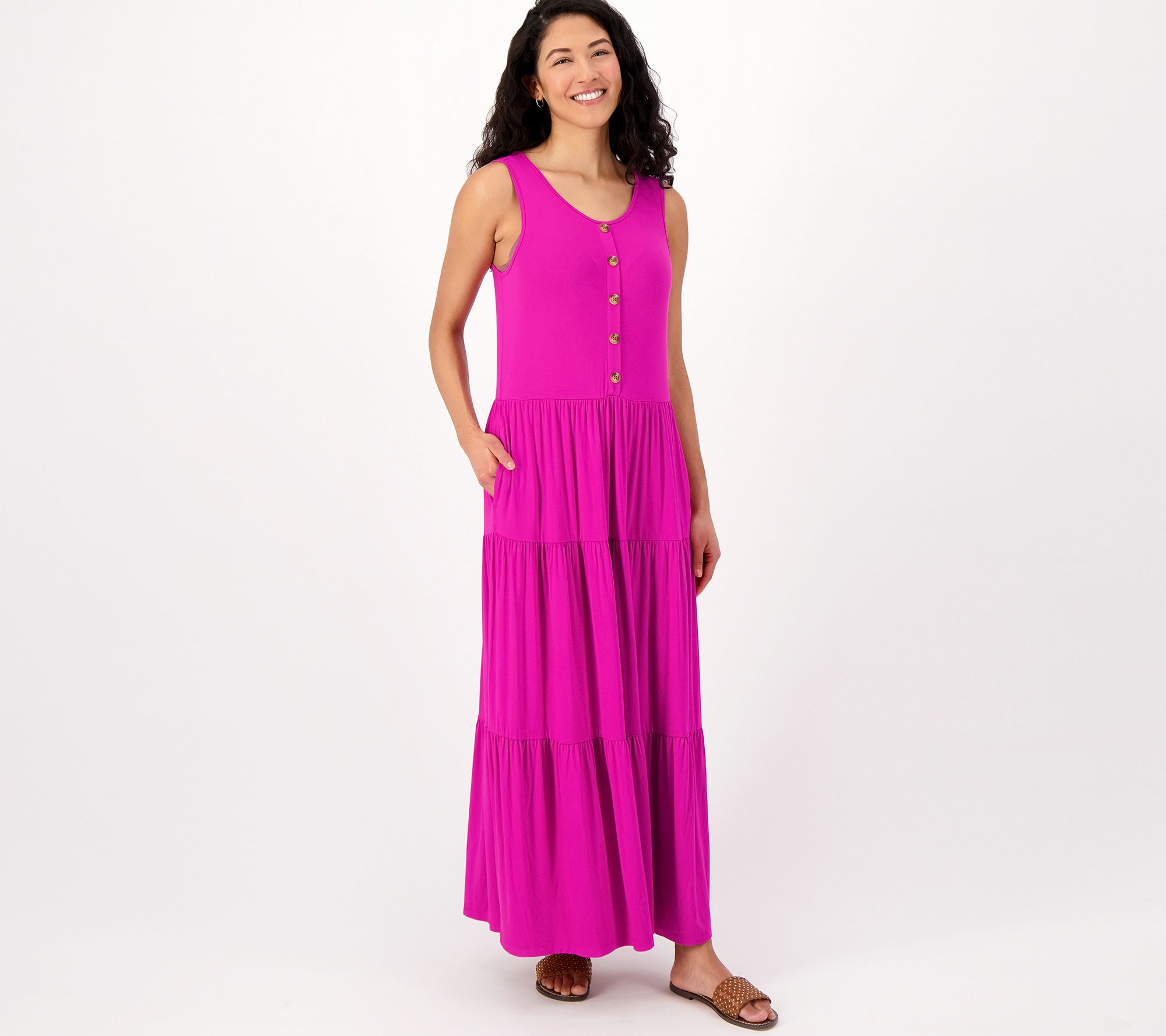 Your go-to look of the season, this tiered maxi dress puts casual, laid-back style at the forefront. Wear with slip-on sandals for an afternoon stroll through the farmer's market. From the Joan Rivers Classics Collection®.