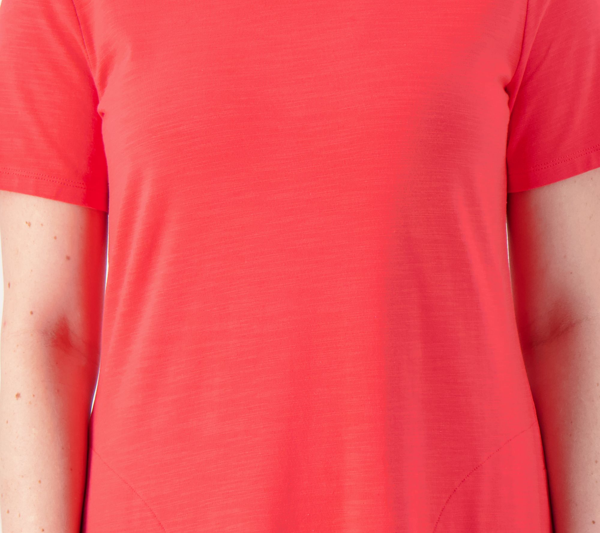 • Features: short sleeves, back strap, seam pockets, sharkbite hem
